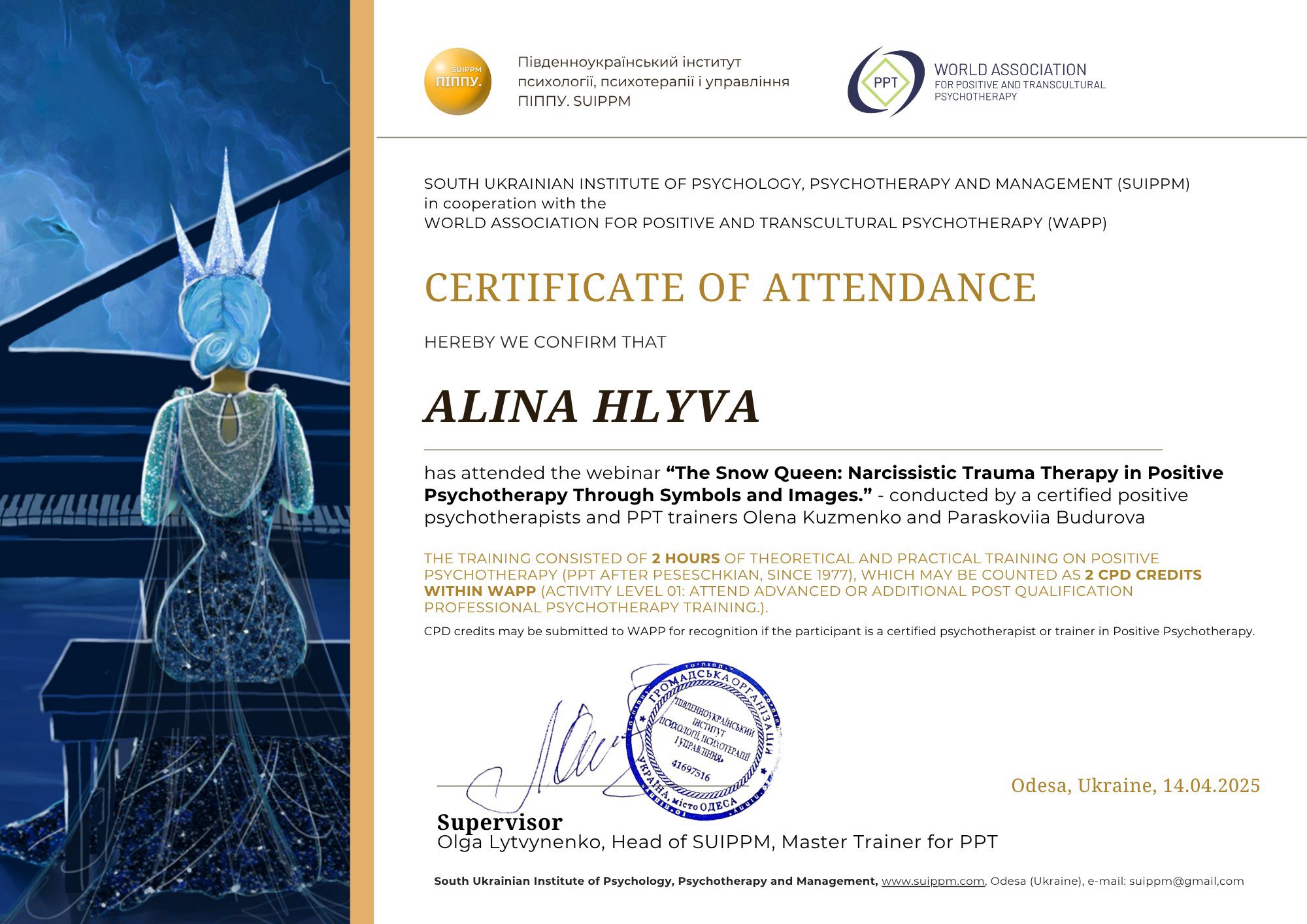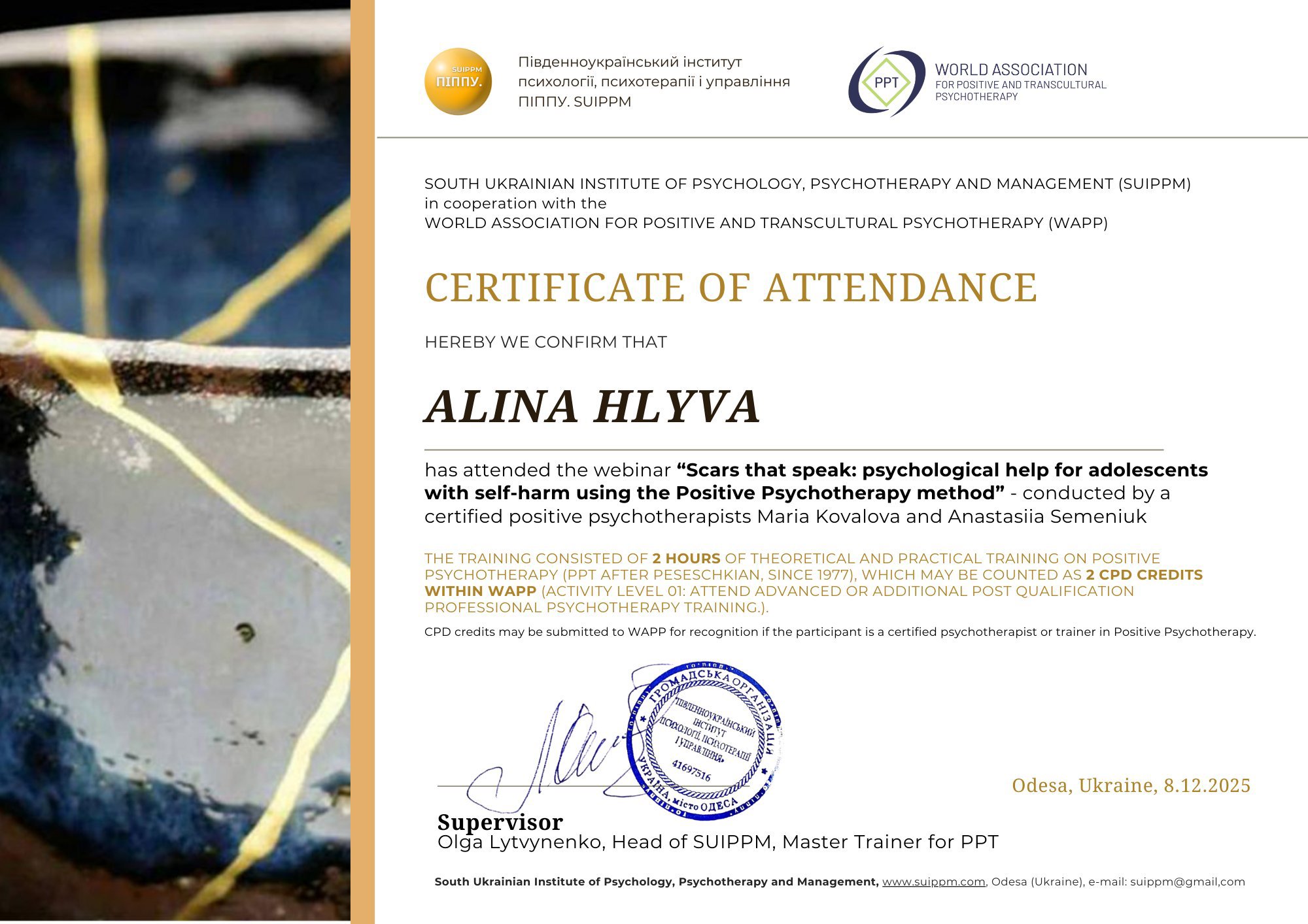 1. Південноукраїнський інститут психології, психотерапії та управління, сертифікат базового консультанта у методі позитивної та транскультуральної психотерапії;