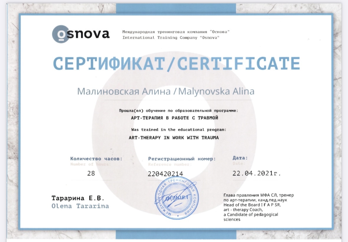 Маю магістра психології, вивчаю гештальт терапію (сертифікація в цьому році ) , символдраму, вивчала арт терапію в роботі з травмою