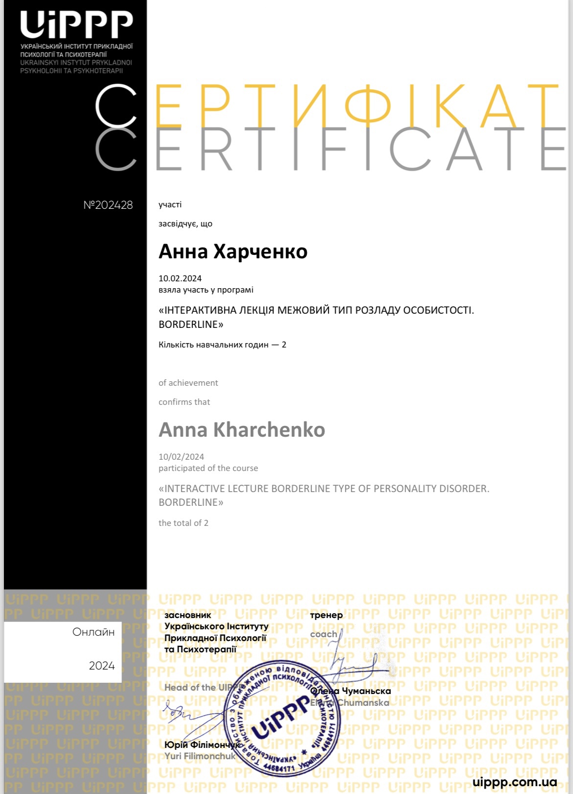 Маю спеціалізацію “ Робота Гештальт терапевта з психопатологічною адаптацією»