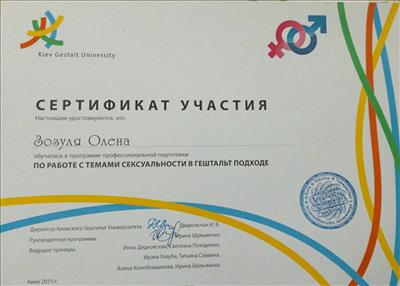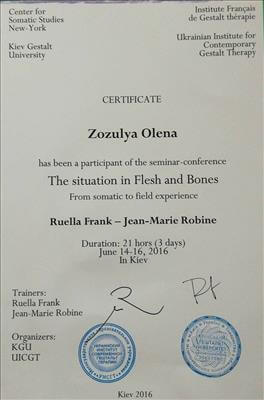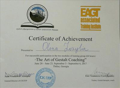 Гештальт-терапії я навчалася і навчаюсь у Ніфонта Долгополова (Росія), Джея Левіна (США), Пітера Філліпсона (Великобританія), Маргерити Спанієло Лобб (Італія), Анни Танальської (Польща) та інших чудових викладачів