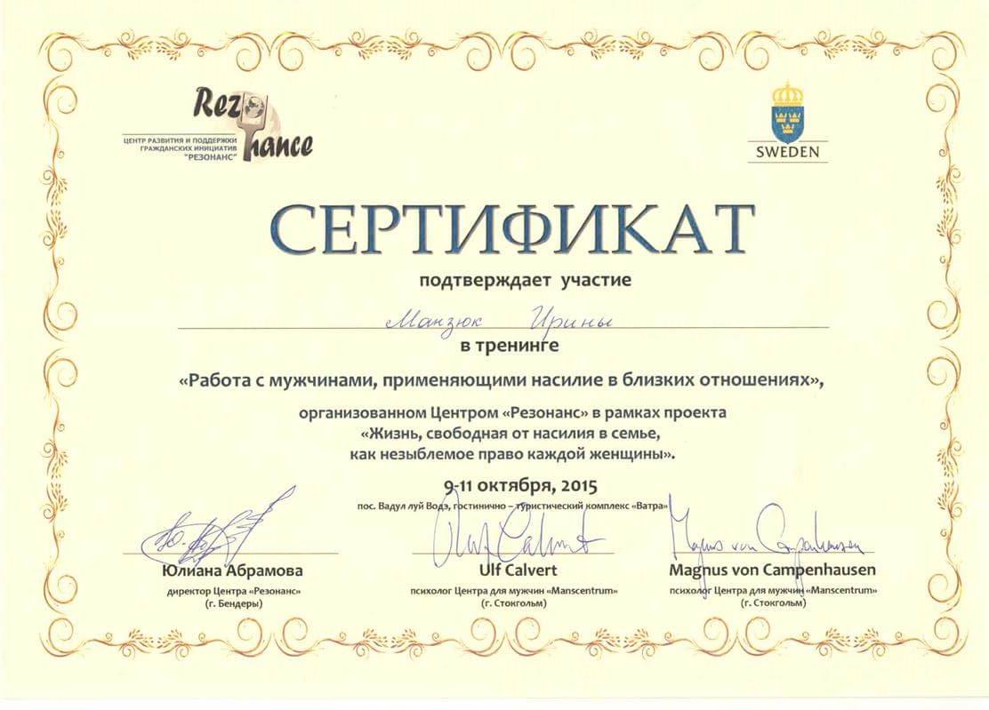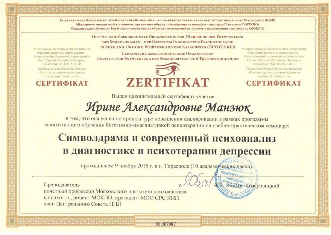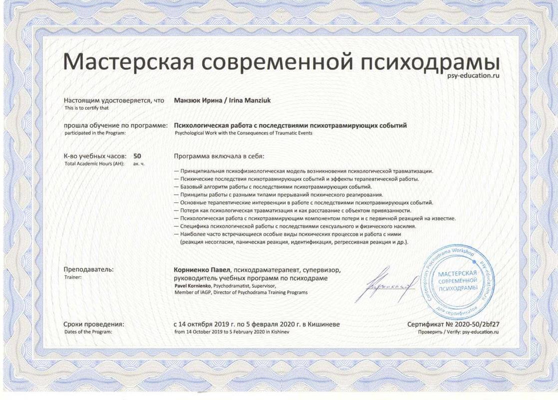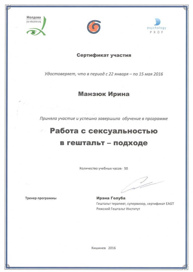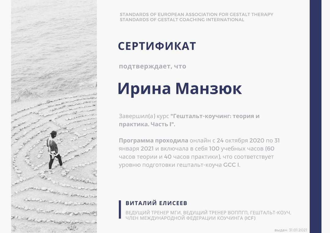 Добрий день. Мене звуть Ірина Манзюк. Мені 44 роки. У шлюбі. Є діти. Люблю собак. У 2005 році здобула базову освіту за спеціальністю "педагог-психолог". Одразу після закінчення університету працювала психологом у гімназії. У 2009 році ухвалила рішення продовжувати навчання в галузі немедичної психотерапії. На сьогоднішній день маю додаткову освіту в галузі гештальт-терапії, психодрами, транзактного аналізу та продовжую розвиватися у цих напрямках. Працюю здебільшого з темами стосунків, особистісного зростання, сумування та втрата, травматичний досвід. Вважаю, що людина має право вибирати жити так, як хоче і при цьому не залишатися на самоті. Тому переконана, що вміння вибудовувати контакт зі світом та людьми є одним із основних завдань гармонійного існування.