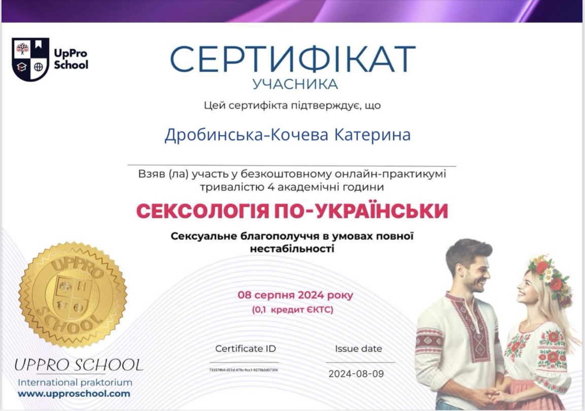 Маю також 1 вищу освіту, за якою я магістр управління персоналом, тому робота з людьми це моя любов і пристрасть. На наших консультаціях ти можеш бути собою, знати, що тебе не засудять, а приймуть, не будуть давати поради, але допоможуть шукати відповіді, не будуть казати яка ти класна, а допоможуть це нарешті відчути всередині себе.
