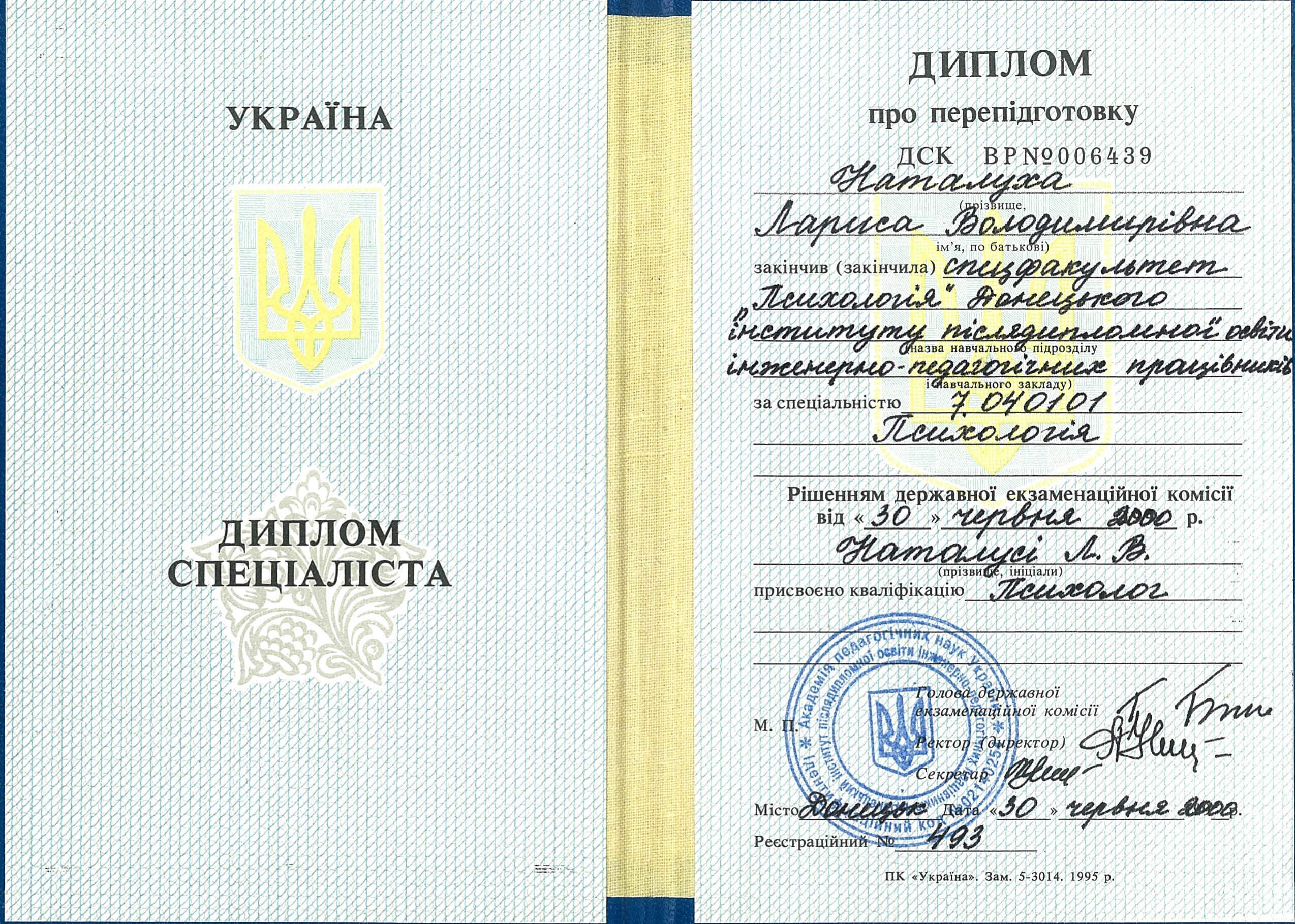 2000 – Донецький інститут післядипломної освіти інженерно-педагогічних працівників, спеціальність – психолог.