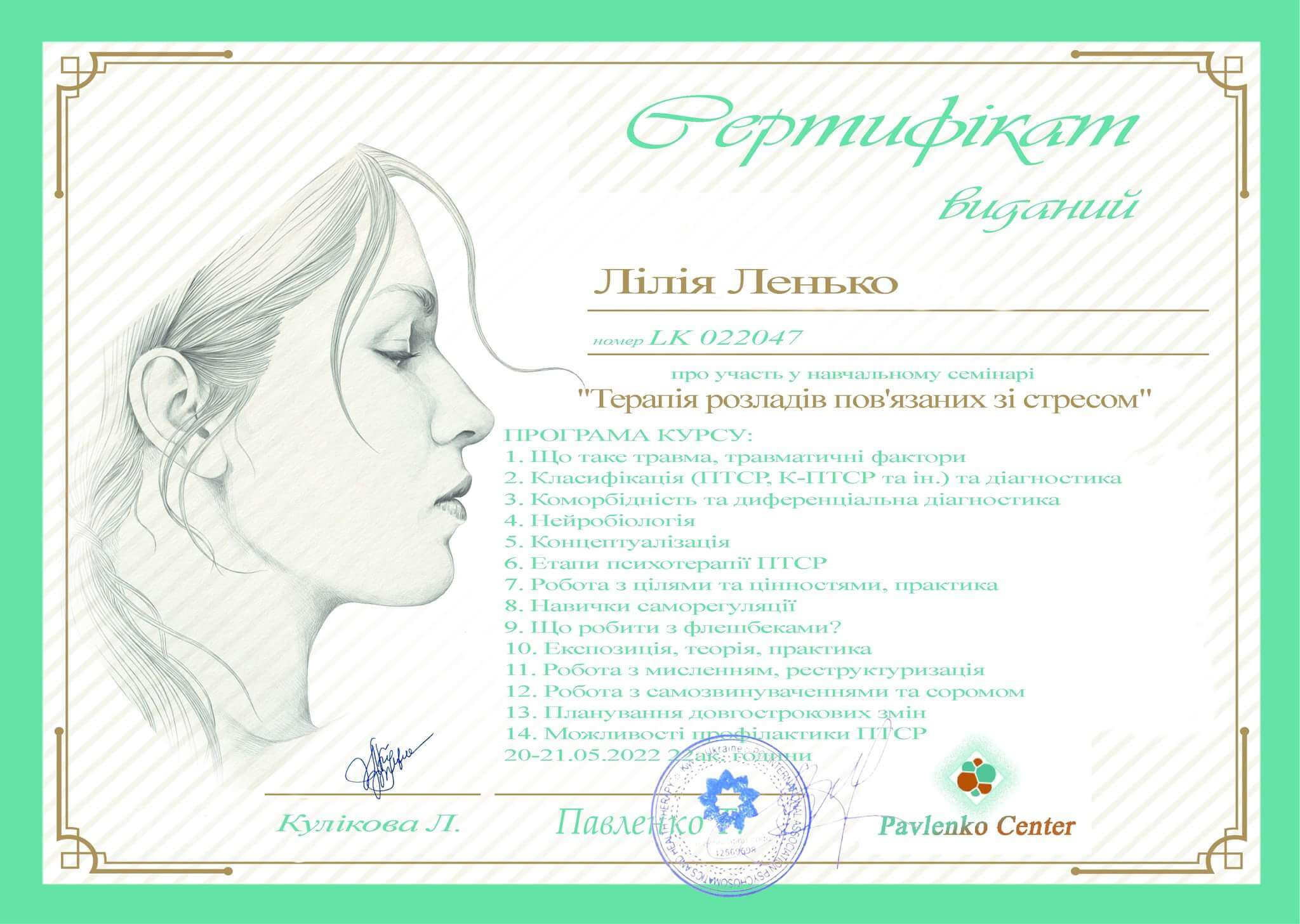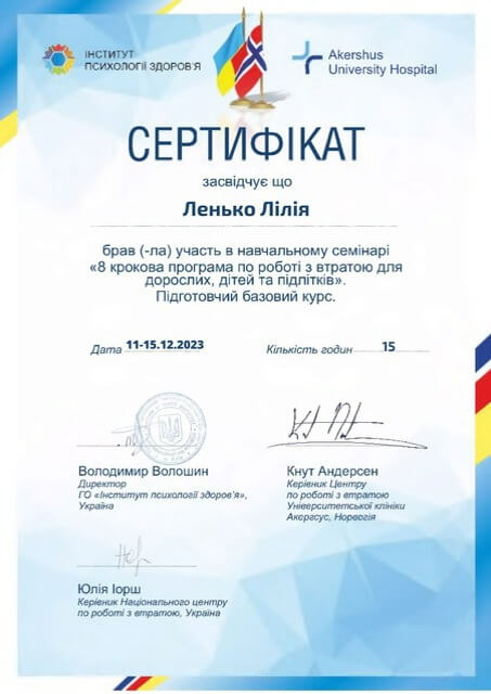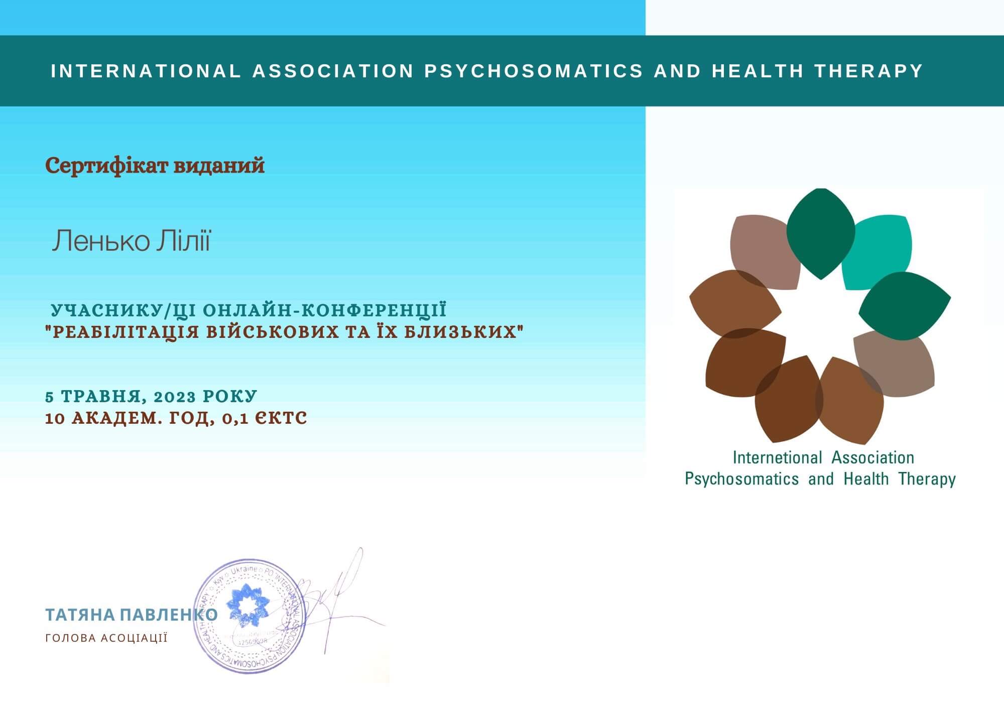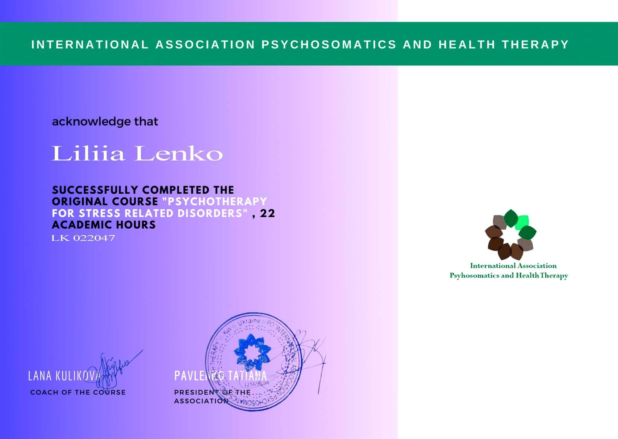 ~Навчання з напрямку психосоматики (член асоціації психотерапевтів психосамотології та тілесної теріпії) (2022);
