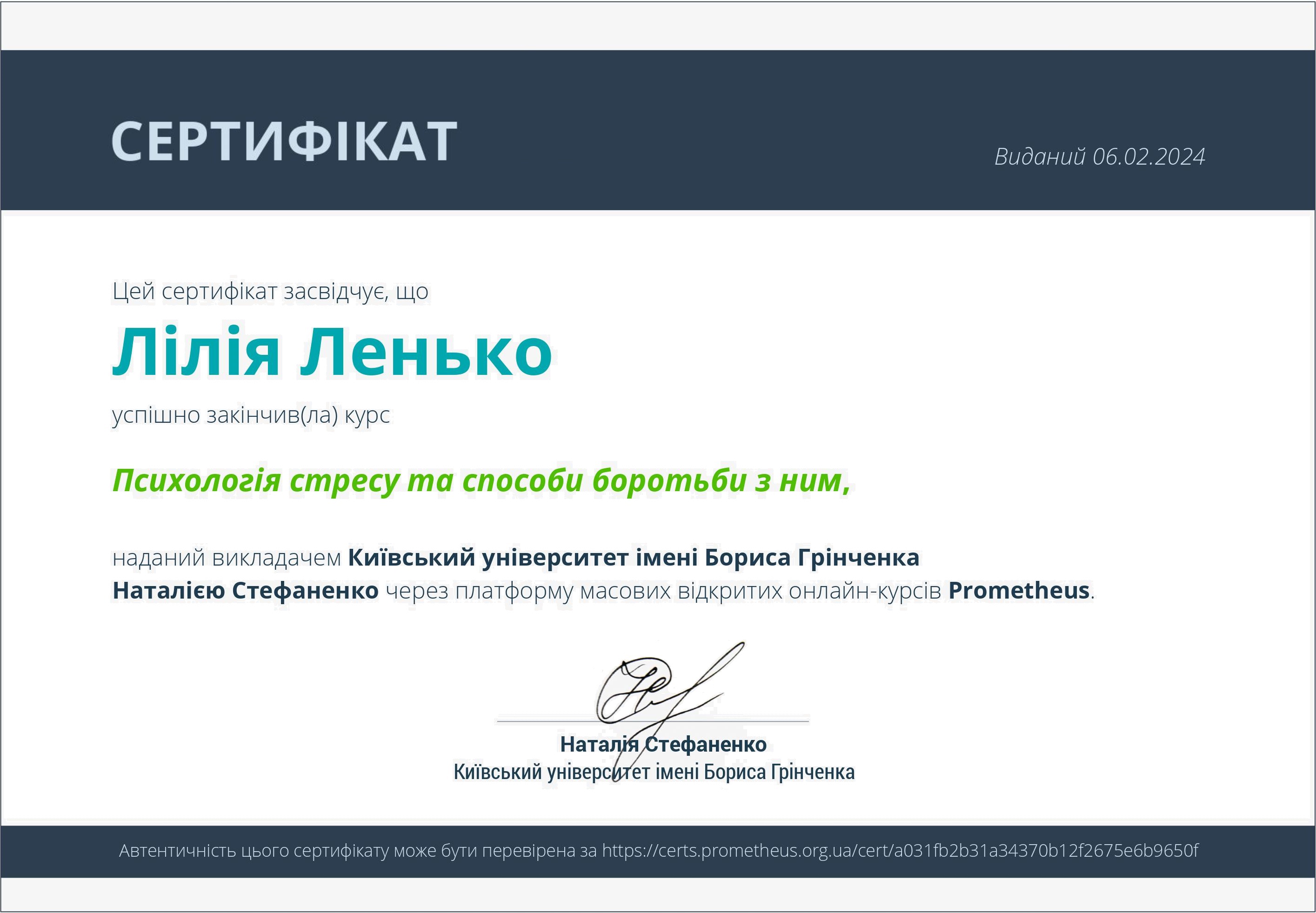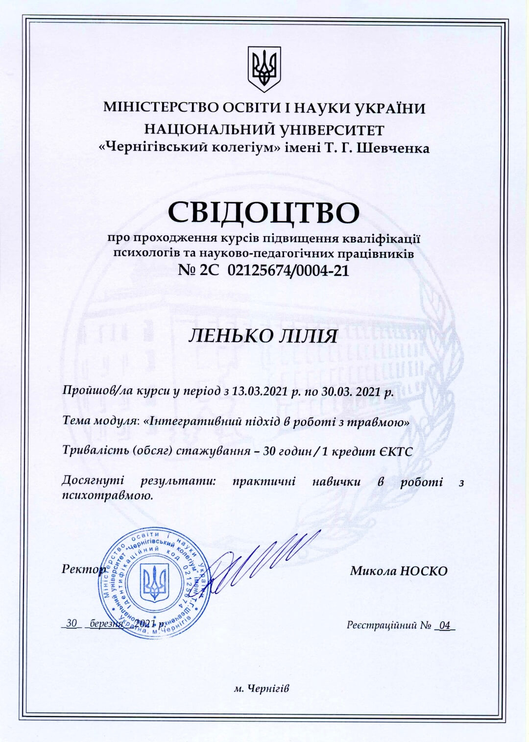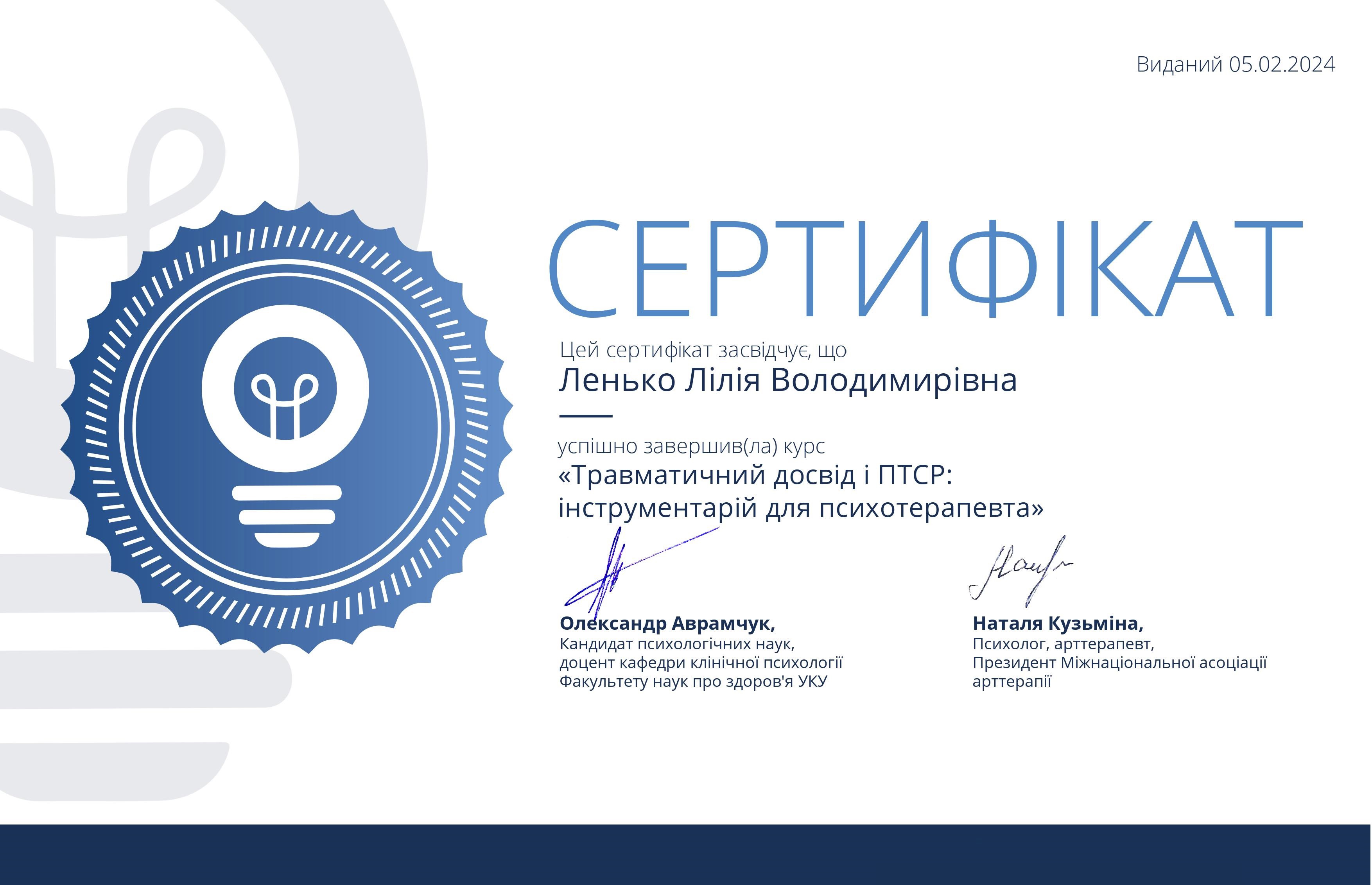 ~Навчання з напрямку психосоматики (член асоціації психотерапевтів психосамотології та тілесної теріпії) (2022);