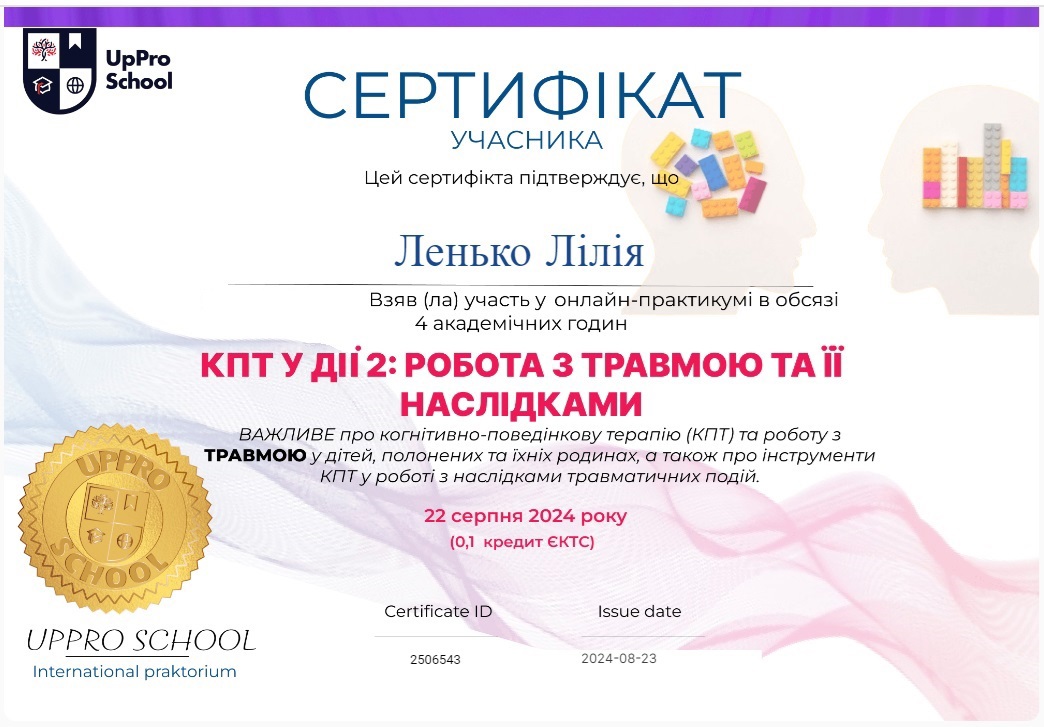 ~Міжнародний курс "КПТ у дії: Робота з травмою та її наслідками" (2024);