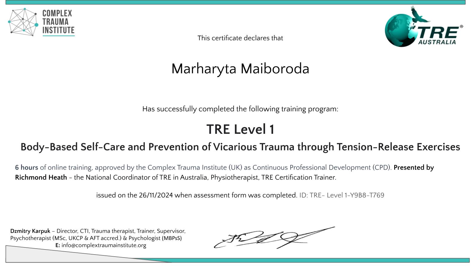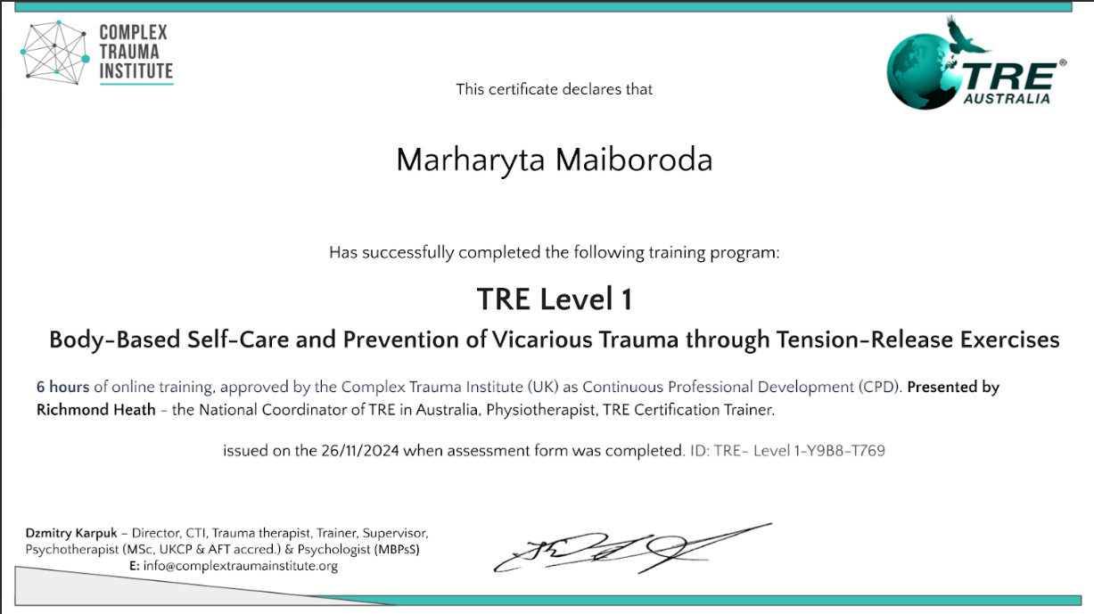 Training program of practice Rewind Technique ( прослухала курс та сертифікувалася у практикуванні методу Rewind, що працює з наслідками гострого стресу, психологічної травми, ПТСР тощо)