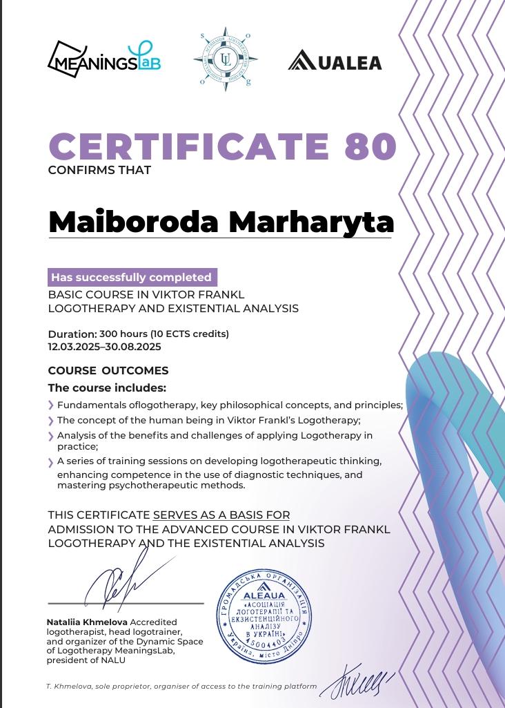 2025 р. - навчання в MeaningsLab ( Динамічний простір логотерапії) на Базовий курс логотерапії Віктора Франкла
