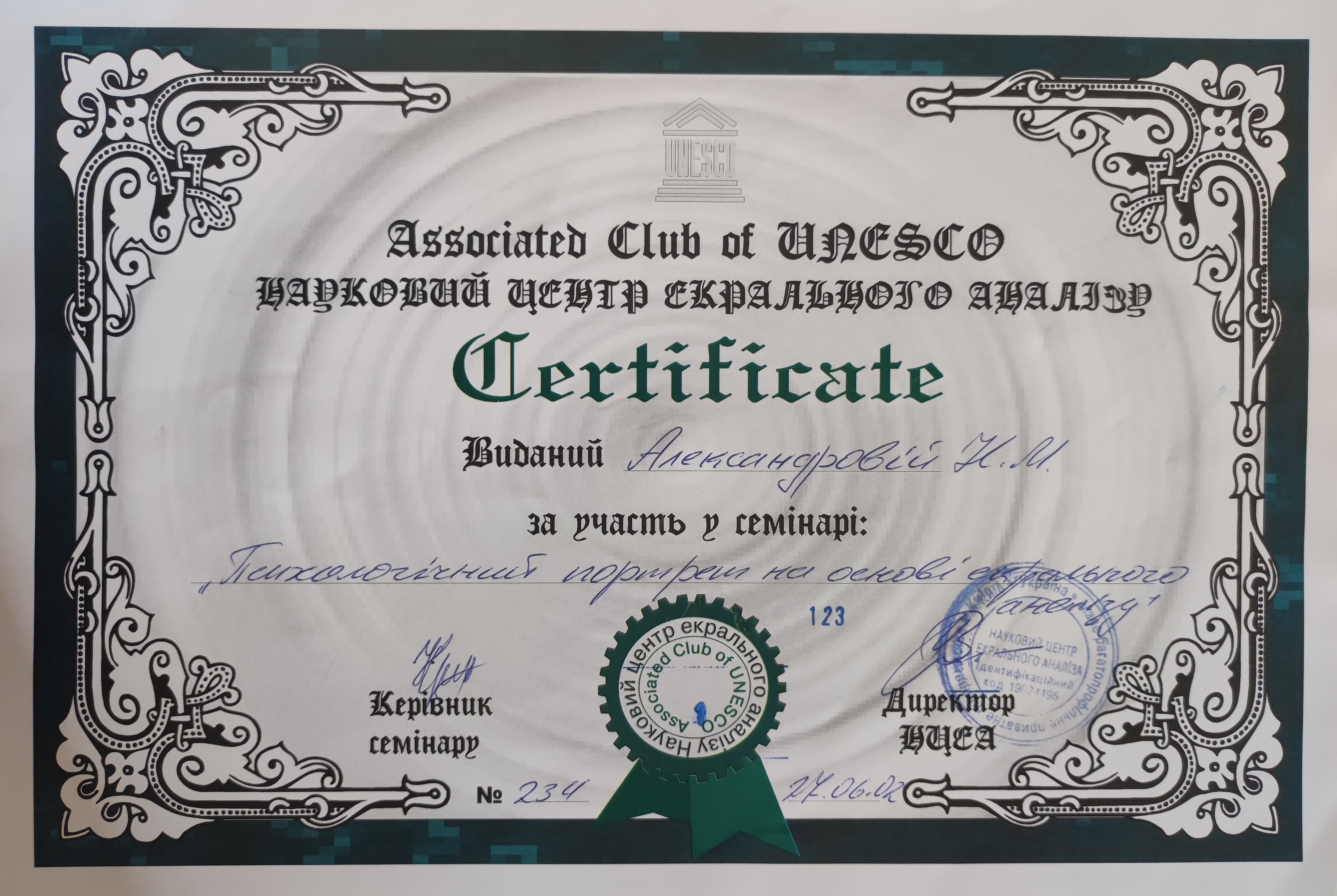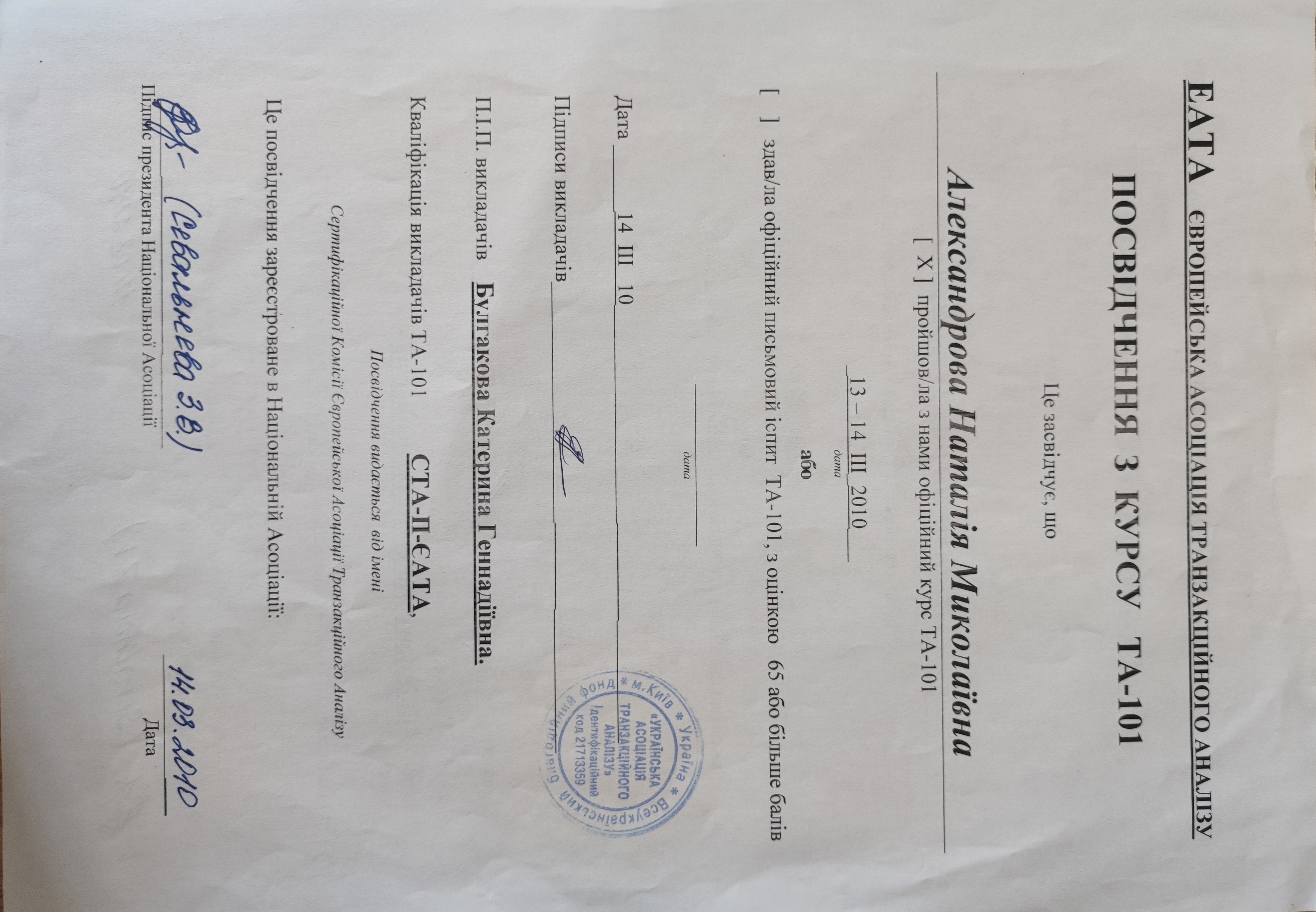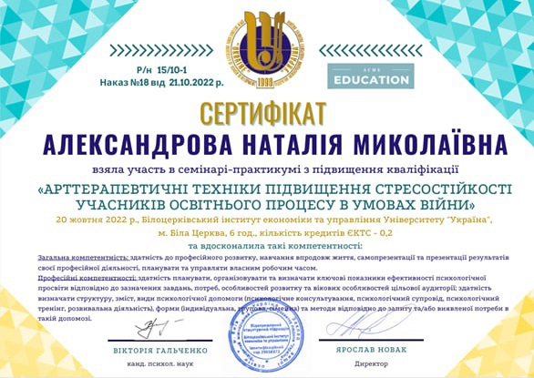 • УСТА Українська Спільнота Траназакційного Аналізу - 202 курс «Транзакційного Аналізу в Психотерапії» 454 години (завершила 4-річне навчання та склала фінальний залік);
