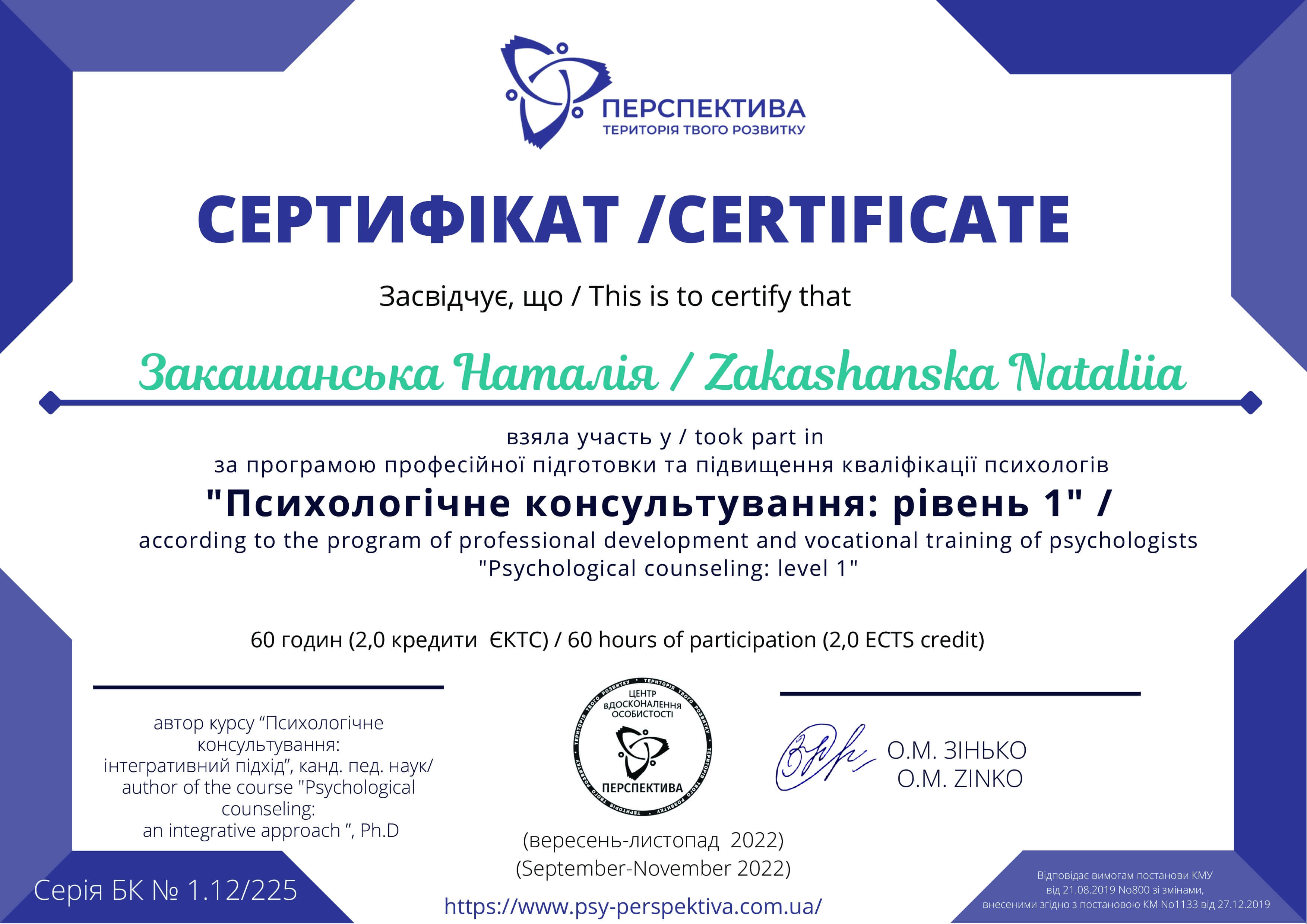 Психологічне консультування: 1 рівень (60 годин); Психологічне консультування: 2 рівень (60 годин);