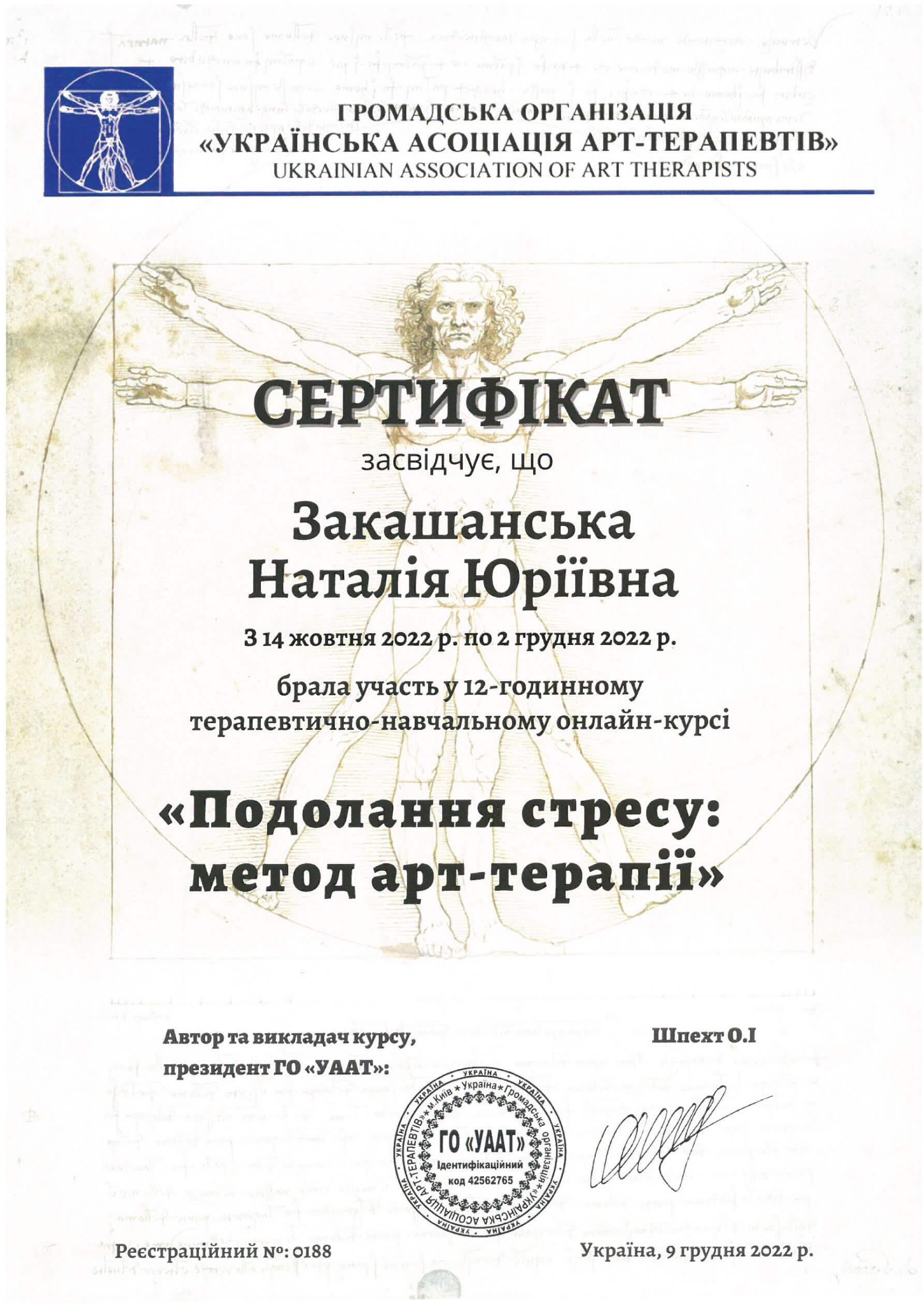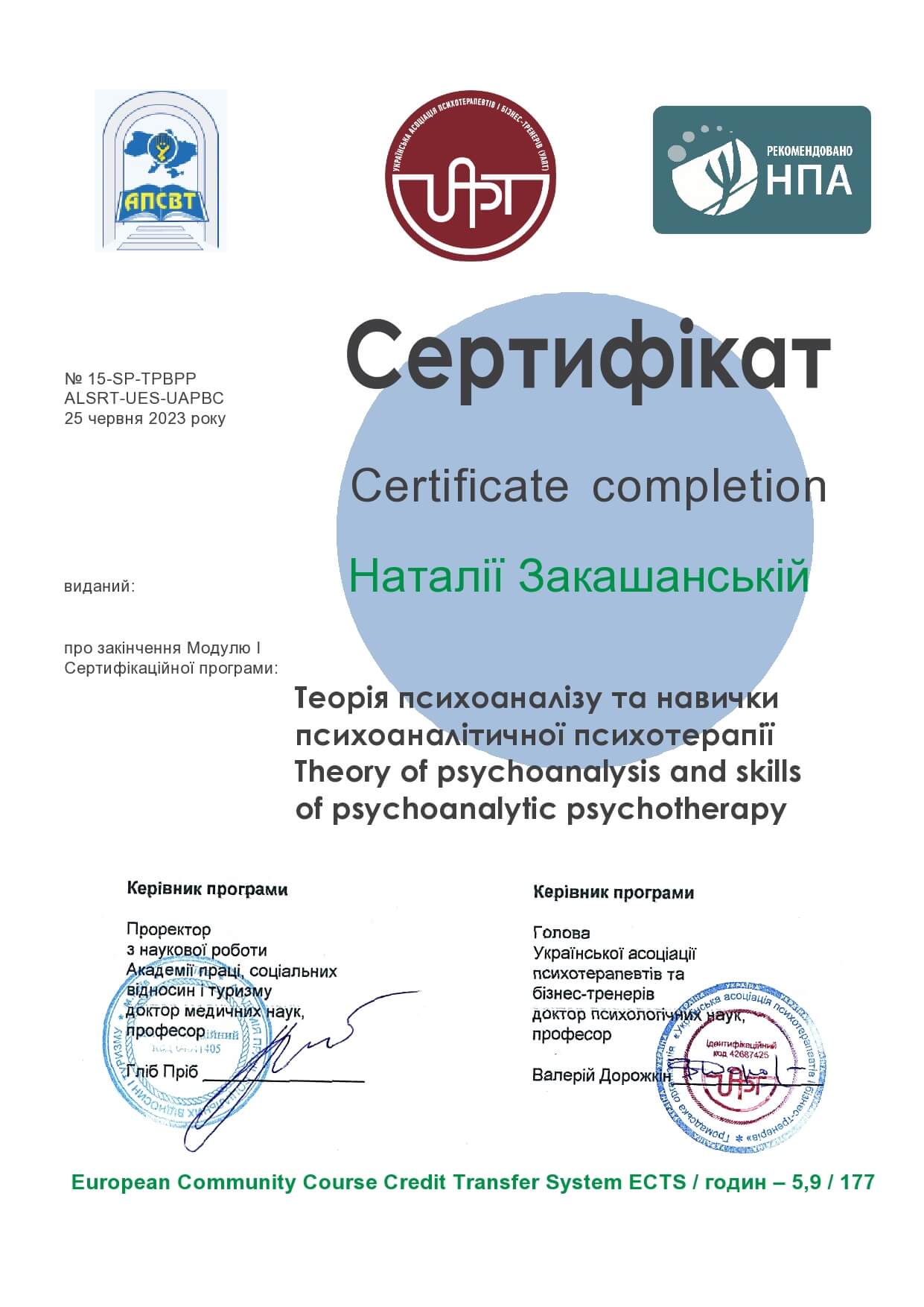 - Психоаналітик у навчанні, сертифікатна Програма "Теорія психоаналізу та навички психоаналітичної психотерапії" рекомендована НПА (представник EFPA в Україні);