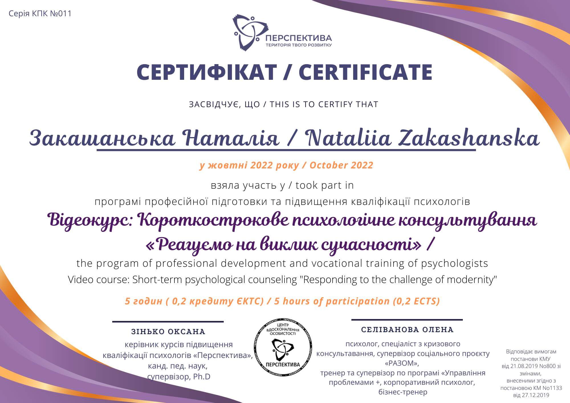 - Гештальттерапевт, НАПНУ Український науково-методичнй центр практичної психології та соціальної роботи 2015-2018 р;