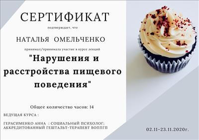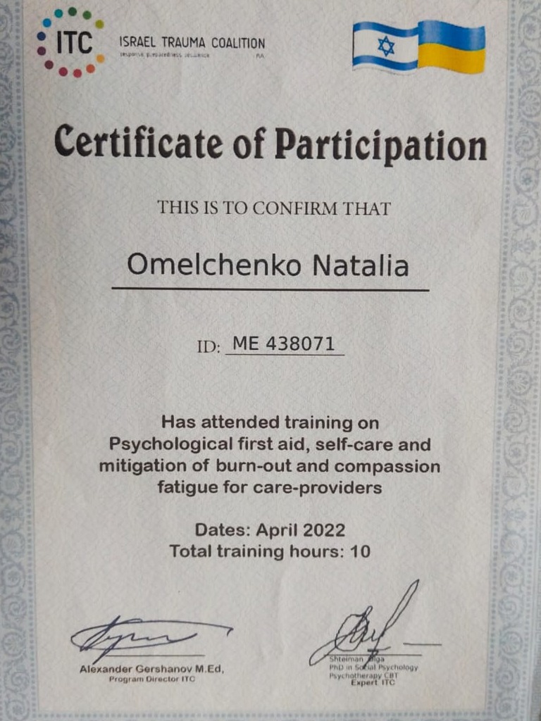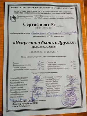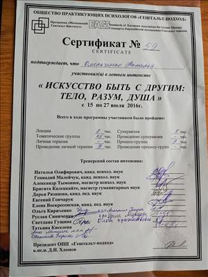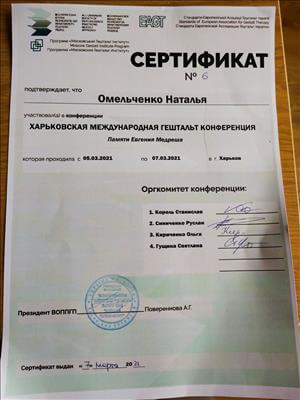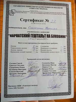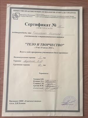1 і 2 ступінь Гештальт Інститут - сертивікована у 2020 році;