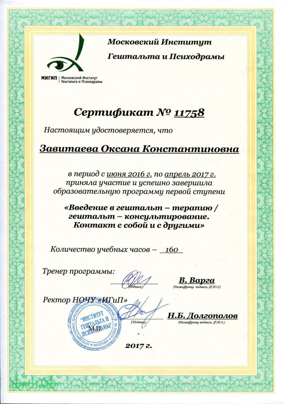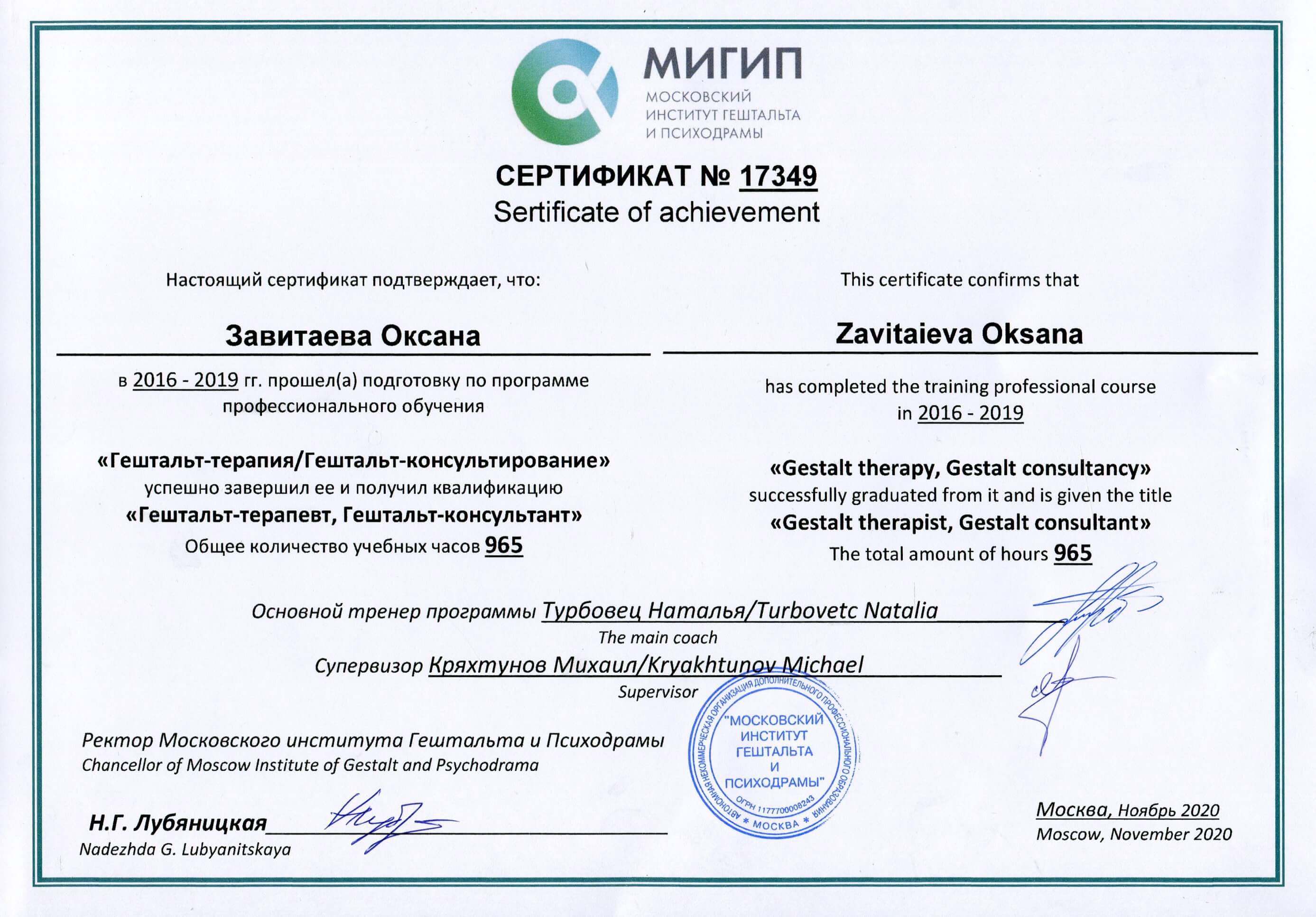 - Московський Інститут Гештальта та Психодрами (МІГІП), Київський Інститут Гештальта та Психодрами (КДГіП). Спеціалізація: Гештальт-терапевт (ІІ ступінь), 2019 р., (965 годин); Сертифікований терапевт.
