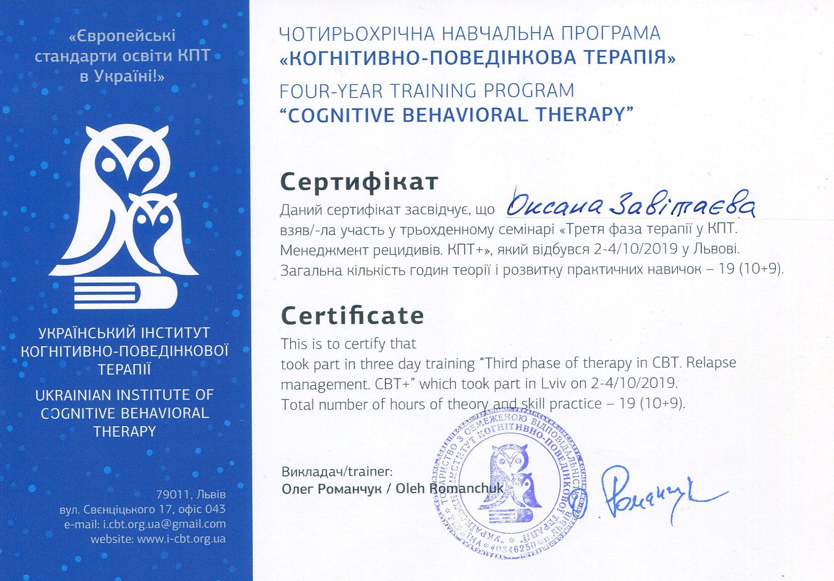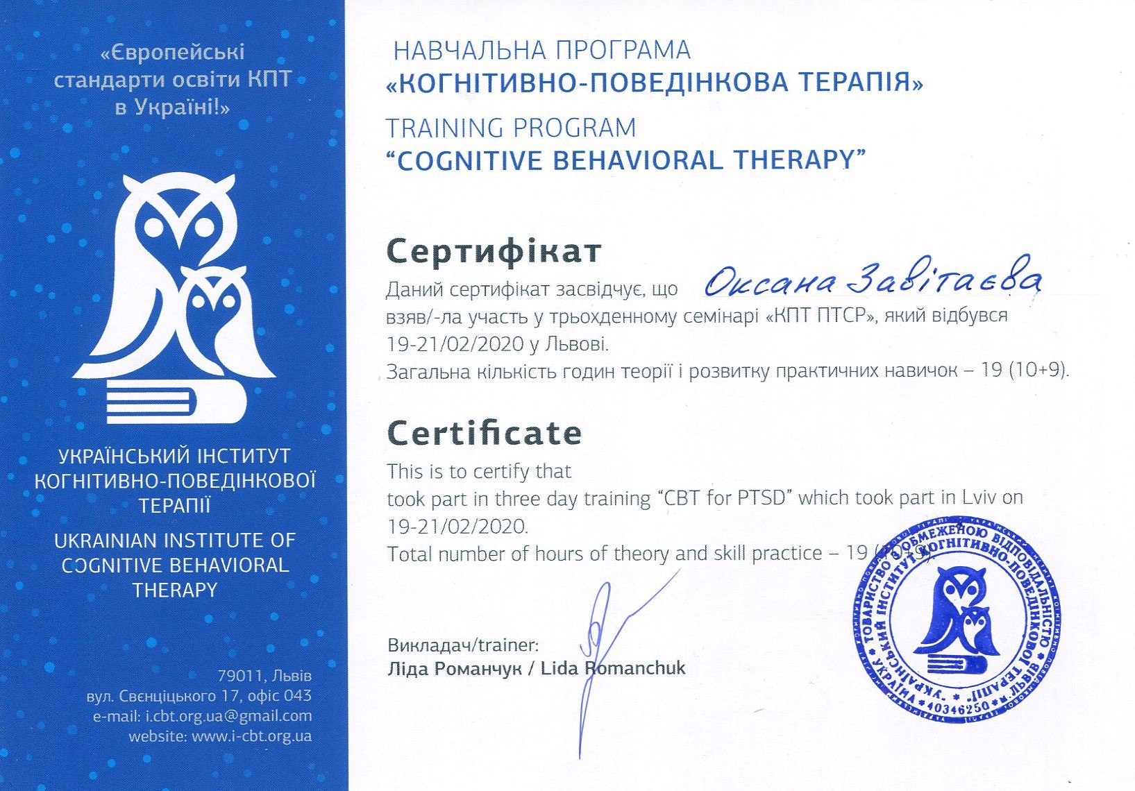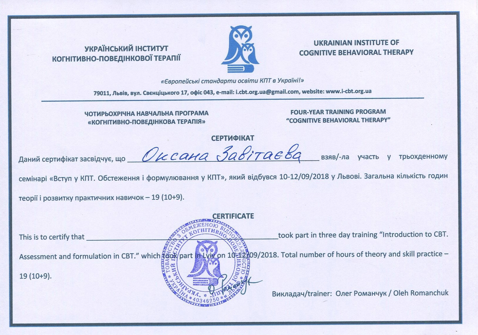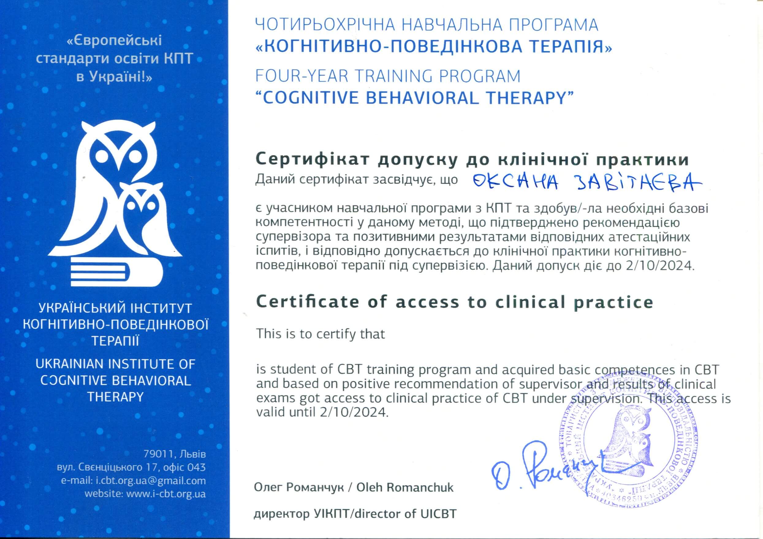 – Український Інститут Когнітивно-Поведінкової Терапії (УІКПТ), 2022 р., (4-річна навчальна програма).