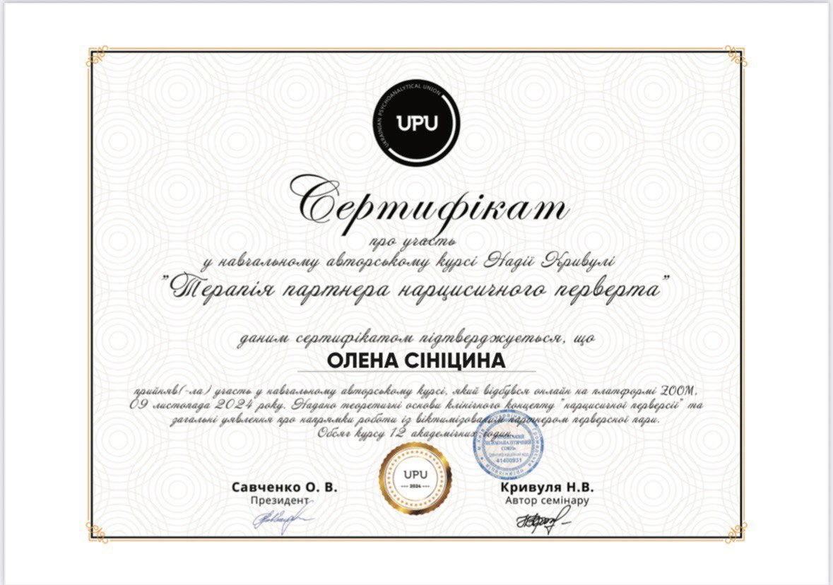 Член Української Асоціації Психоаналізу та Української Психоаналітичної Спілки.