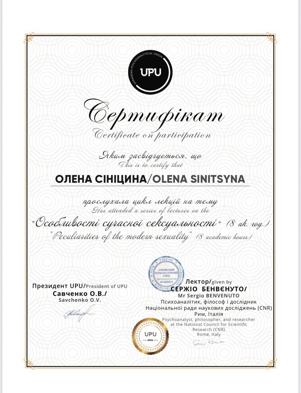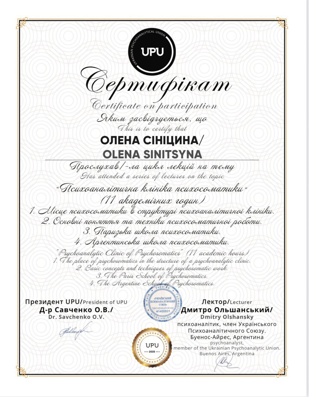 Міжнародний Інститут Глибинної Психології (Київ). Кваліфікація – практичний психолог, психоаналітик. (1904 годин).