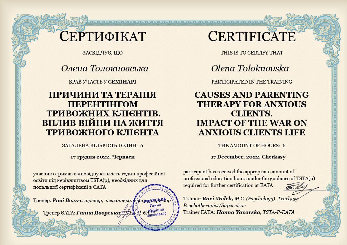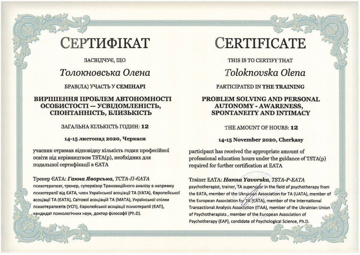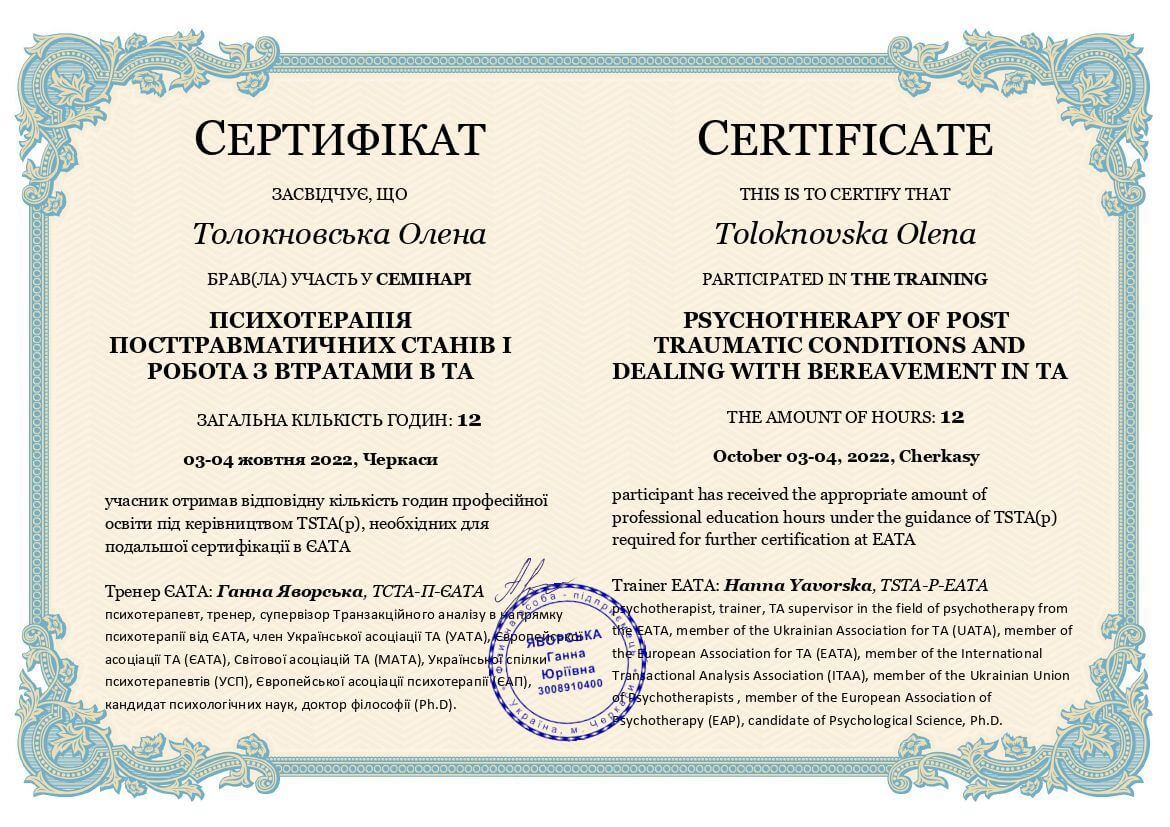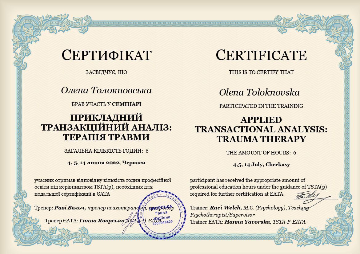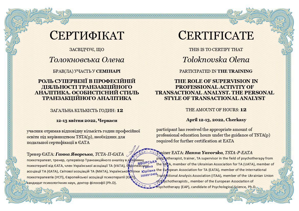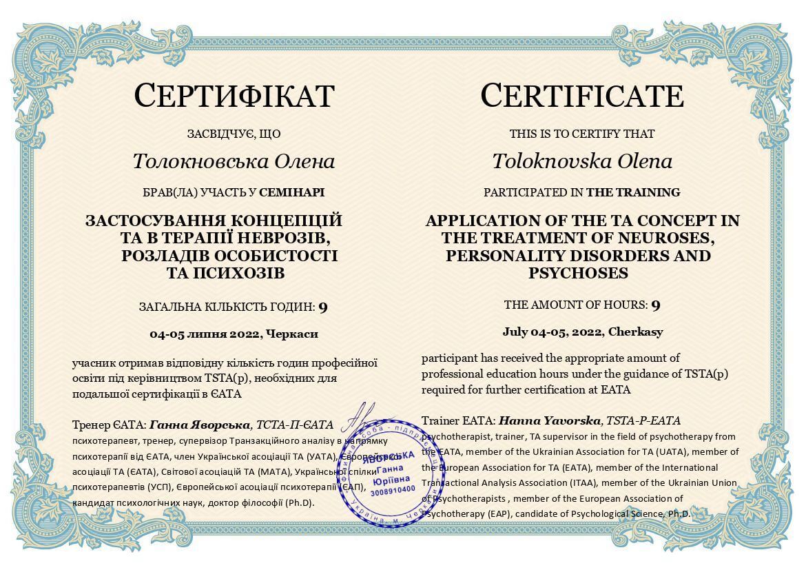 Що таке психотерапія я знаю із власного досвіду. Можу з впевненістю сказати, що вона змінила моє життя. Це стало моєю найкращою інвестицією в себе і саме під час власної терапії я закохалася в метод - транзакційний аналіз. Він є простий, зрозумілий, неймовірно цікавий та дієвий. Навчив мене турботливому, дбайливому, підтримуючому ставленню до себе, розуміти свій внутрішній світ, безпосередньо висловлювати свої почуття, бути спонтанною, автономною, розділяти почуття близькості з людьми. А також усвідомити та змінити свої непродуктивні стереотипи поведінки та переконання, що заважали досягати намічений цілей. Це не скажу що завжди легкий, але неймовірно цікавий шлях, знайомство зі справжньою собою, розкриття, і відчуття сили рости, змінюватися та бути щасливою.