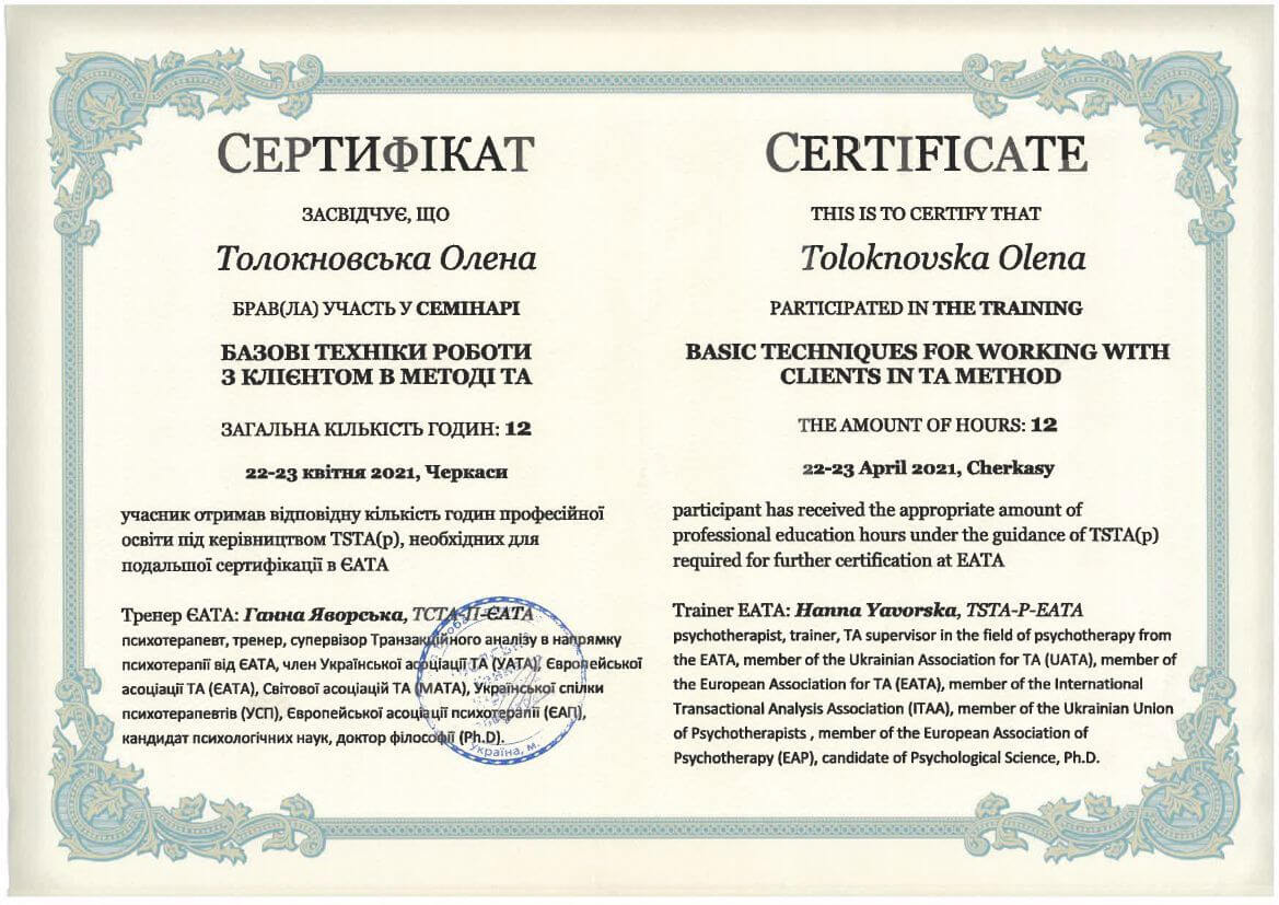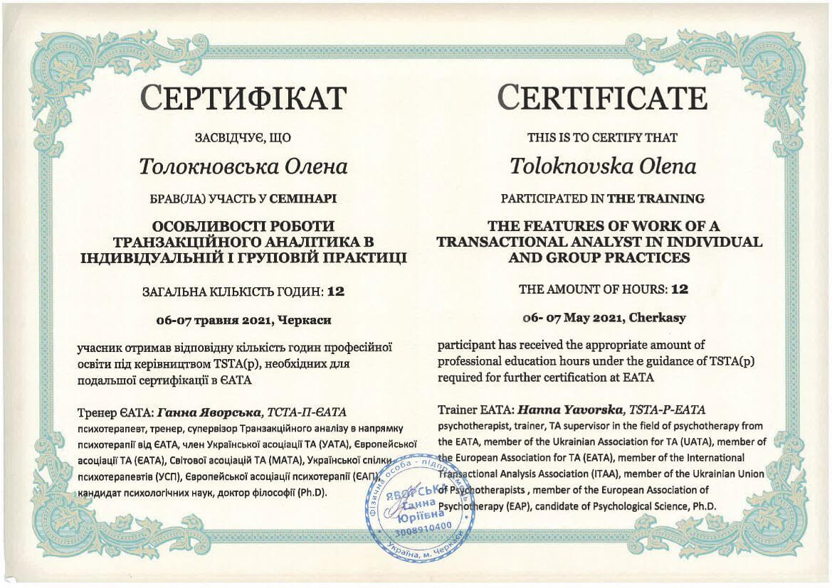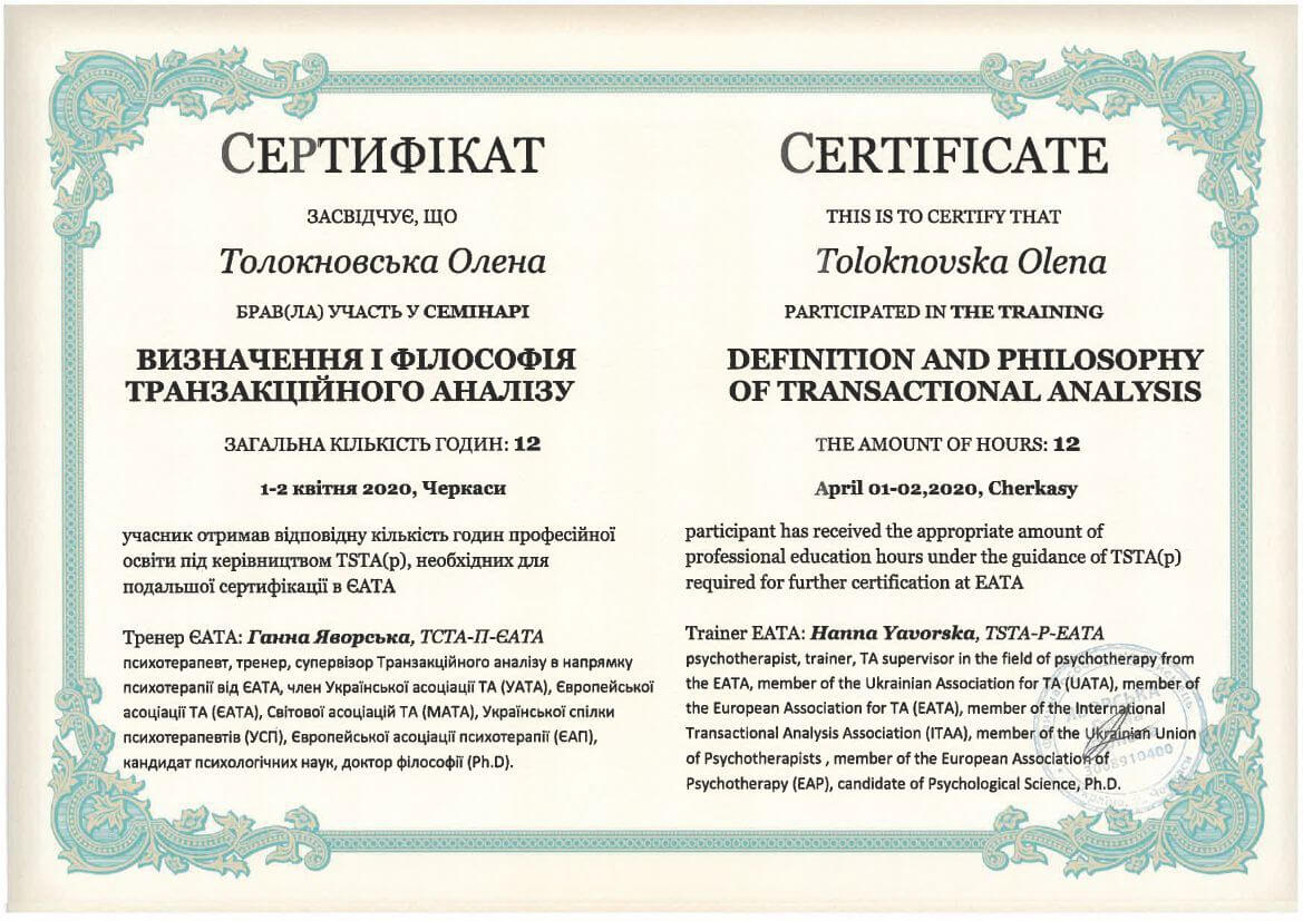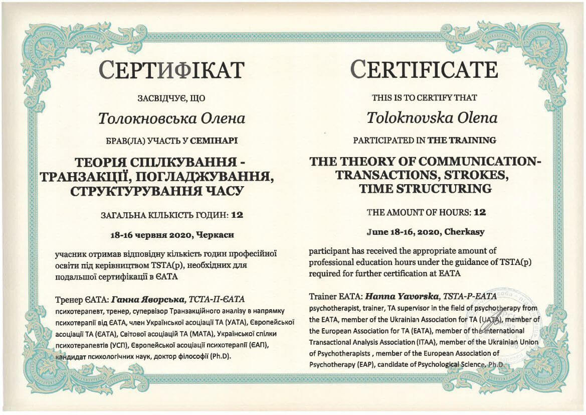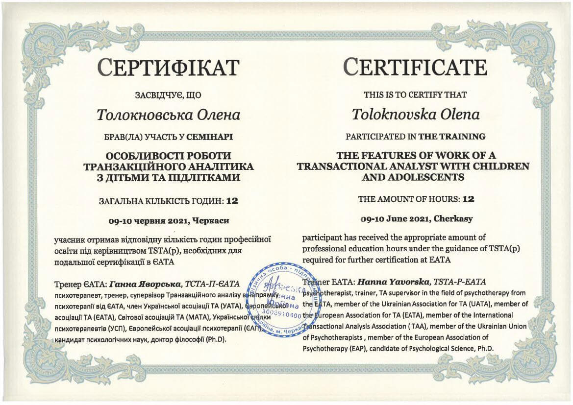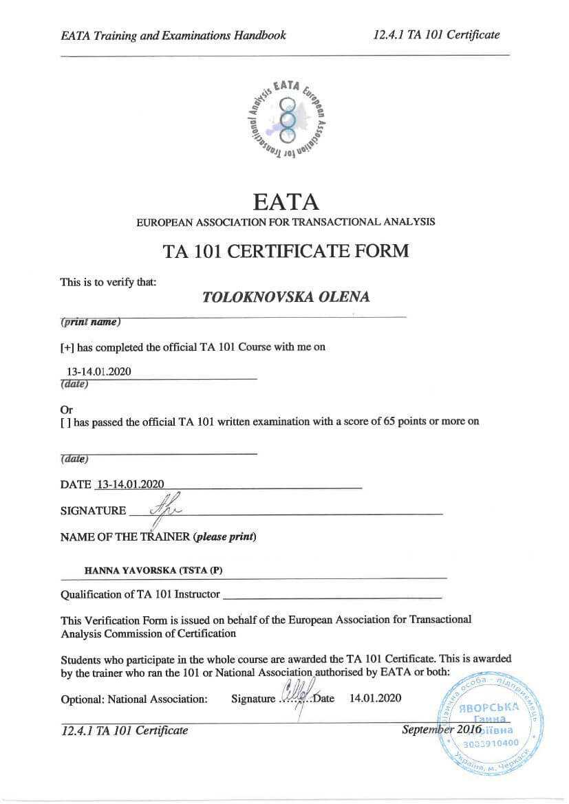 ● Офіційний курс з поглибленного вивчення психотерапевтичного методу Транзакційного аналізу - 360 годин (4 роки навчання).