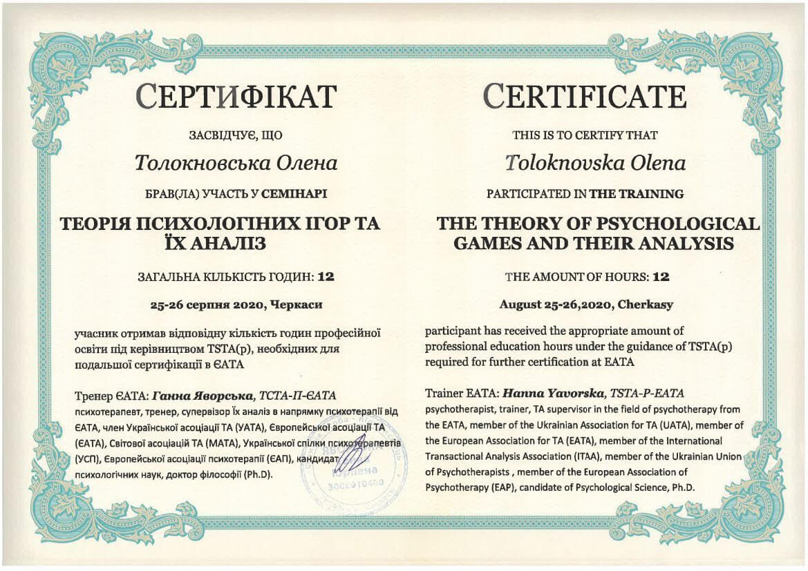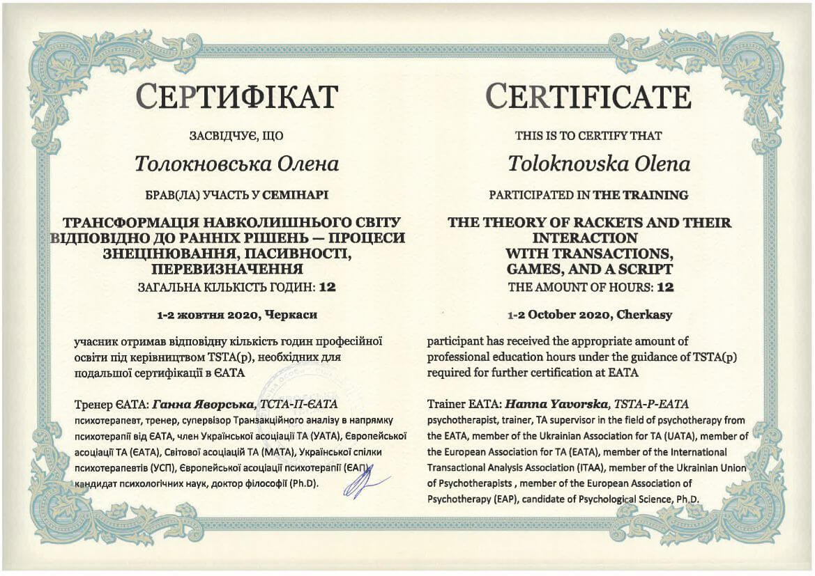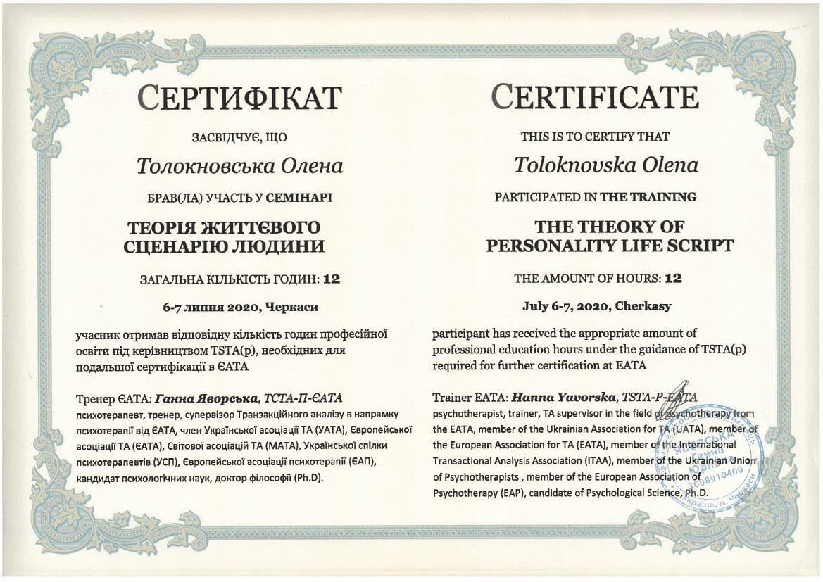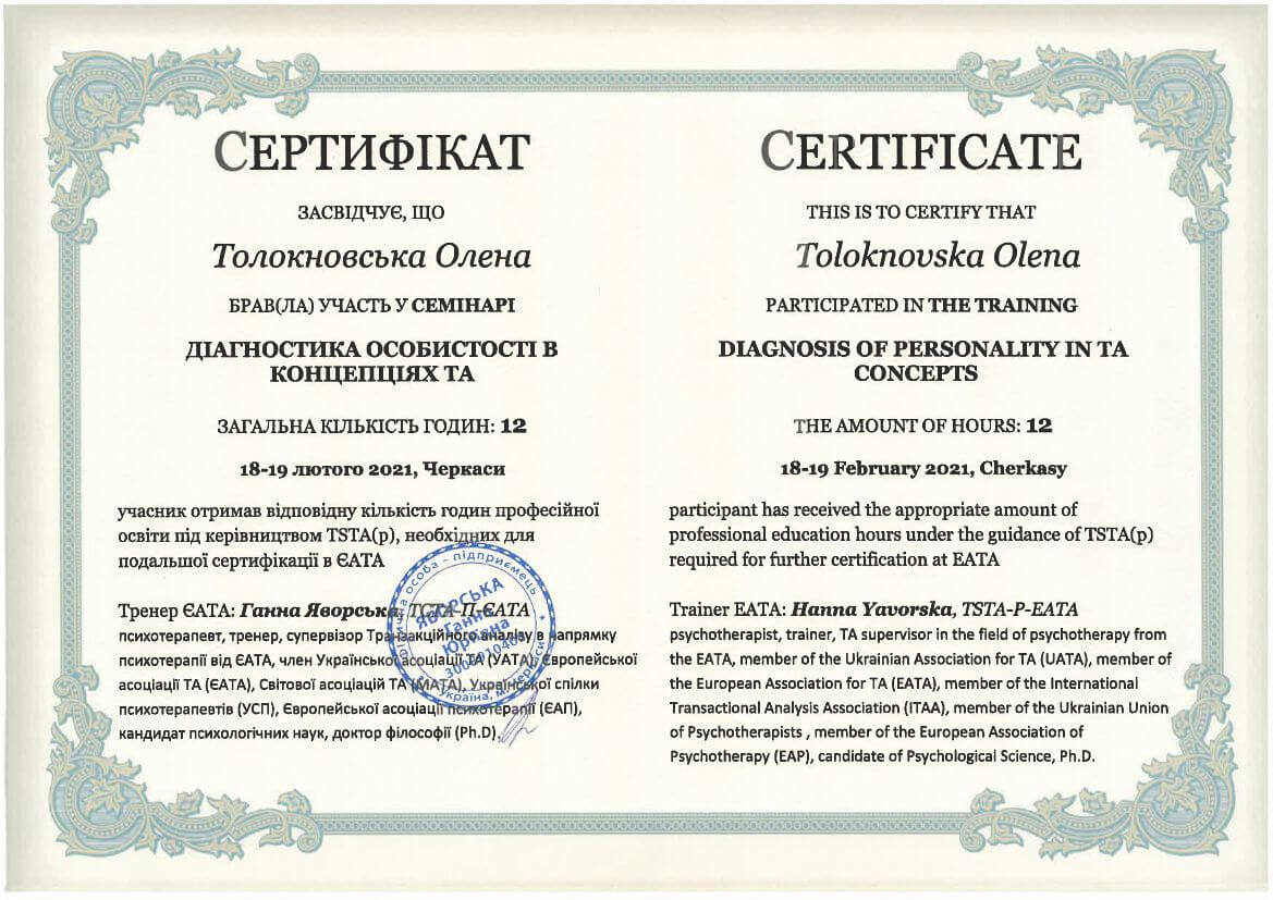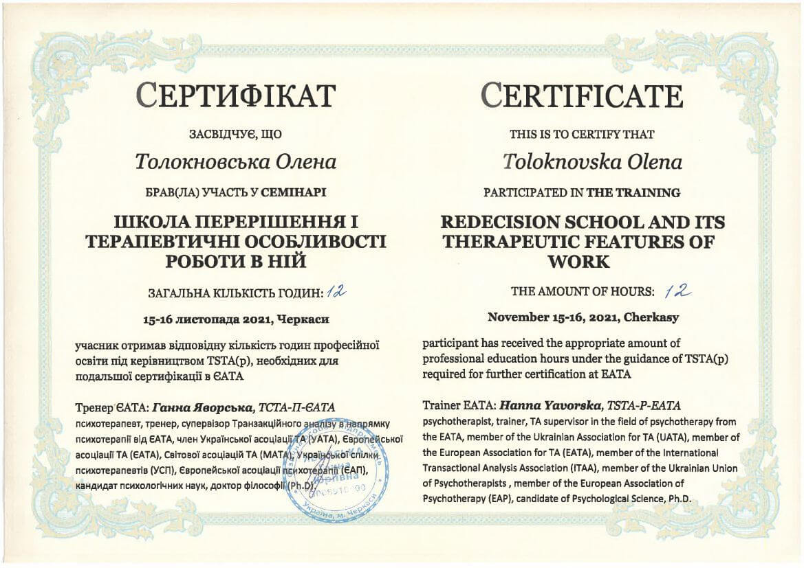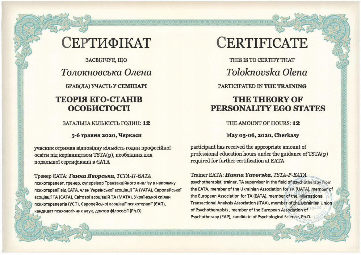 ● Офіційний курс з поглибленного вивчення психотерапевтичного методу Транзакційного аналізу - 360 годин (4 роки навчання).