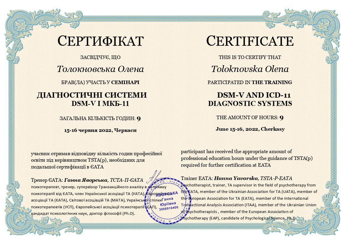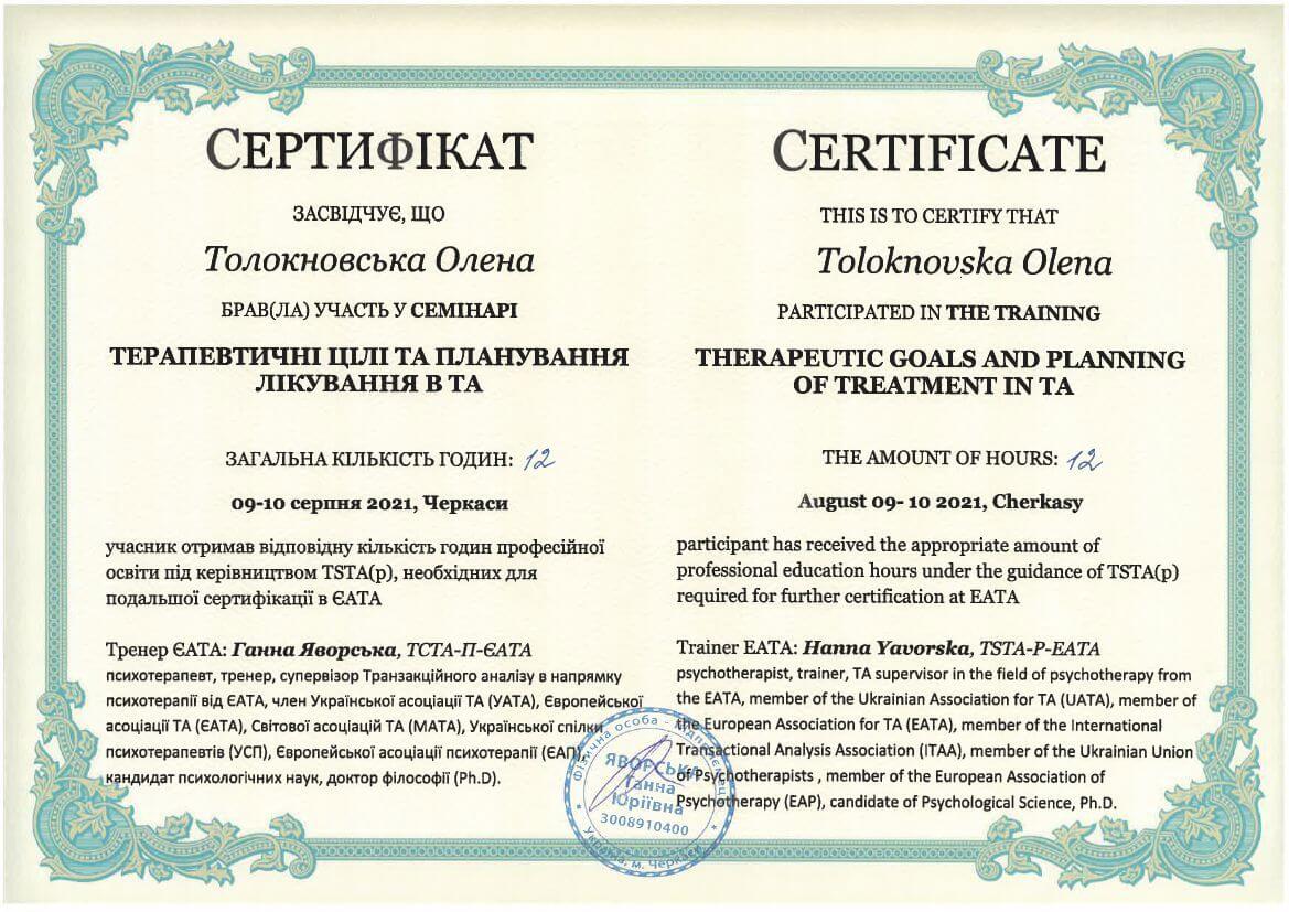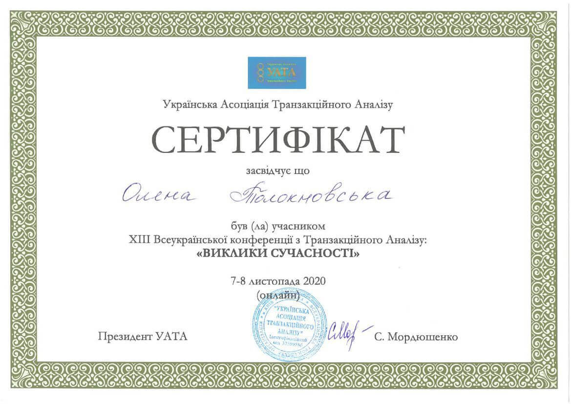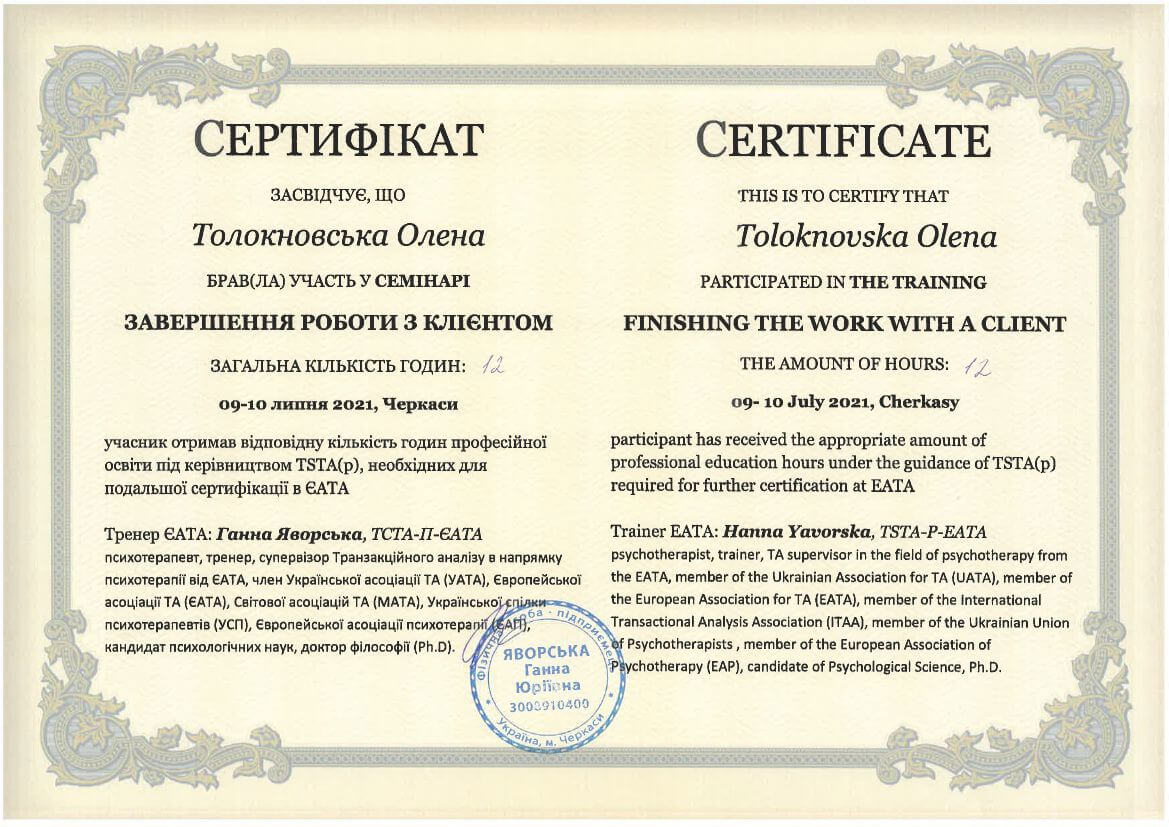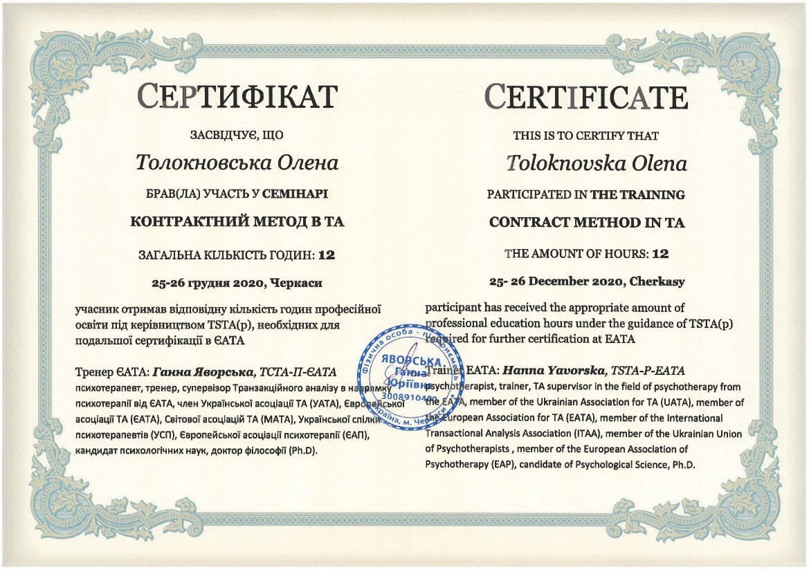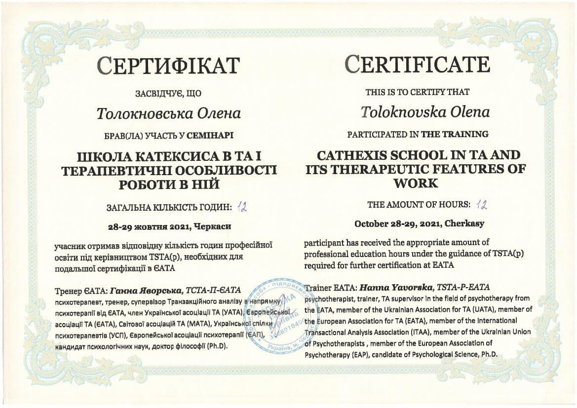 ● Офіційний курс з поглибленного вивчення психотерапевтичного методу Транзакційного аналізу - 360 годин (4 роки навчання).