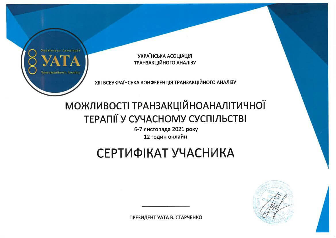 Я є членом УАТА, ЄАТА (української та європейської асоціації транзактного аналізу). Беру участь у різноманітних семінарах, тренінгах, професійних конференціях. На постійній основі беру супервізії у сертифікованих в Європі тренерів з транзакційного аналізу. Вже кілька років поспіль є тренером на Всеукраїнському сімейному літньому таборі з транзакційного аналізу.