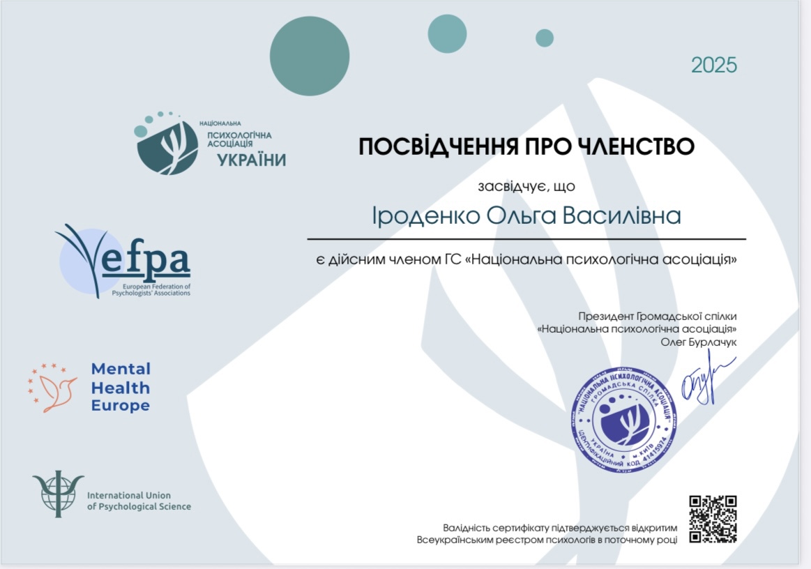 Відвідую багато курсів та конференцій. Є членом ГС « Національна психологічна асоціації»
