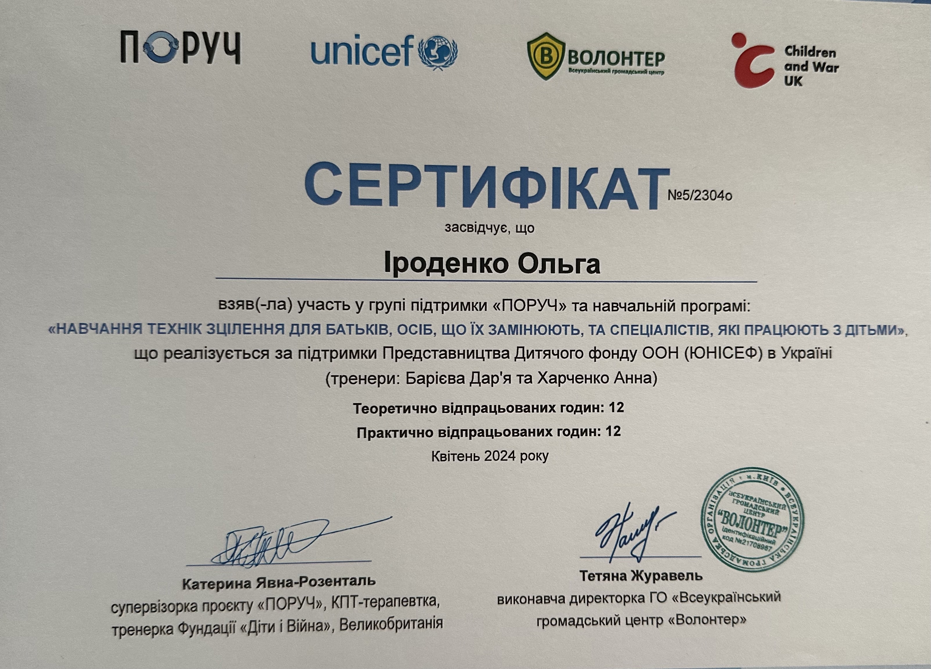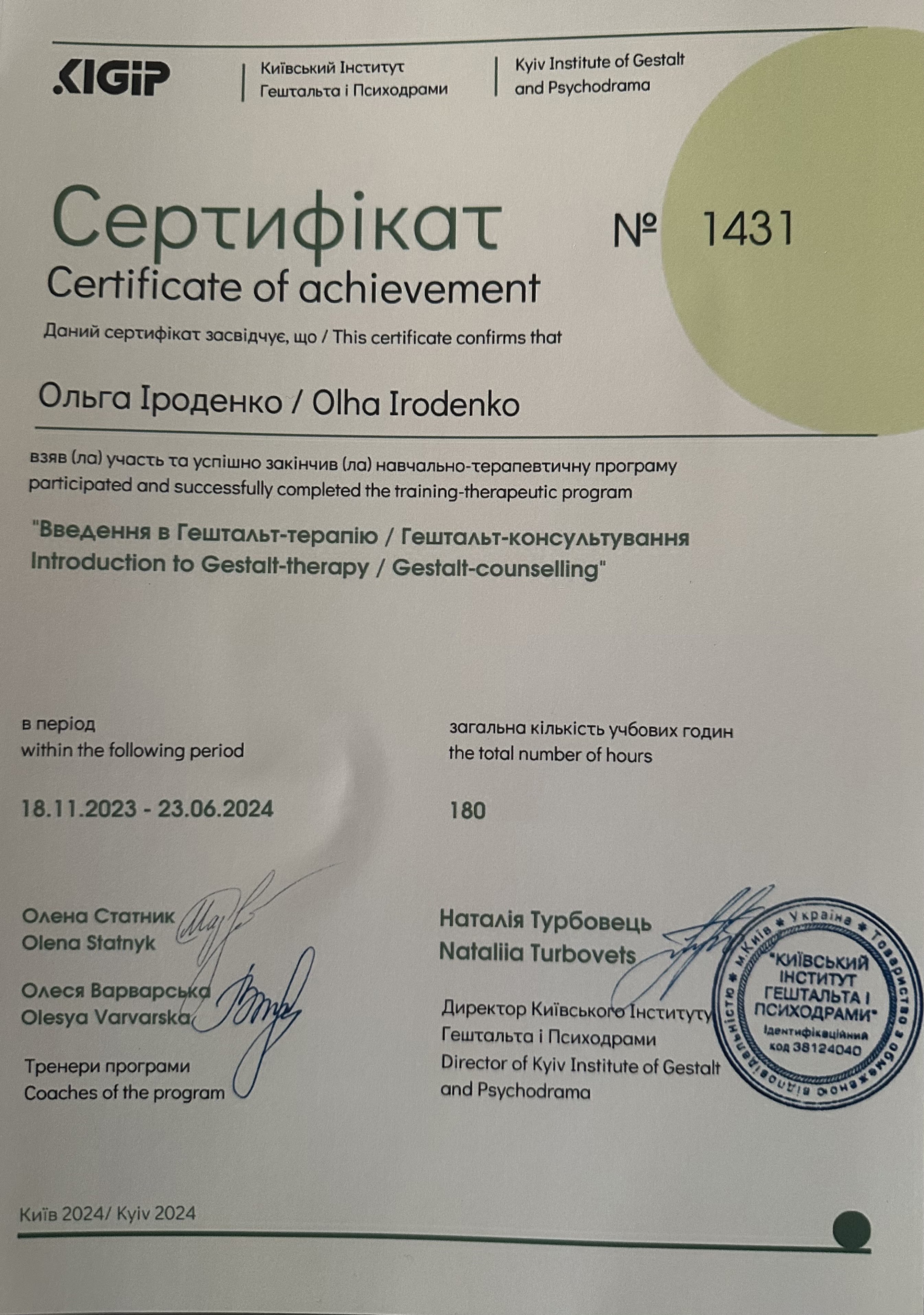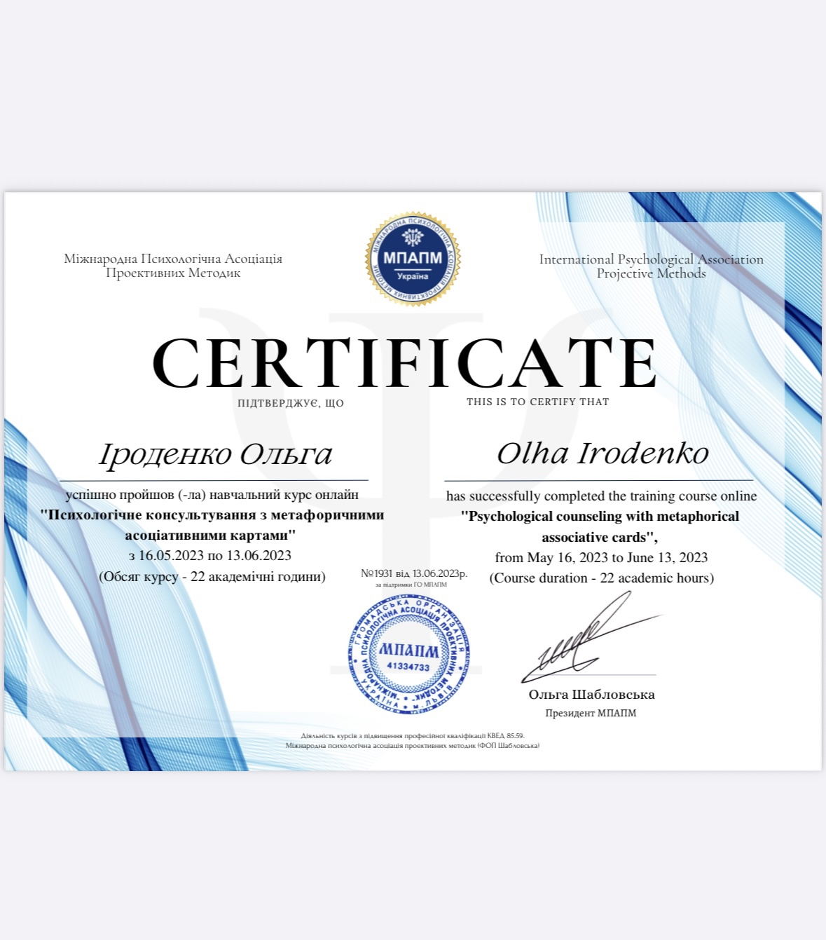 В спілкуванні з клієнтами тепла емпатійна. Постійно розвиваюсь та навчаюсь. Працюю під супервізією, маю індивідуальну та групову терапію. Відвідую інтервізії.