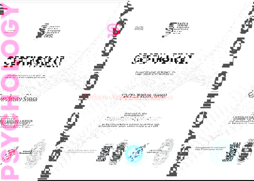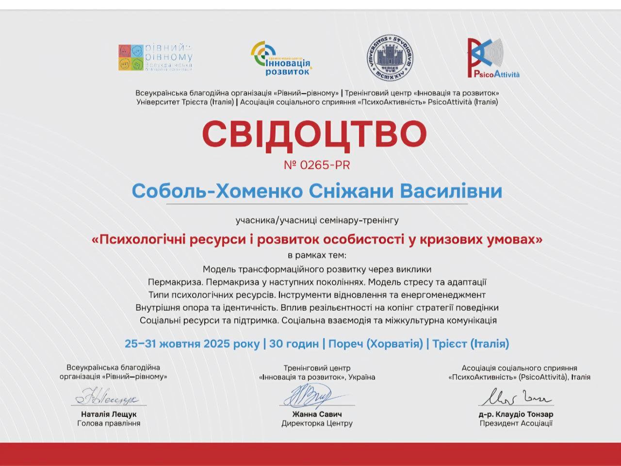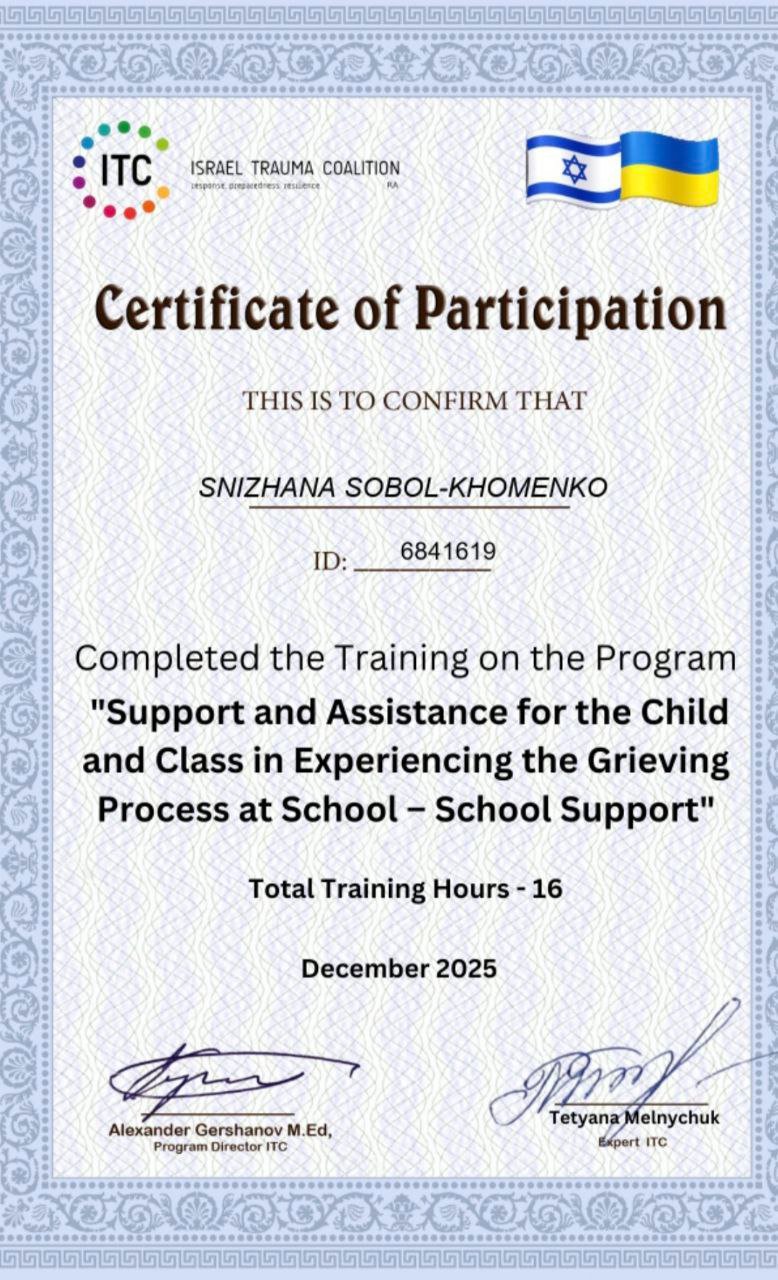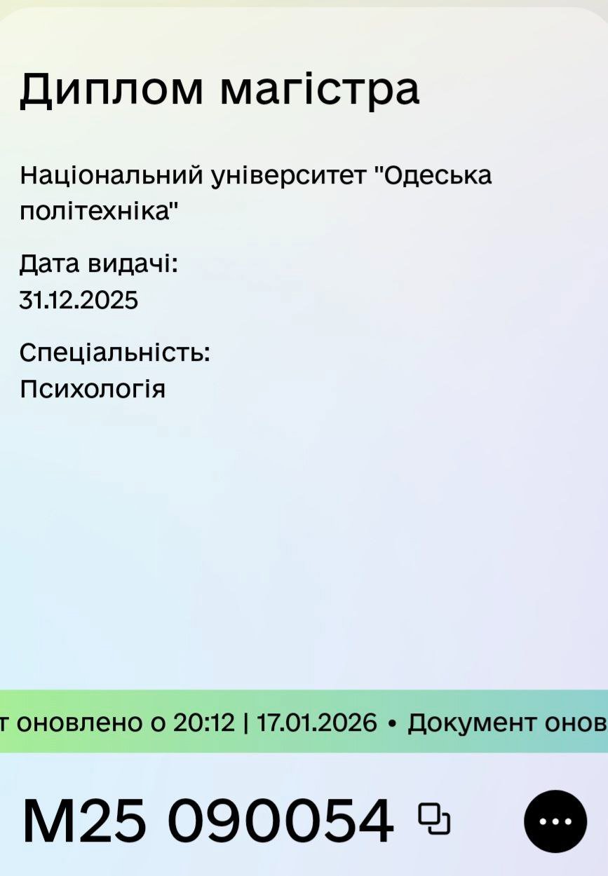 магістр психології, сертифікований тренер програми «Діти та війна. Навчання технік зцілення», терапія наслідків психологічних травм та тривожно-фобічних станів), ведуча груп підтримки для батьків «Батьківство без стресу», ведуча жіночих арт терапевтичних груп підтримки та поповнення ресурсів, супроводжую дітей з особливими освітніми потребами в умовах інклюзивної освіти.