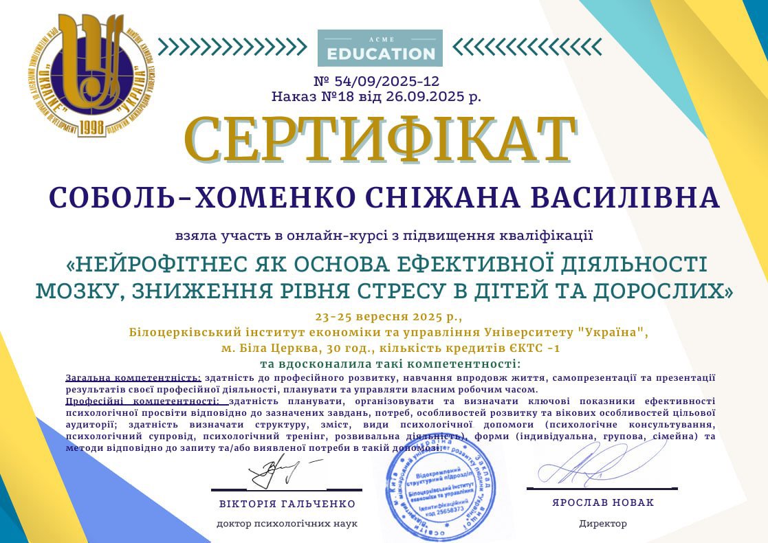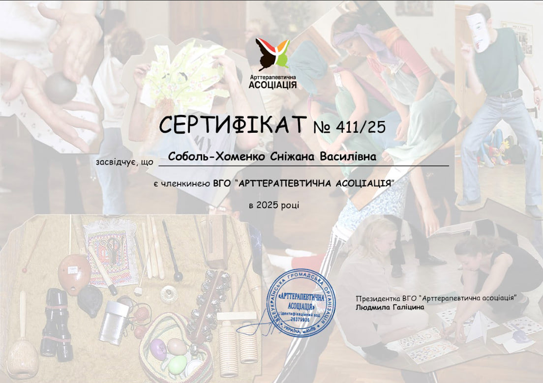 Я застосовую інтерактивні арт-терапевтичні інструменти для аналізу та трансформації психічних станів в індивідуальній та груповій роботі.