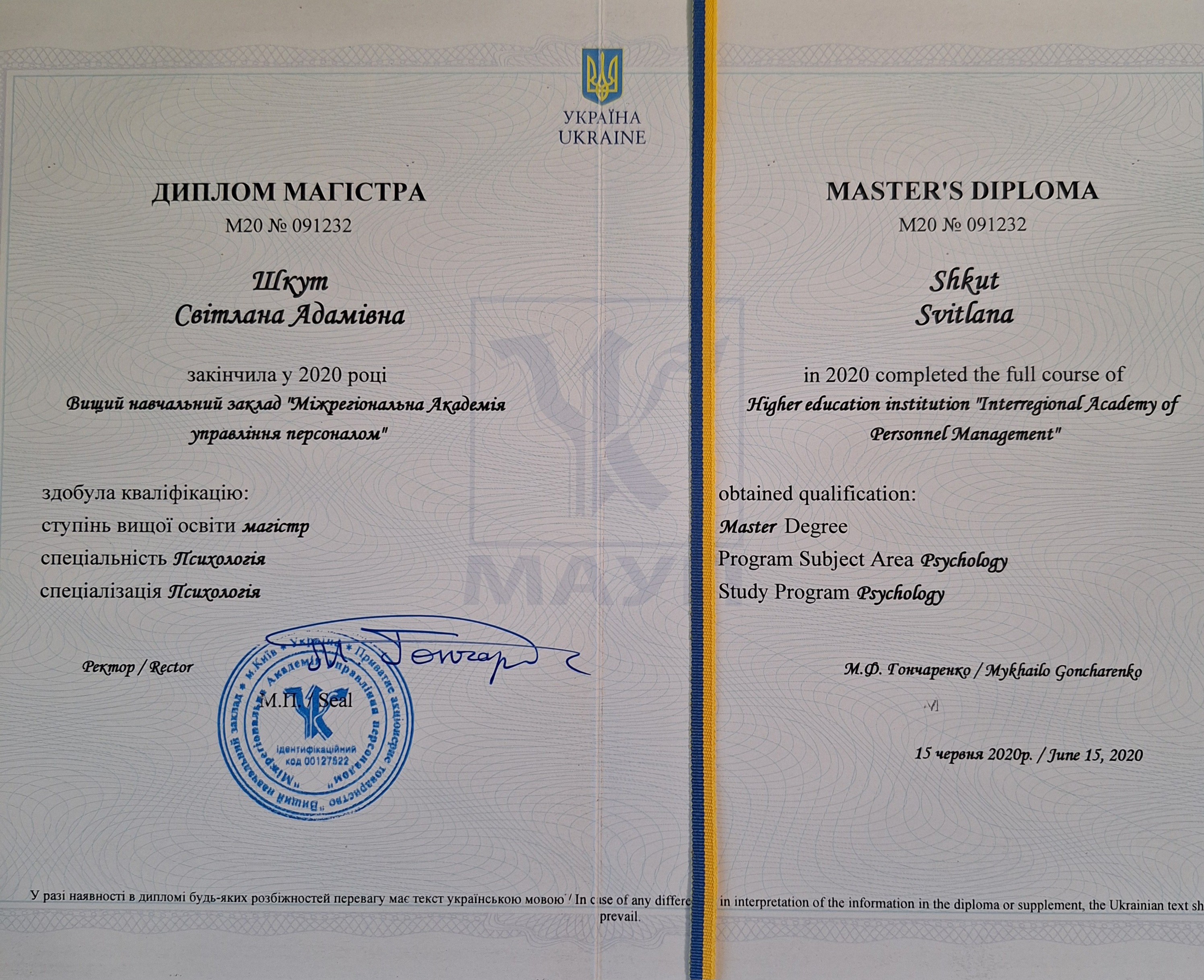 Міжрегіональна Академія управління персоналом магістр психологія. Волинський національний університет імені Лесі Українки клінічна психологія. Підтримка психічного здоров'я у військовий та післявійськовий час.