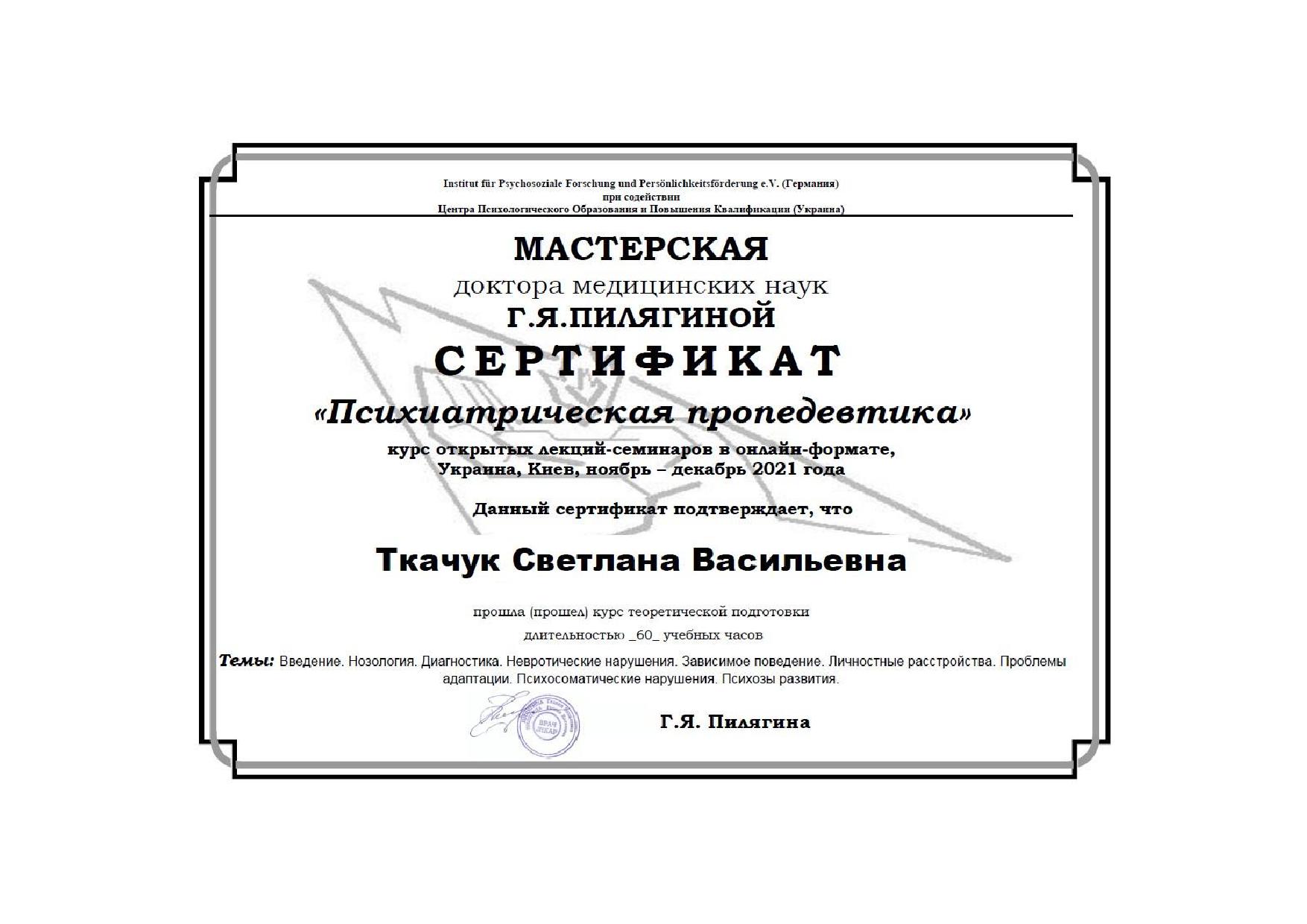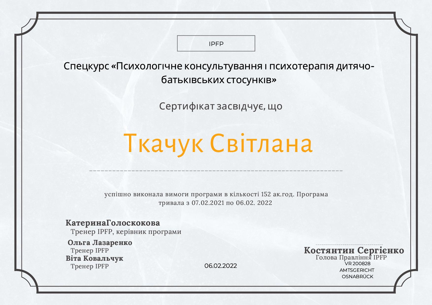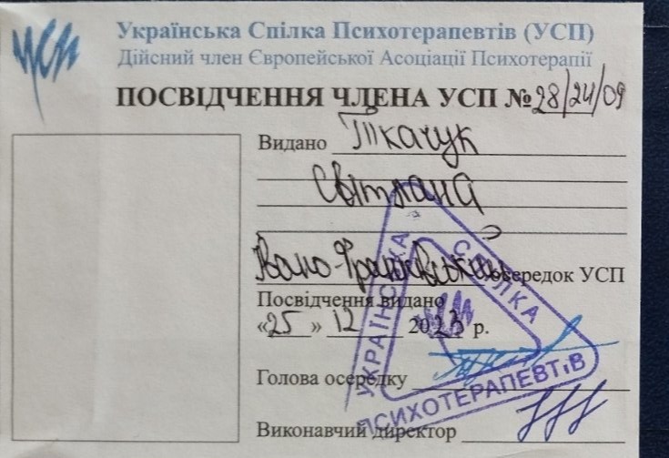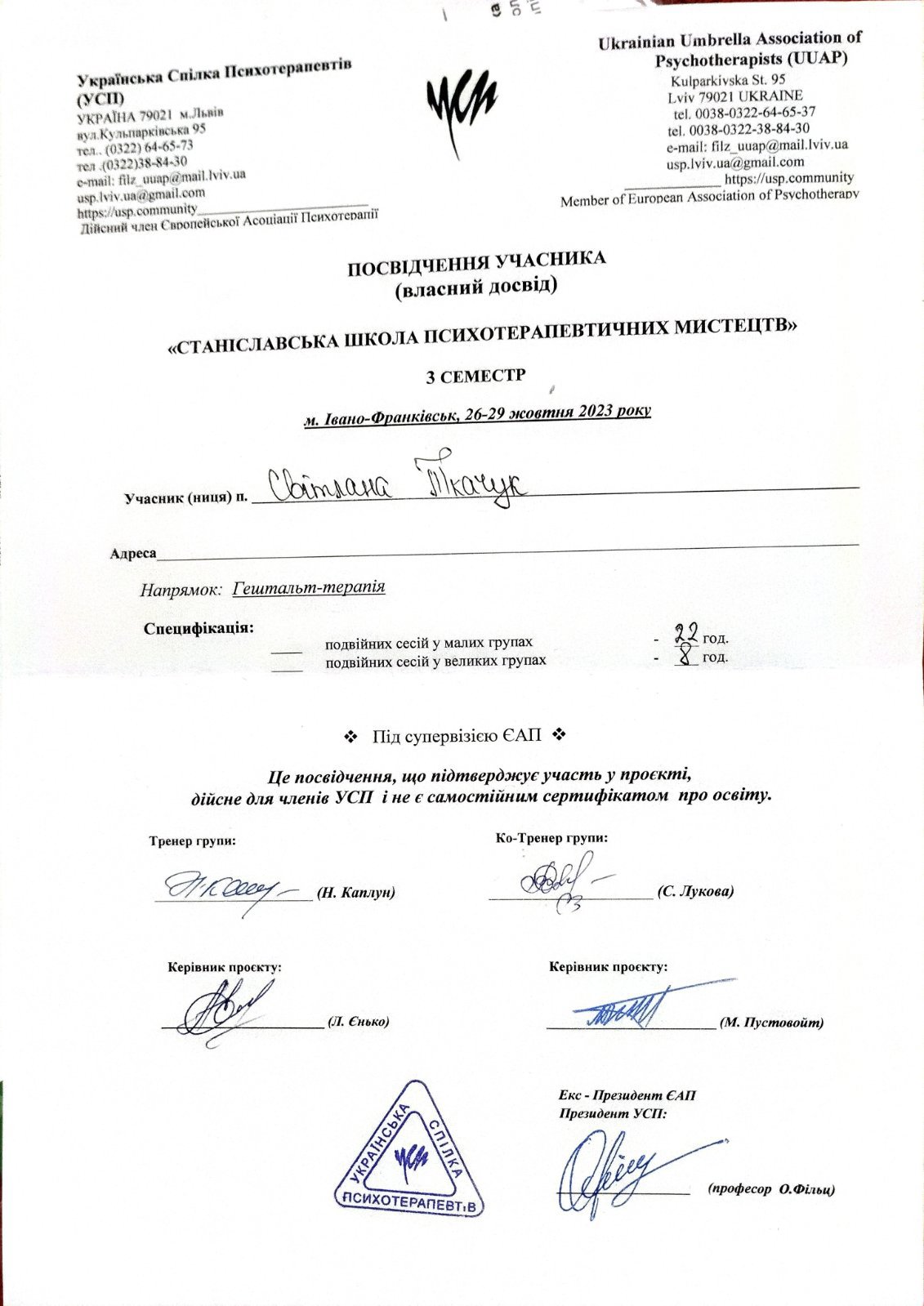 - Institut Psychosoziale Forschung und Persünlichkeitsförderung e.V , Психологічне консультування /гештальт підхід/ 2016-2021)