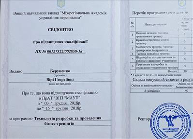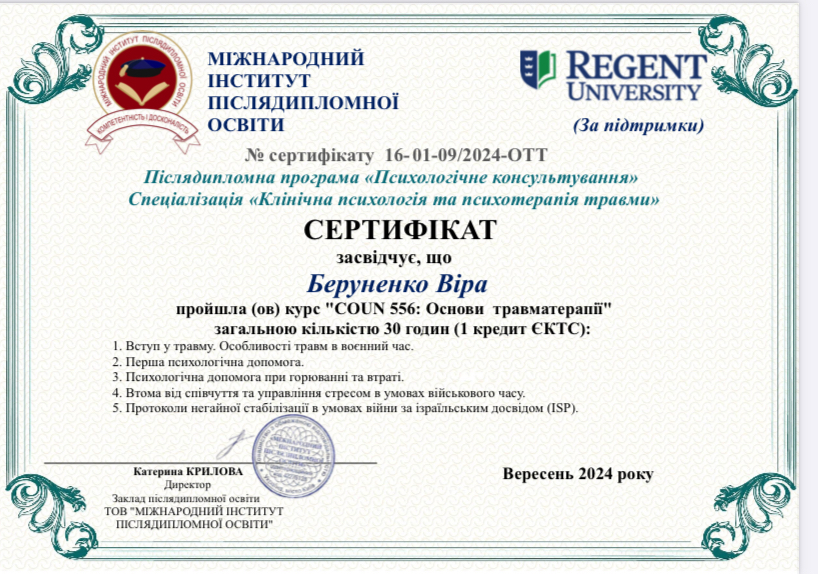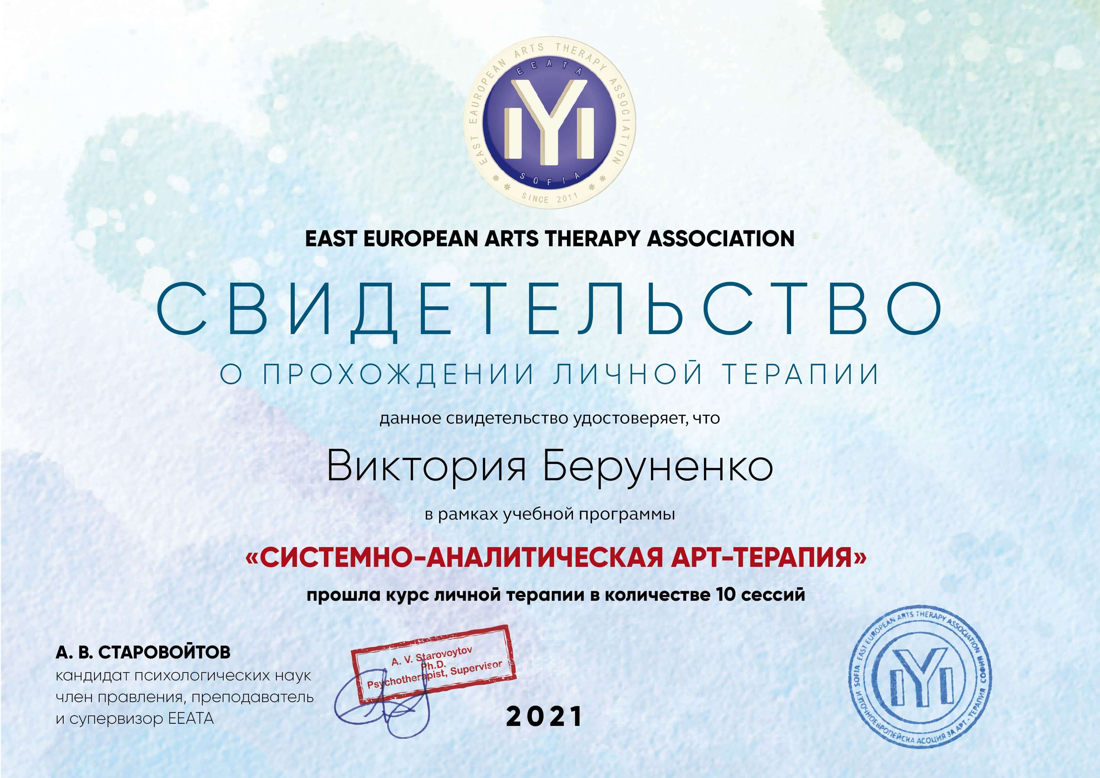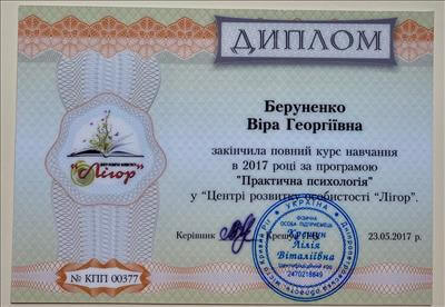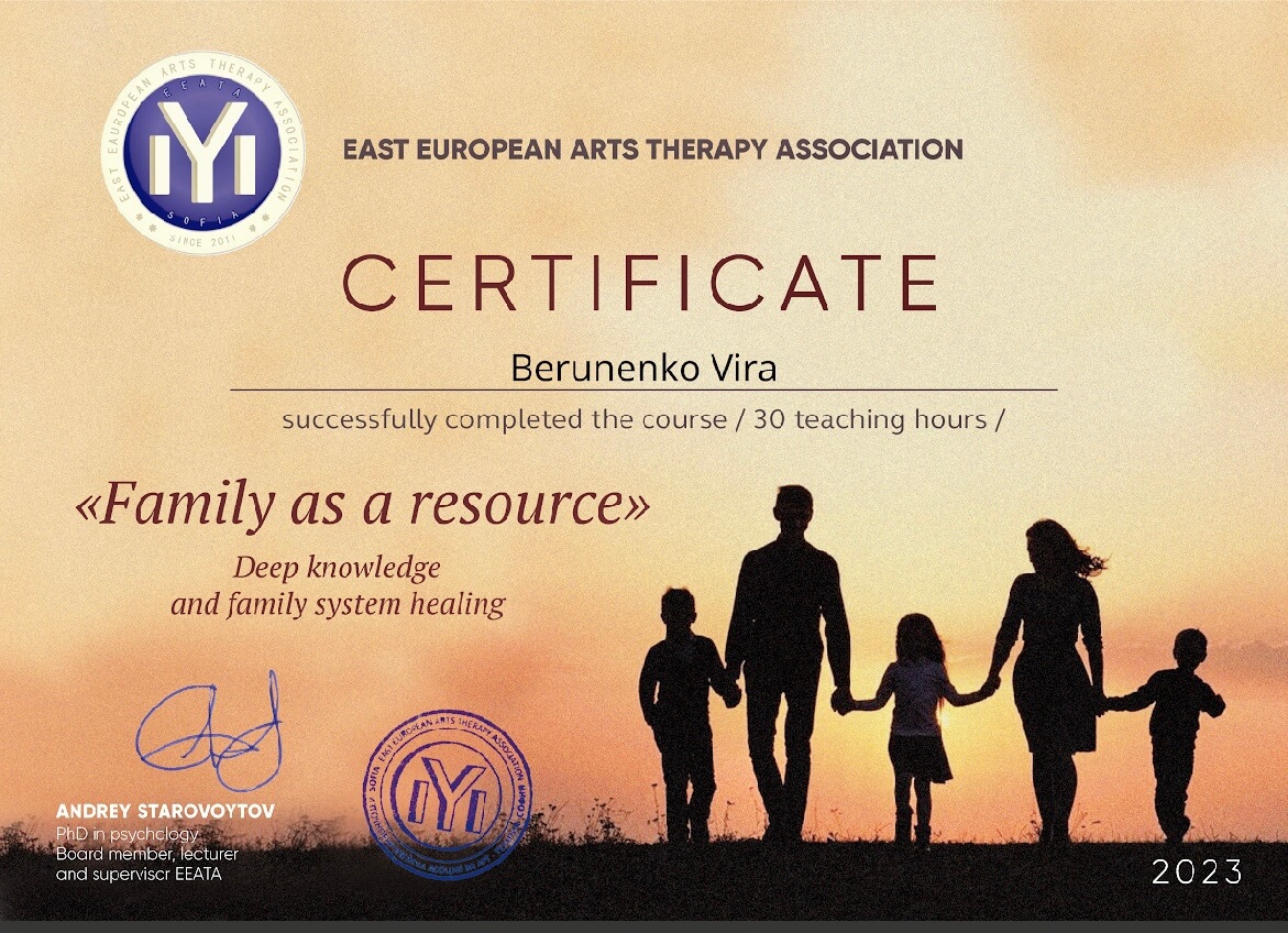Криворізький Педагогічний університет, магістратура, курс з глибинної психосоматика, Арт-Терапія від Східно-Європейської асоціації Арт-Терапії(ЄЕАТА), курс Системно-Аналітична Арт-Терапія