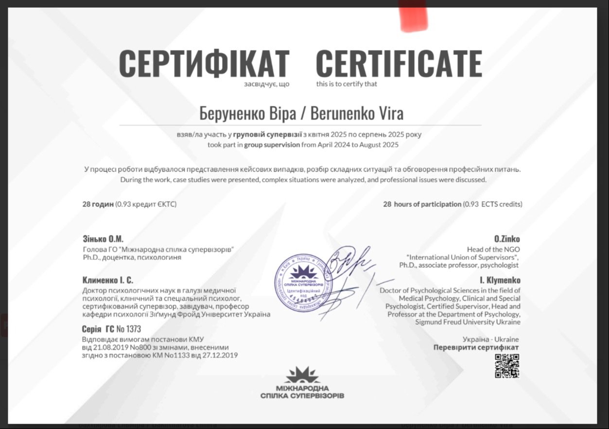 На терапію я прийшла з великою кількістю страхів. Поступово проходячи свою терапію я крок за кроком усвідомлювала свої страхи, знайомилася зі своєю Тінню, Персоною. Я постійно працюю зі своїм супервізором. Ось таким чином, поетапне усвідомлення призводить до того, що з'являється впевненість у собі, йдуть страхи, життя стає яскравішим.
