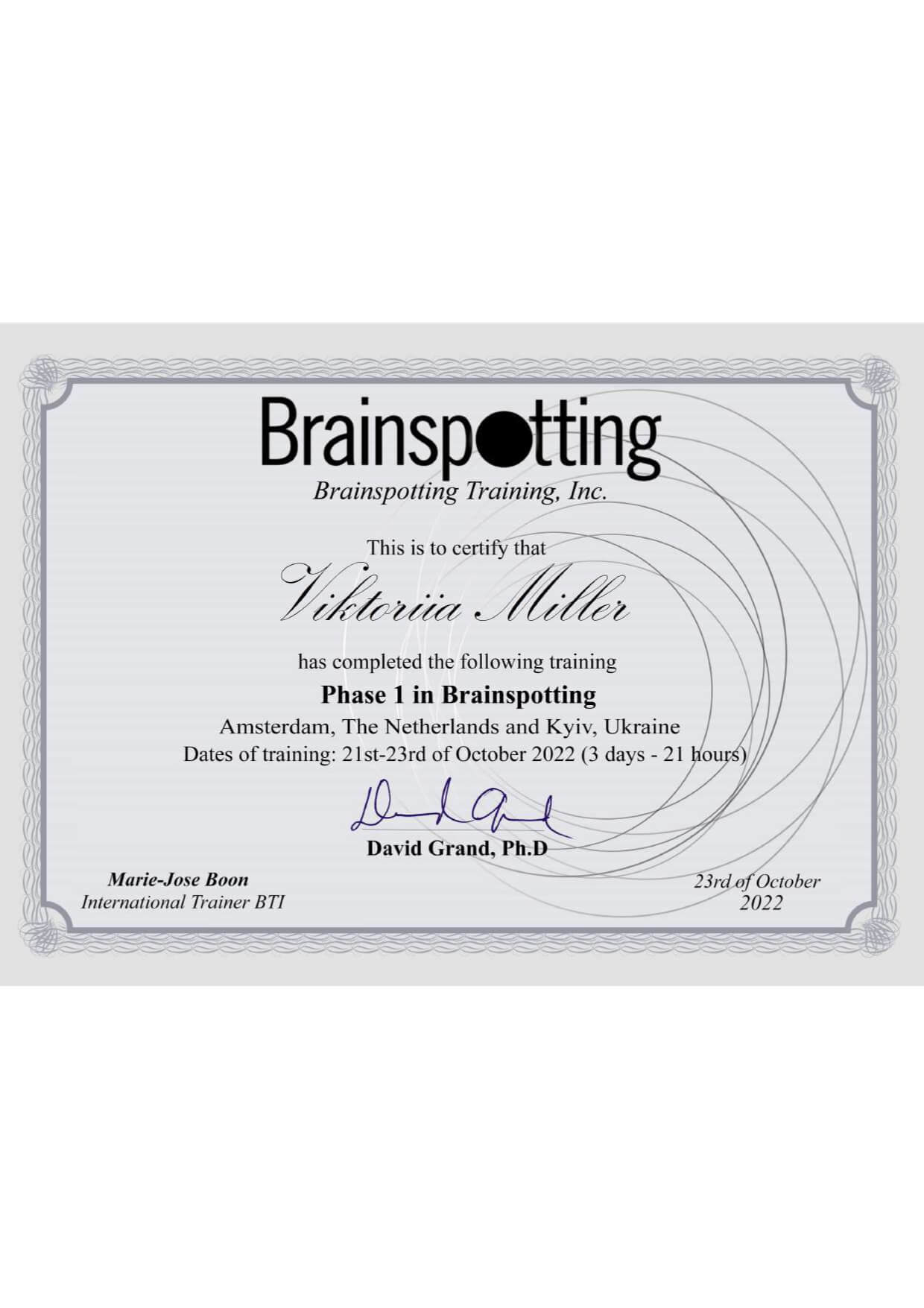 Також пройшла першу ступінь по навчанню Brainspotting ,партнерство Україна-Нідерланди.