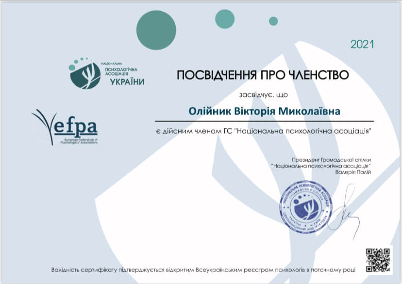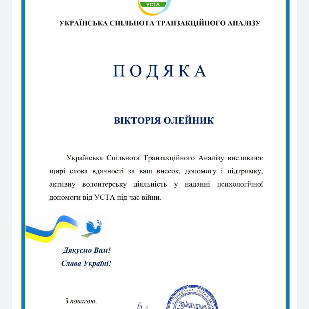 Мене звуть Вікторія, психолог, психотерапевт. Тривалий час співпрацювала із центрами психосоціальної реабілітації для узалежнених людей. Почала з волонтерської діяльності, паралельно здобуючи освіту. Після отримання диплома у 2017 році, продовжила працювати у реабілітацвйному центрі психологом та почала набирати приватну практику. При цьому навчалася у 4-річній програмі поглибленого курсу транзактний аналіз у психотерапії, який закінчила у 2019 році. На сьогодні веду приватний прийом. Я є членом УСТА – Української спільноти транзактного аналізу та НПА (Національна Психологічна Асоціація), наразі являюсь модераторкою дивізіону "Аддиктологія".