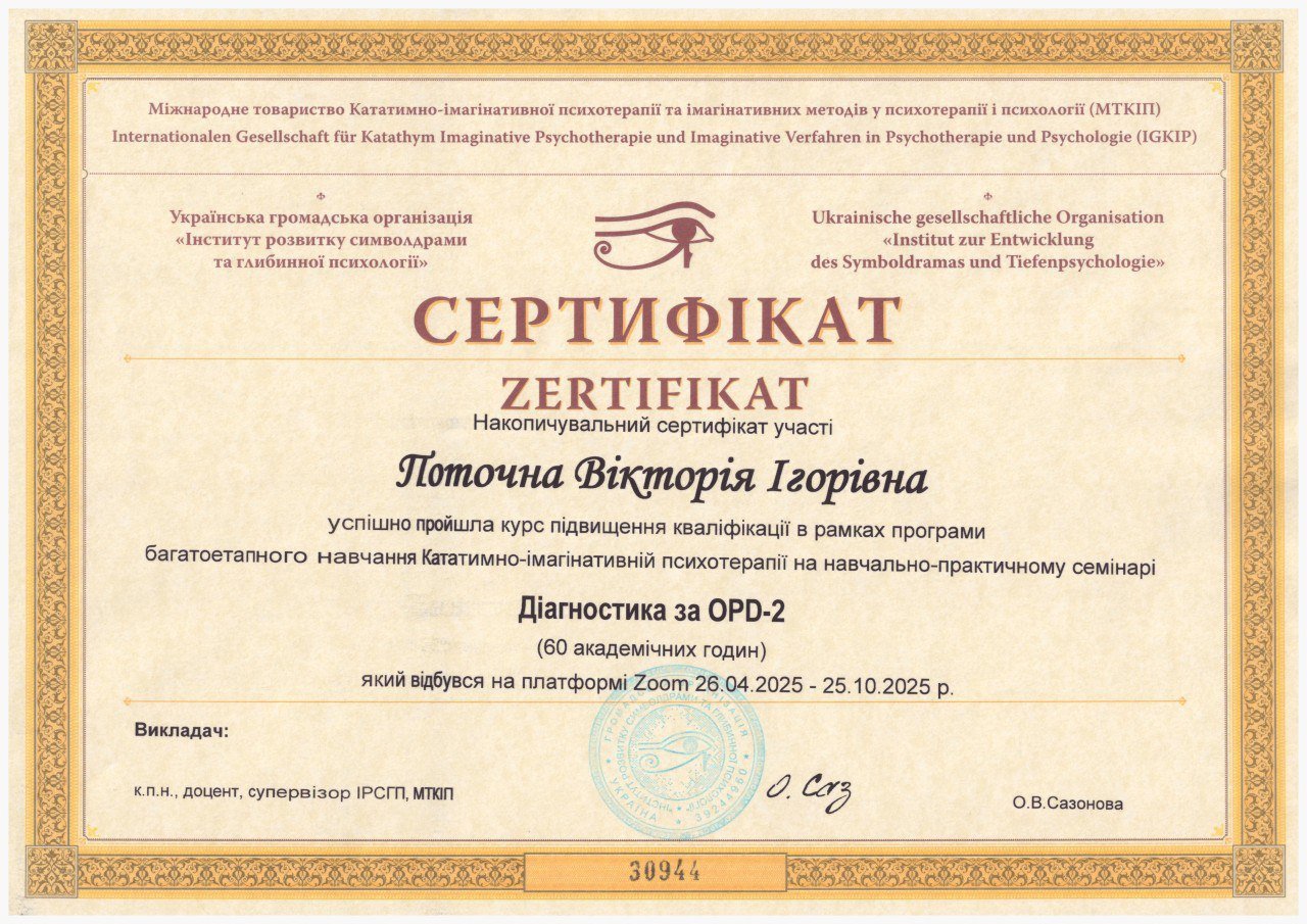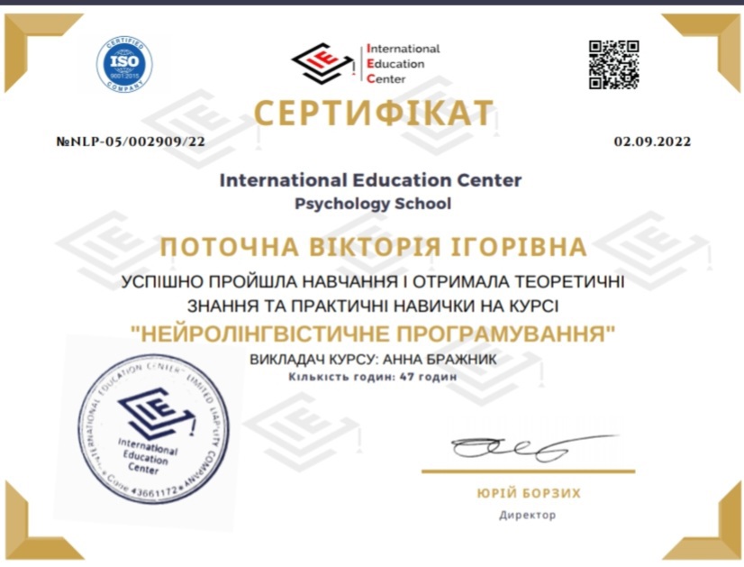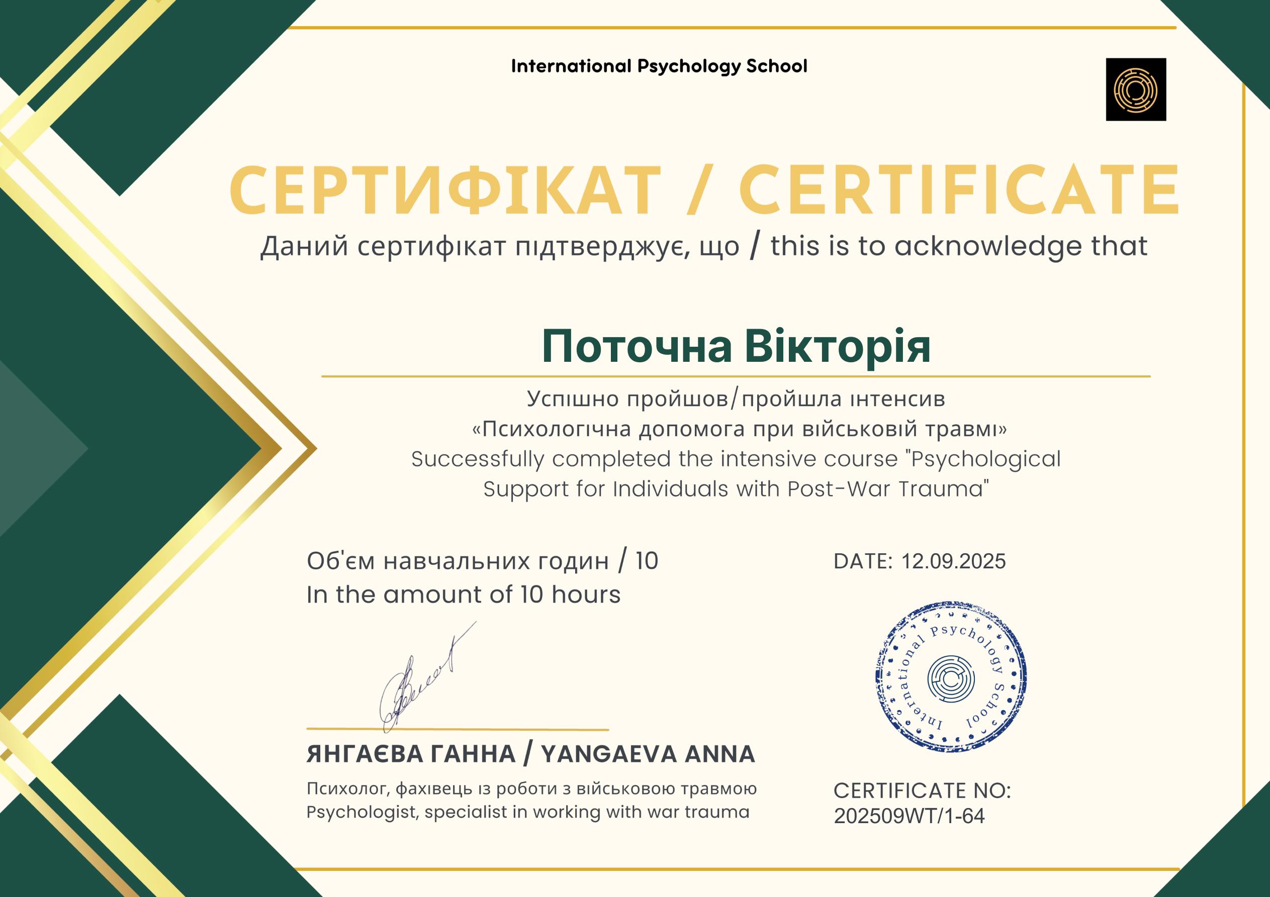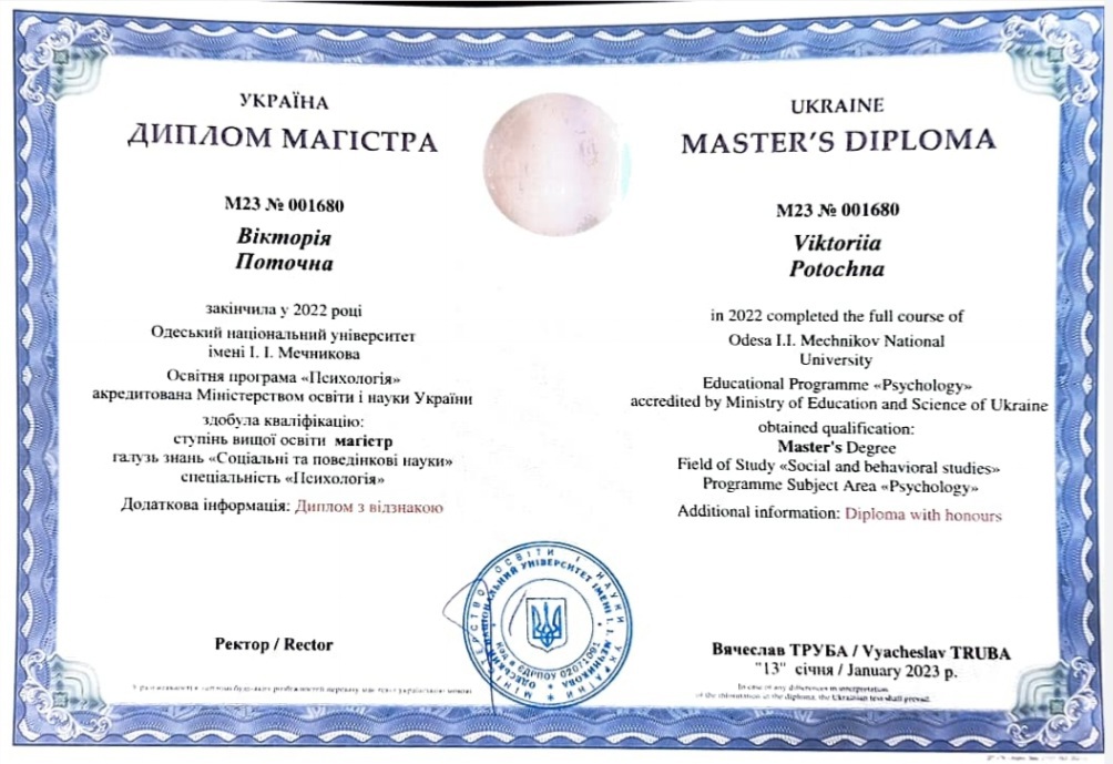 На постійній основі проходжу власну психотерапію, тому я розумію, як це може бути складно відкриватися та змінювати власне життя, але я готова в цьому допомогти та підтримати. Також маю постійну супервізію й удосконалюю свої знання та навички на курсах та семінарах.