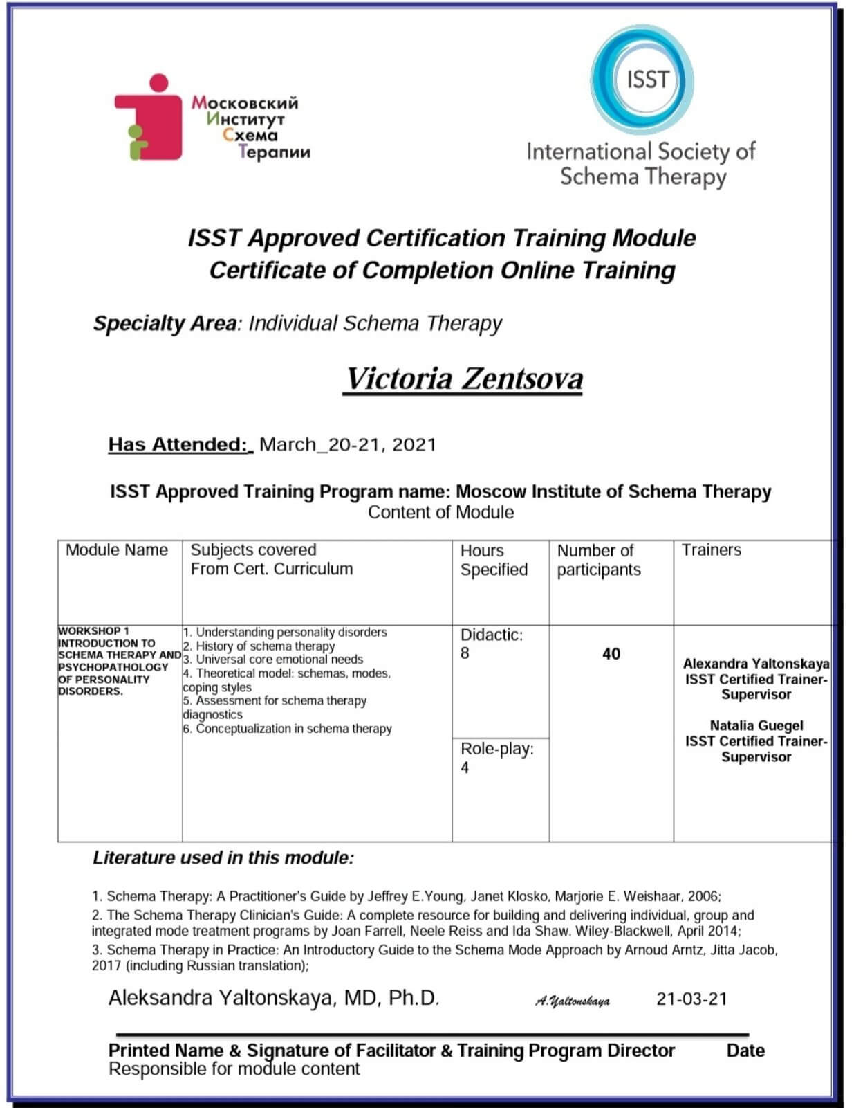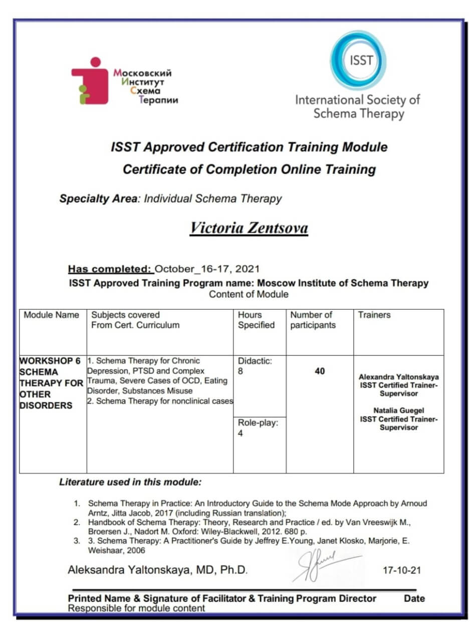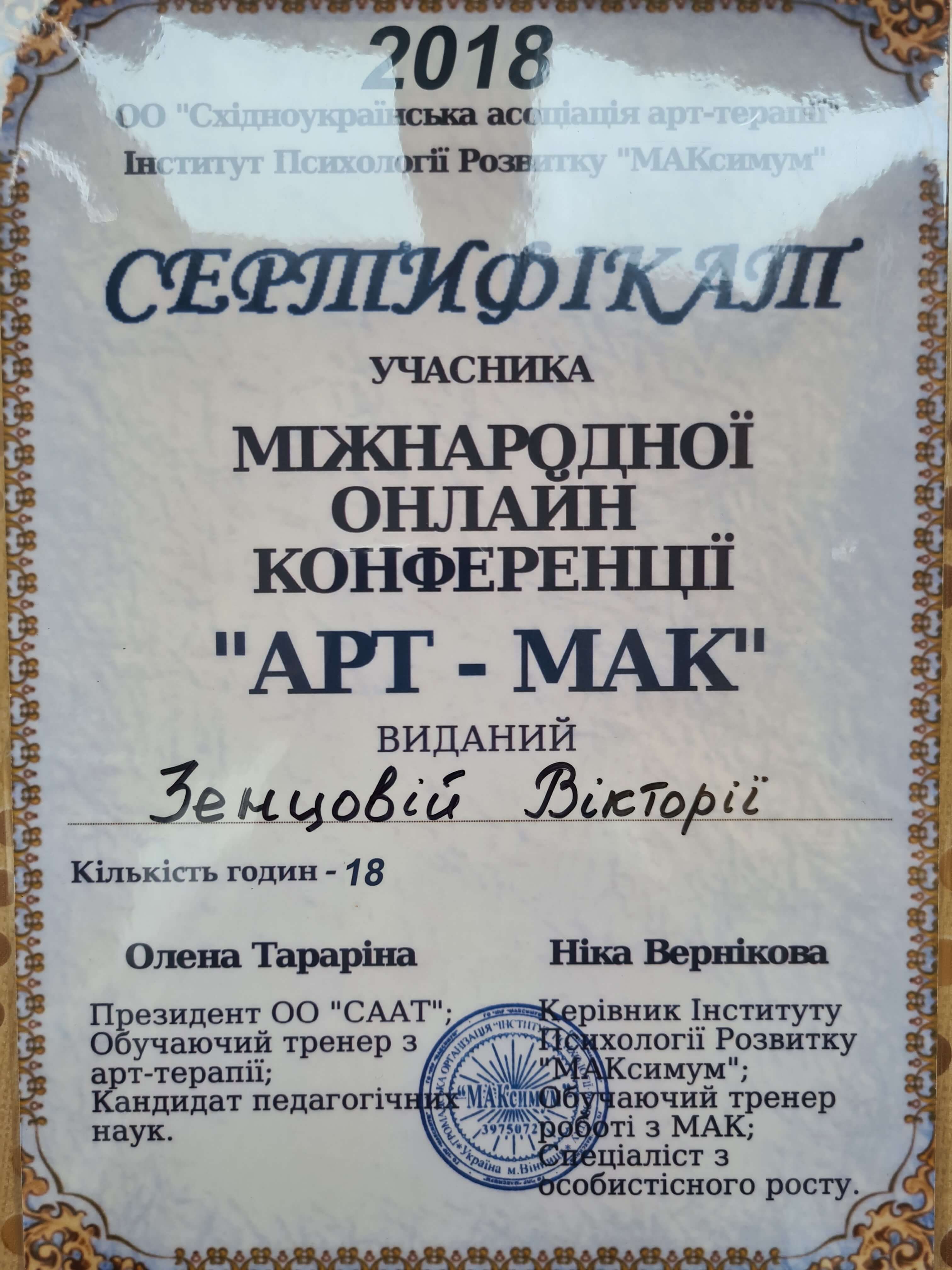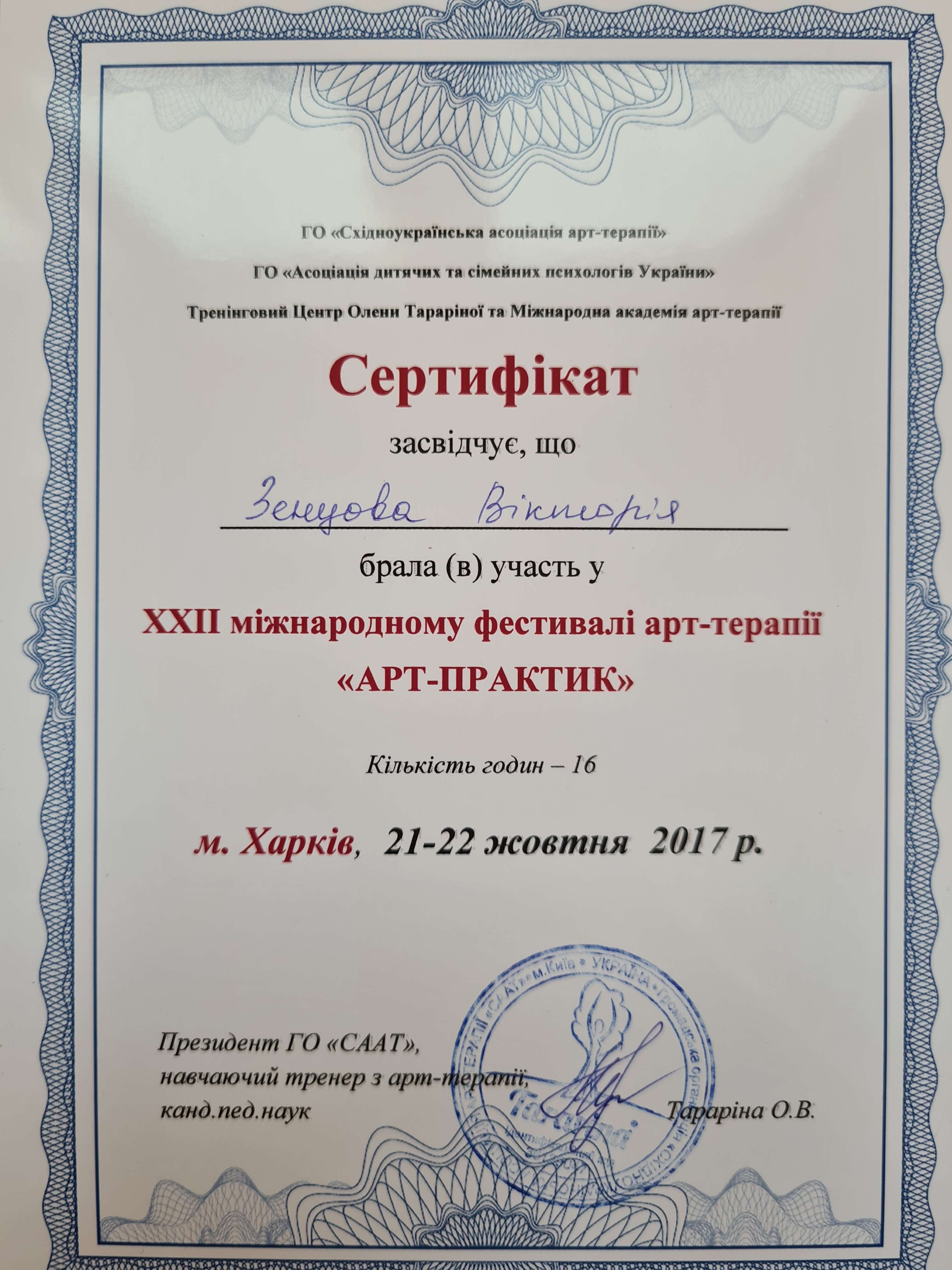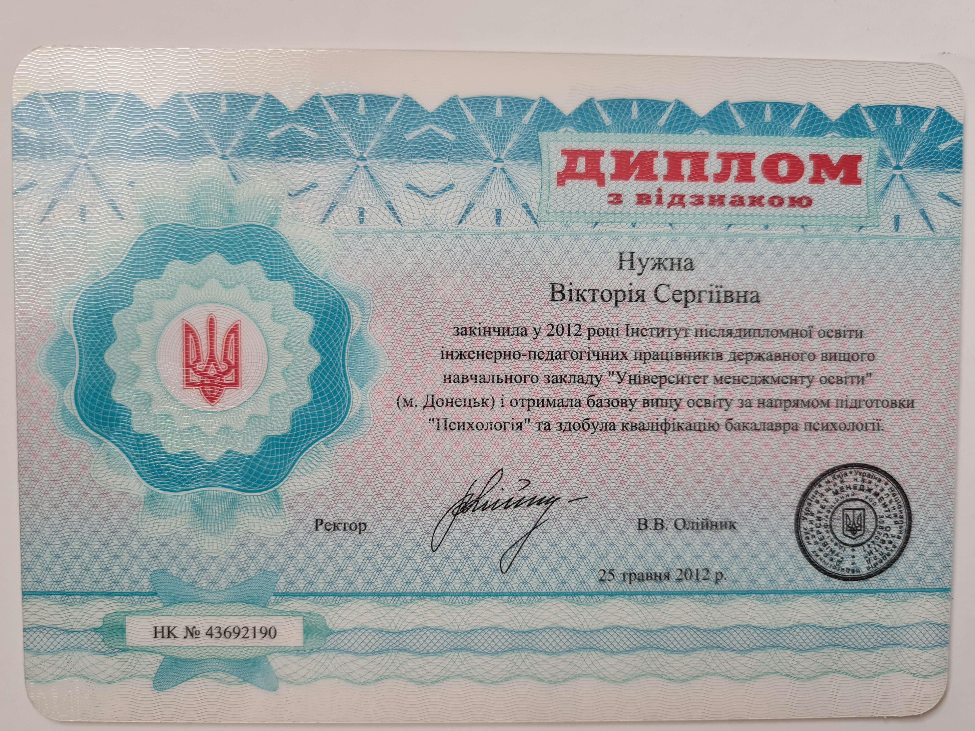 Я практичний психолог, арт-терапевт, кризовий та сімейний психолог, фасилітатор міжнародної програми розвитку дитини (ICDP). Проходжу навчання за схема-терапією.