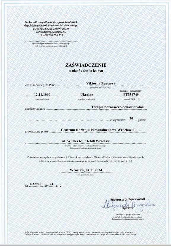 У психотерапію я прийшла у момент здобуття вищої освіти. На краще змінилося моє розуміння себе та своїх внутрішніх процесів. Все це допомагає краще розуміти випадок клієнта та допомагає процесу терапії.