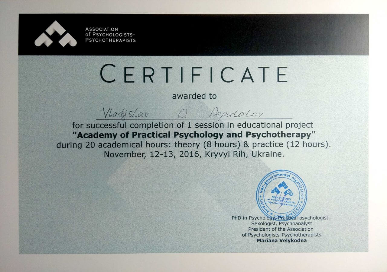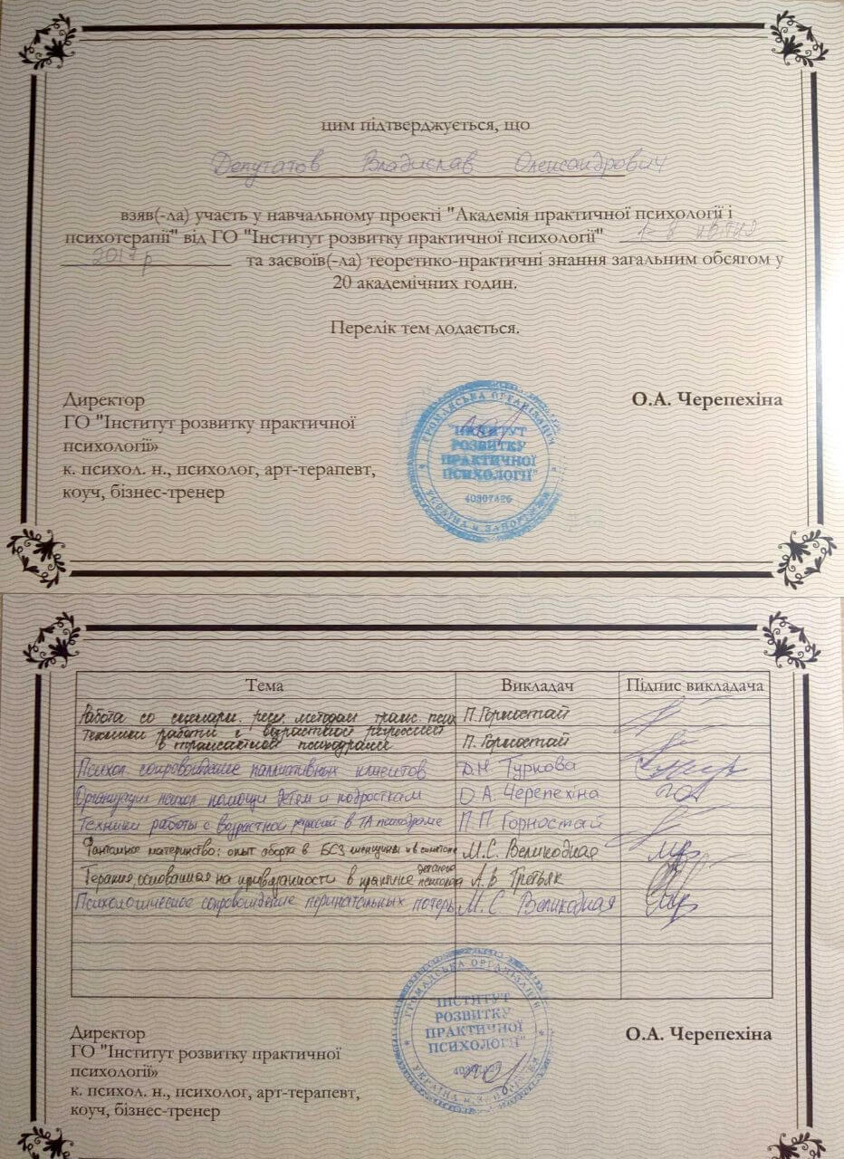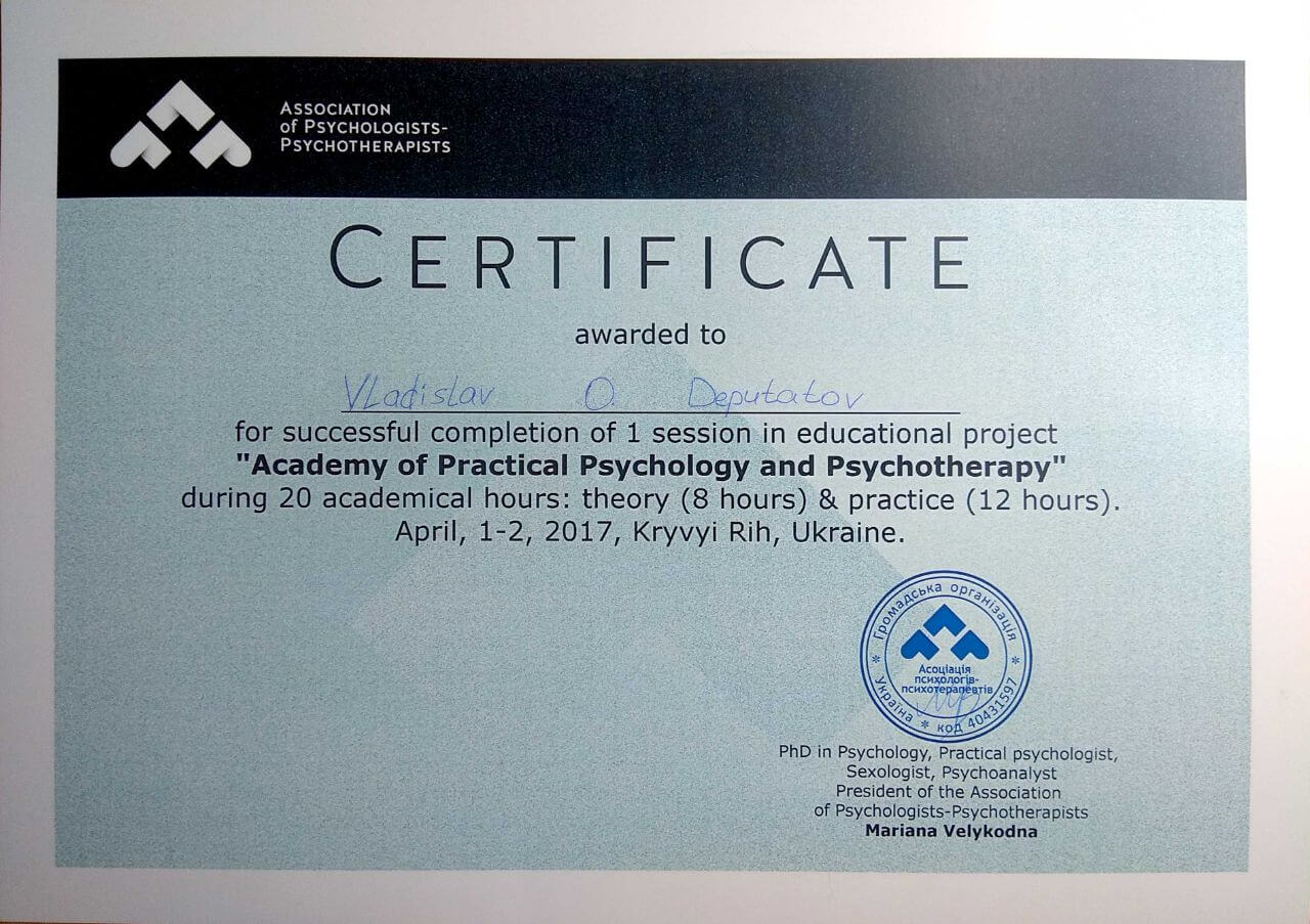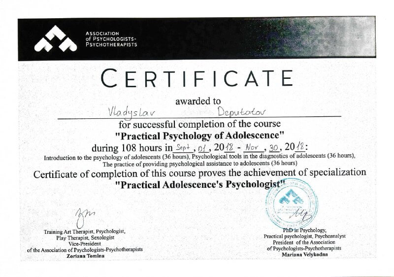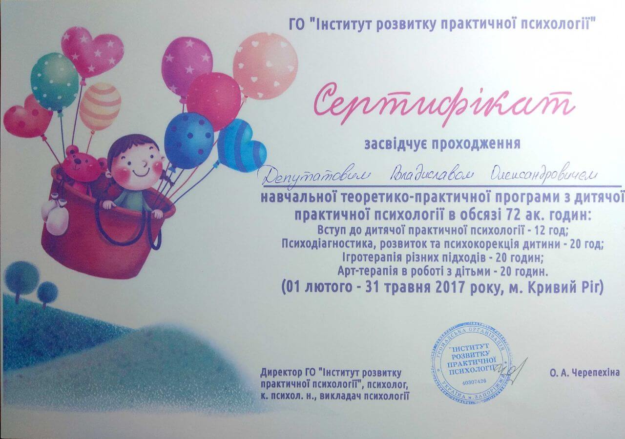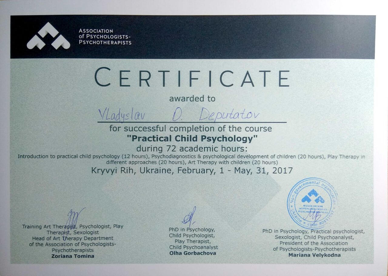 Сертифікати про проходження додаткового навчання можете побачити у цьому профілі. Основні: когнітивно-поведінкова терапія, психоаналітична терапія дітей та підлітків.