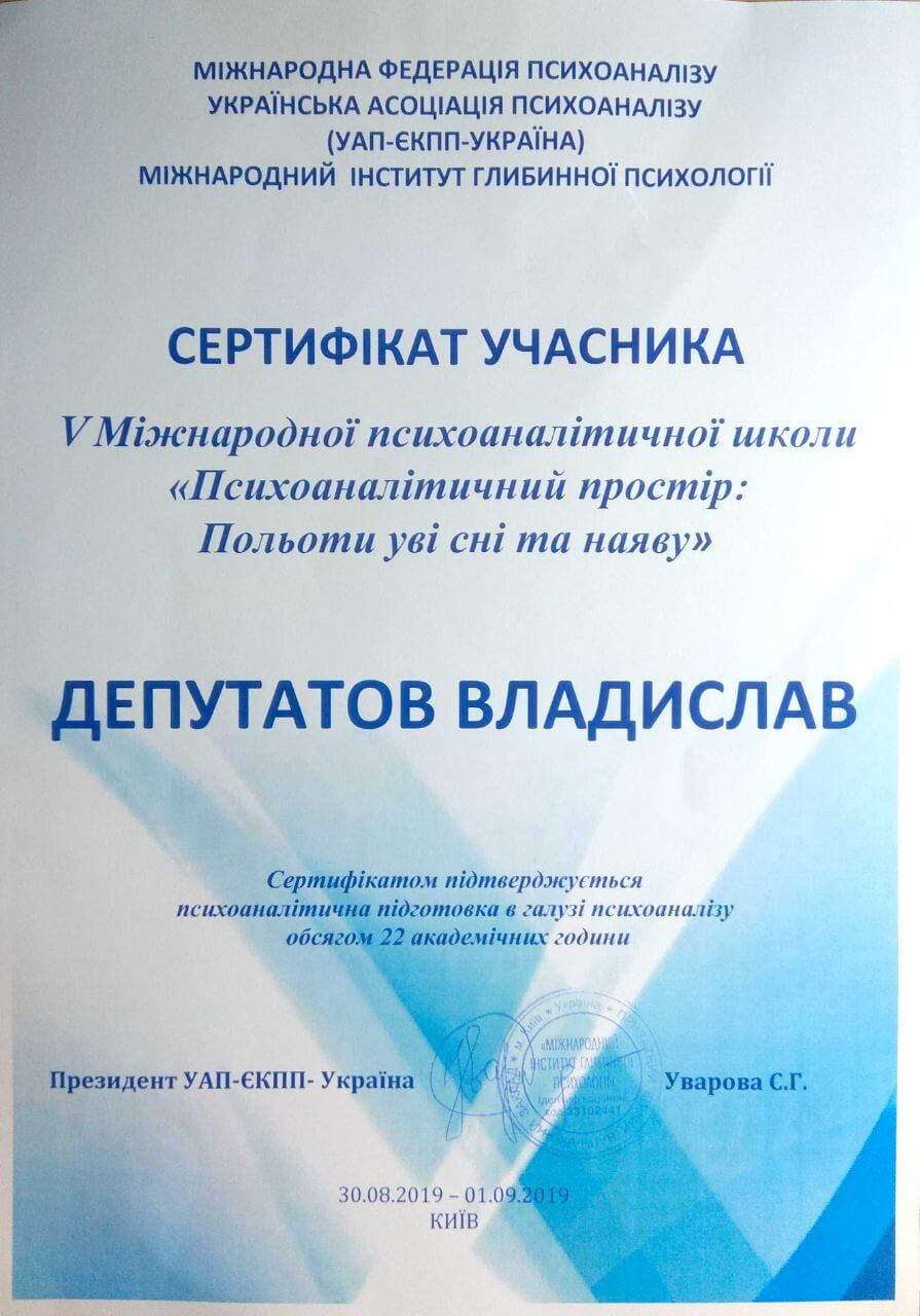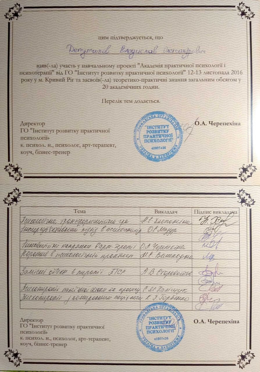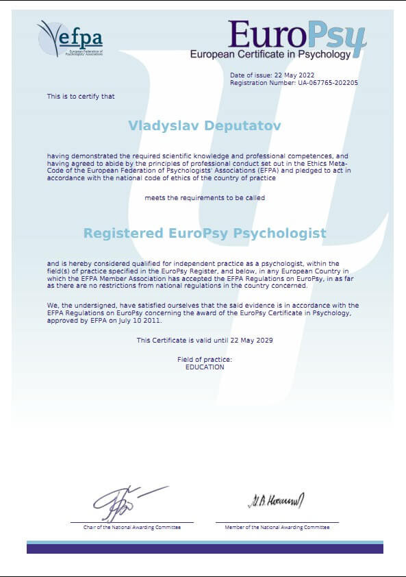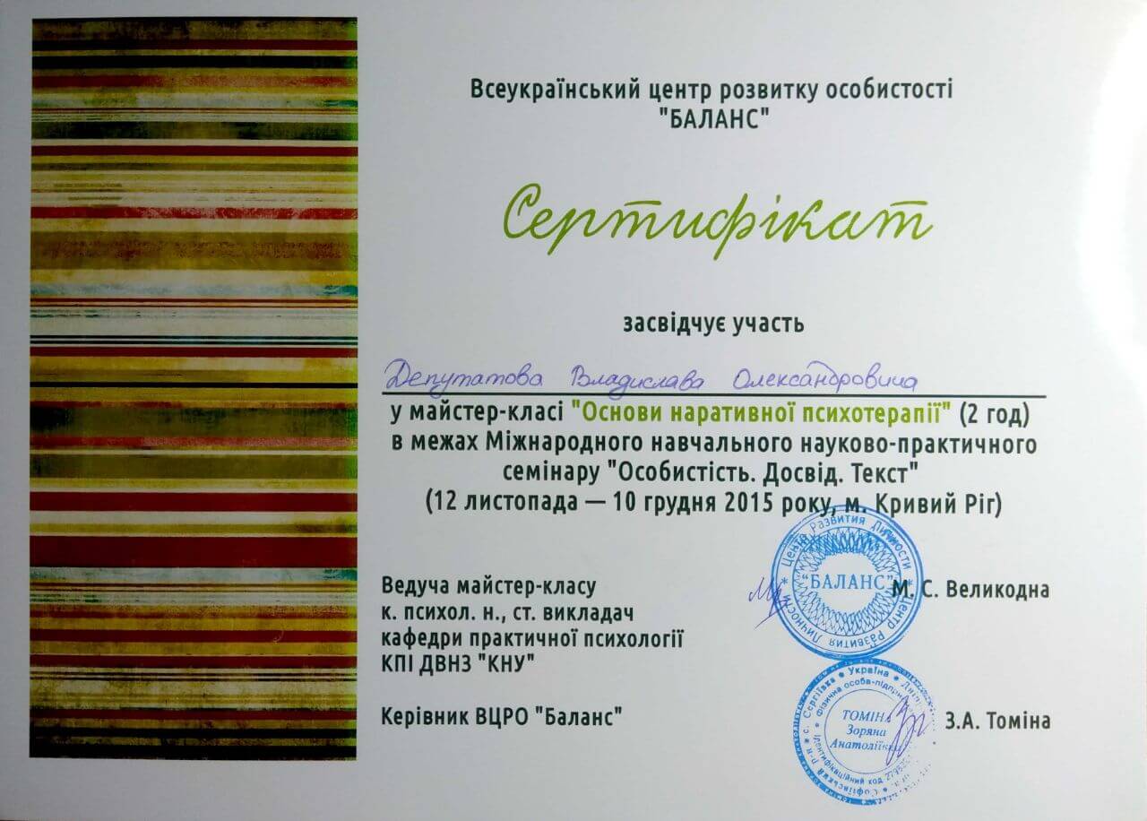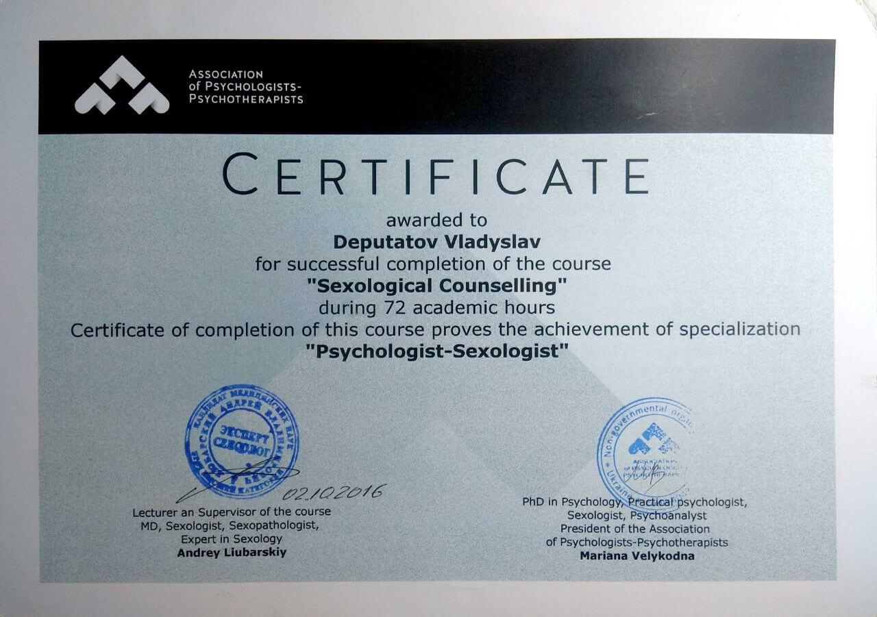 Сертифікати про проходження додаткового навчання можете побачити у цьому профілі. Основні: когнітивно-поведінкова терапія, психоаналітична терапія дітей та підлітків.