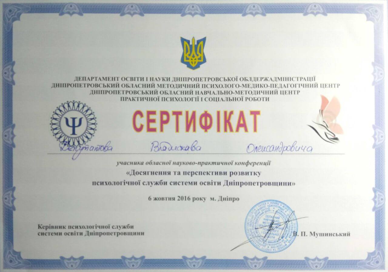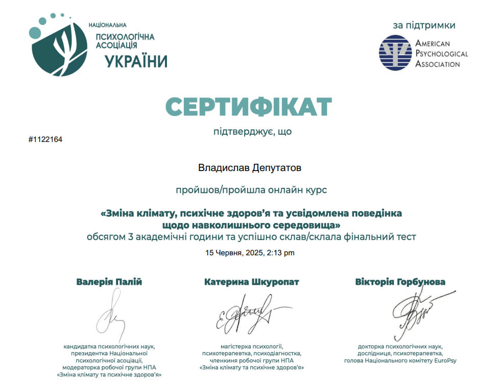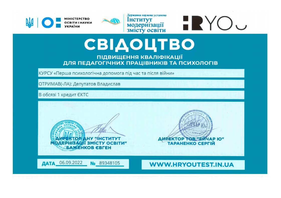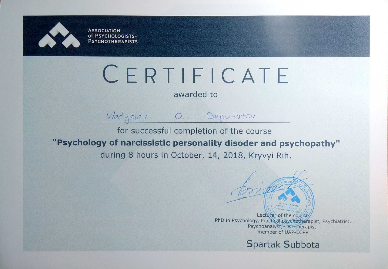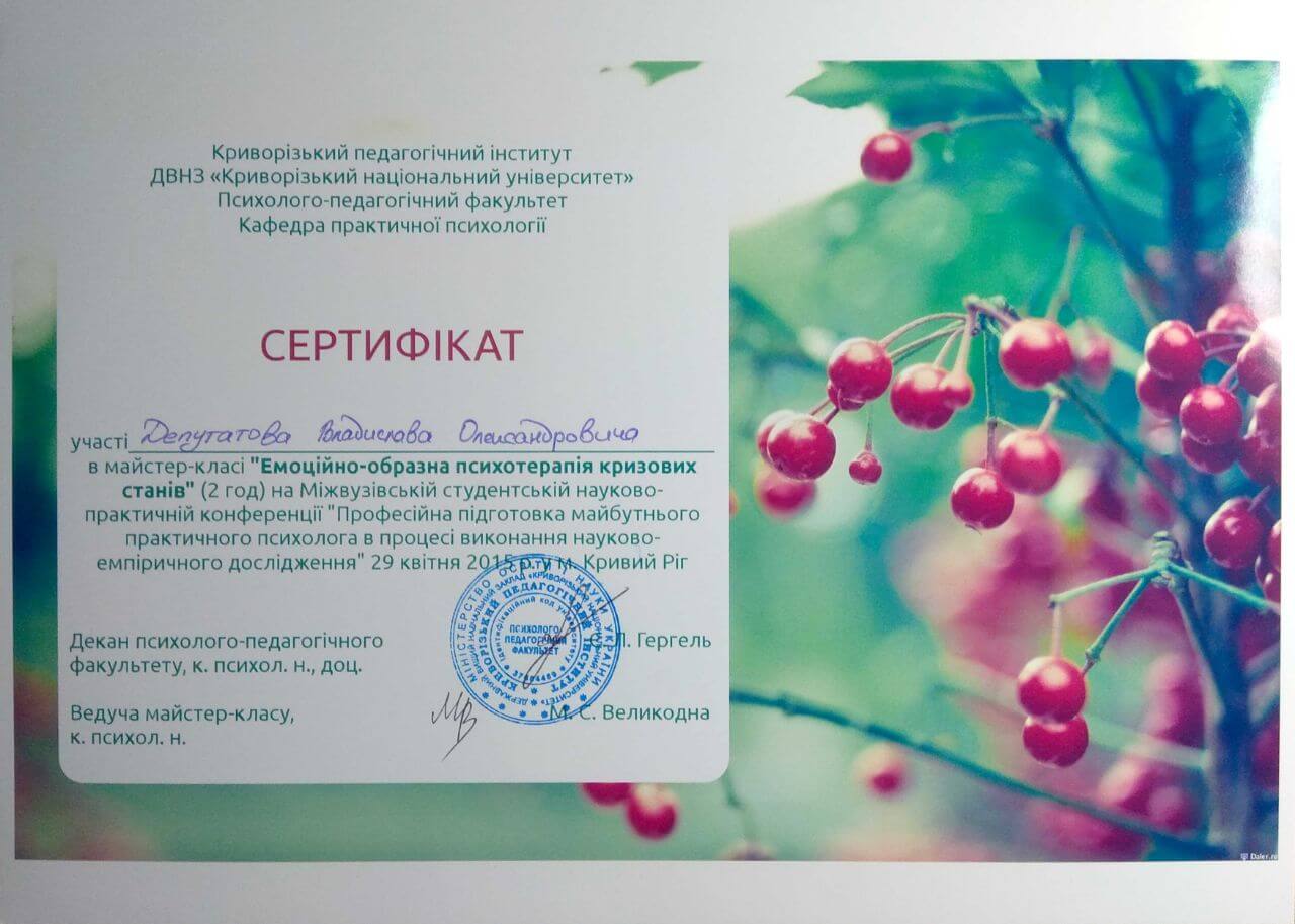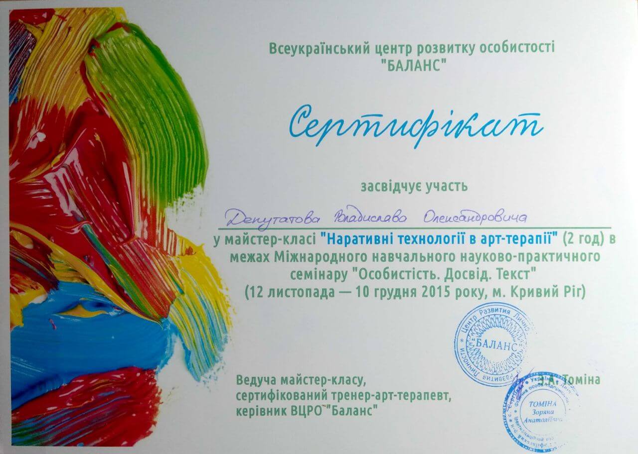 Сертифікати про проходження додаткового навчання можете побачити у цьому профілі. Основні: когнітивно-поведінкова терапія, психоаналітична терапія дітей та підлітків.