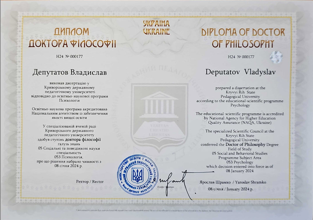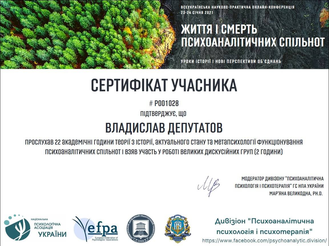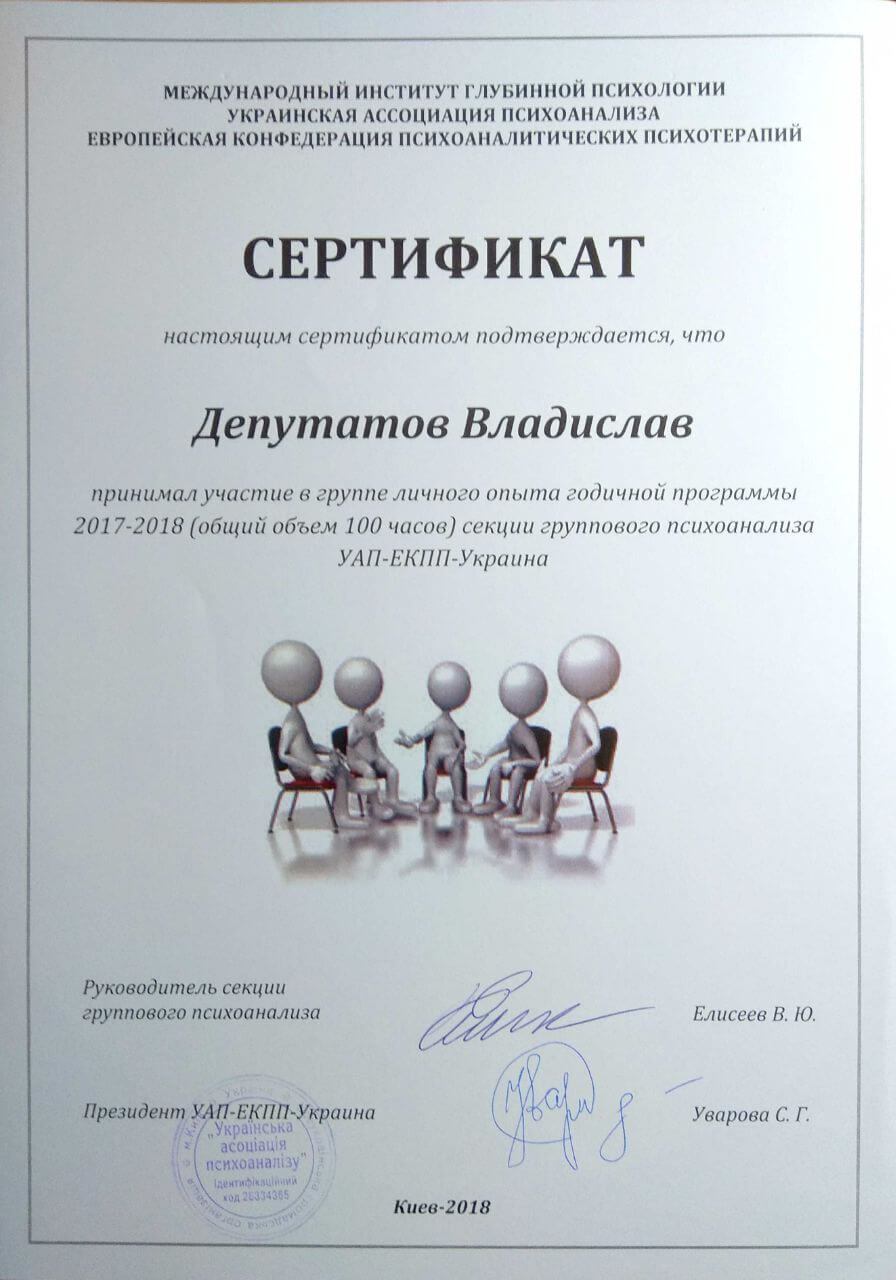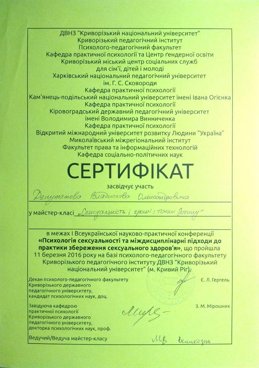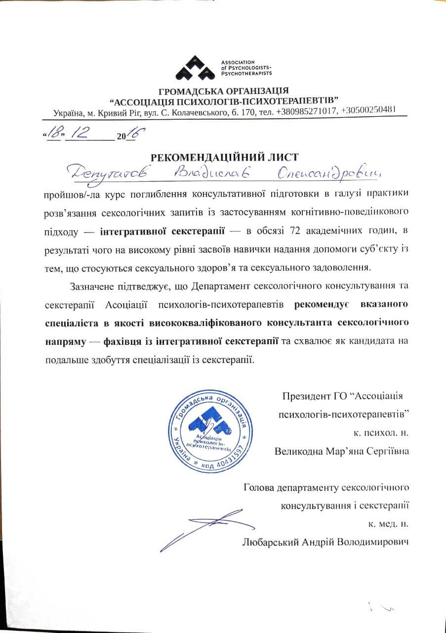 Сертифікати про проходження додаткового навчання можете побачити у цьому профілі. Основні: когнітивно-поведінкова терапія, психоаналітична терапія дітей та підлітків.