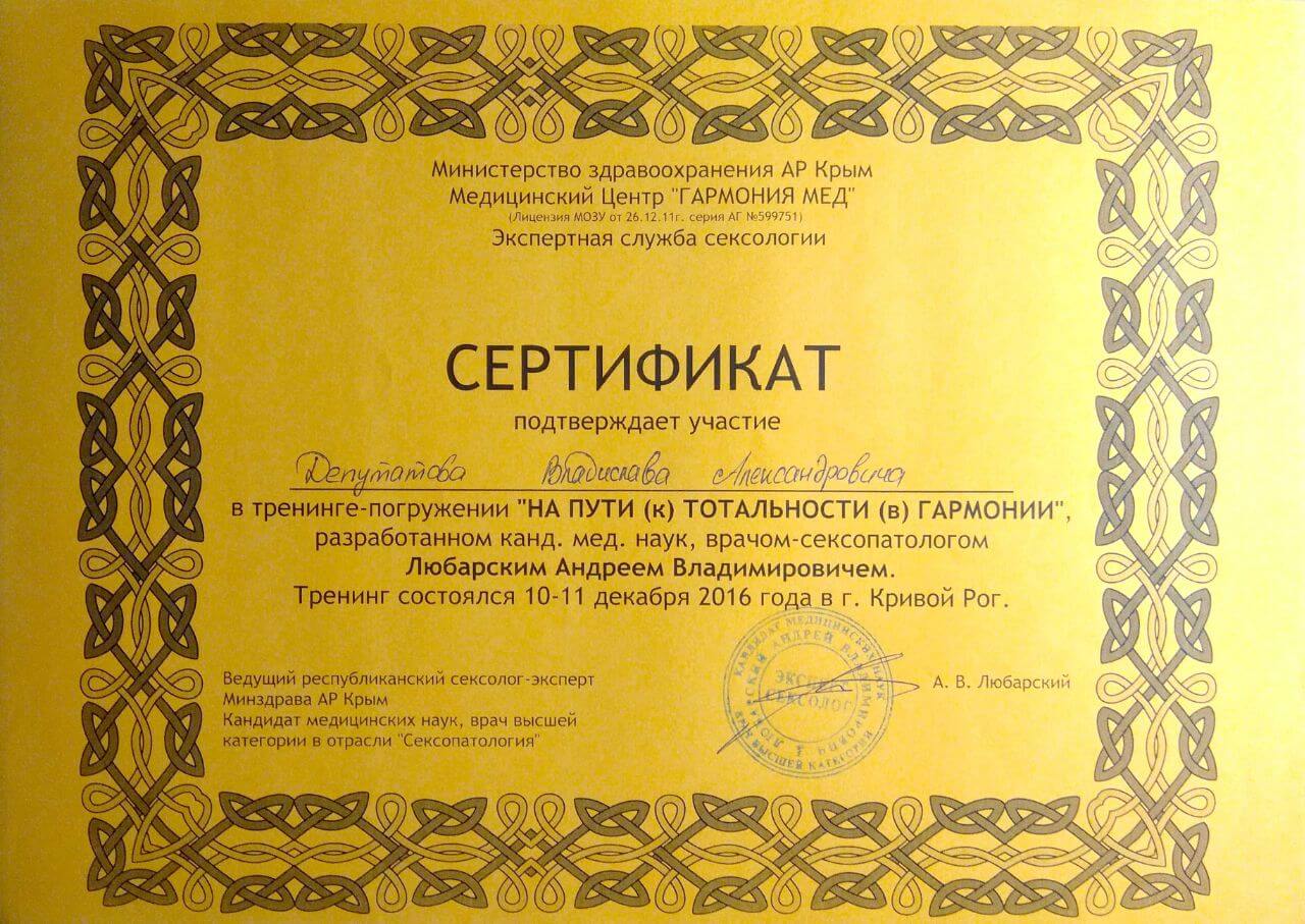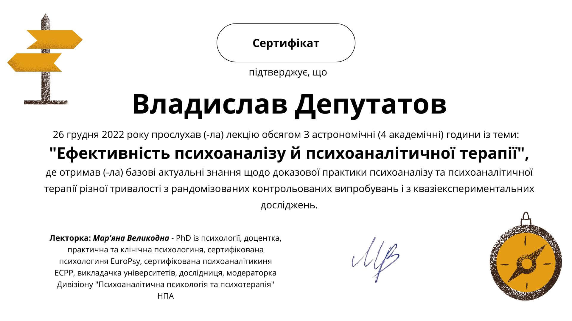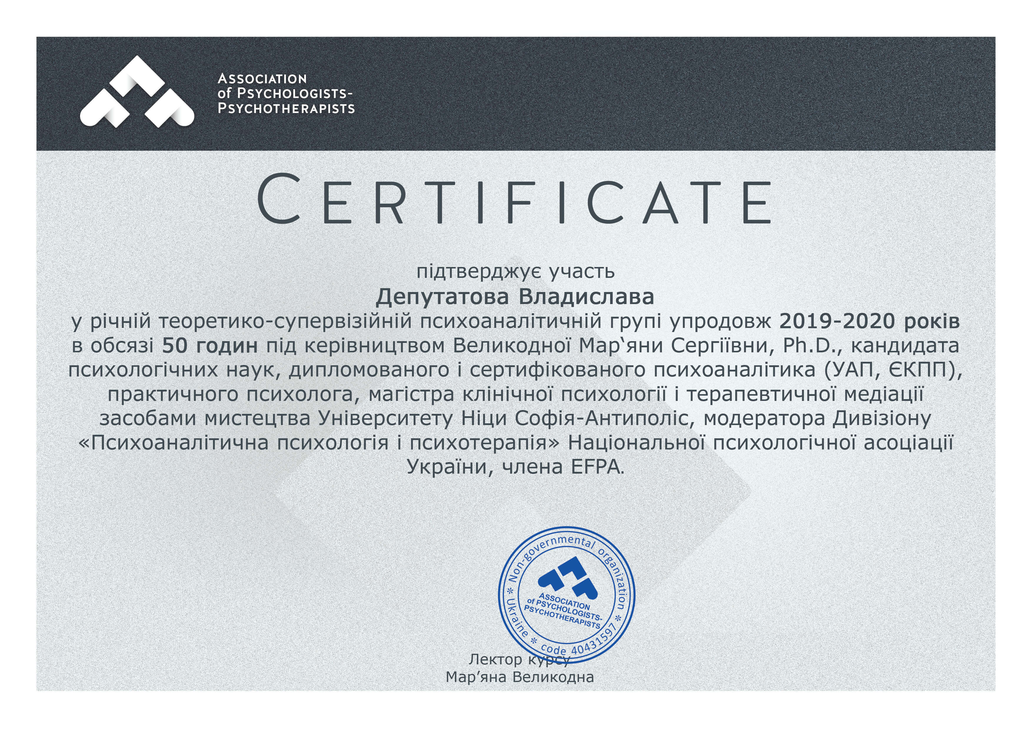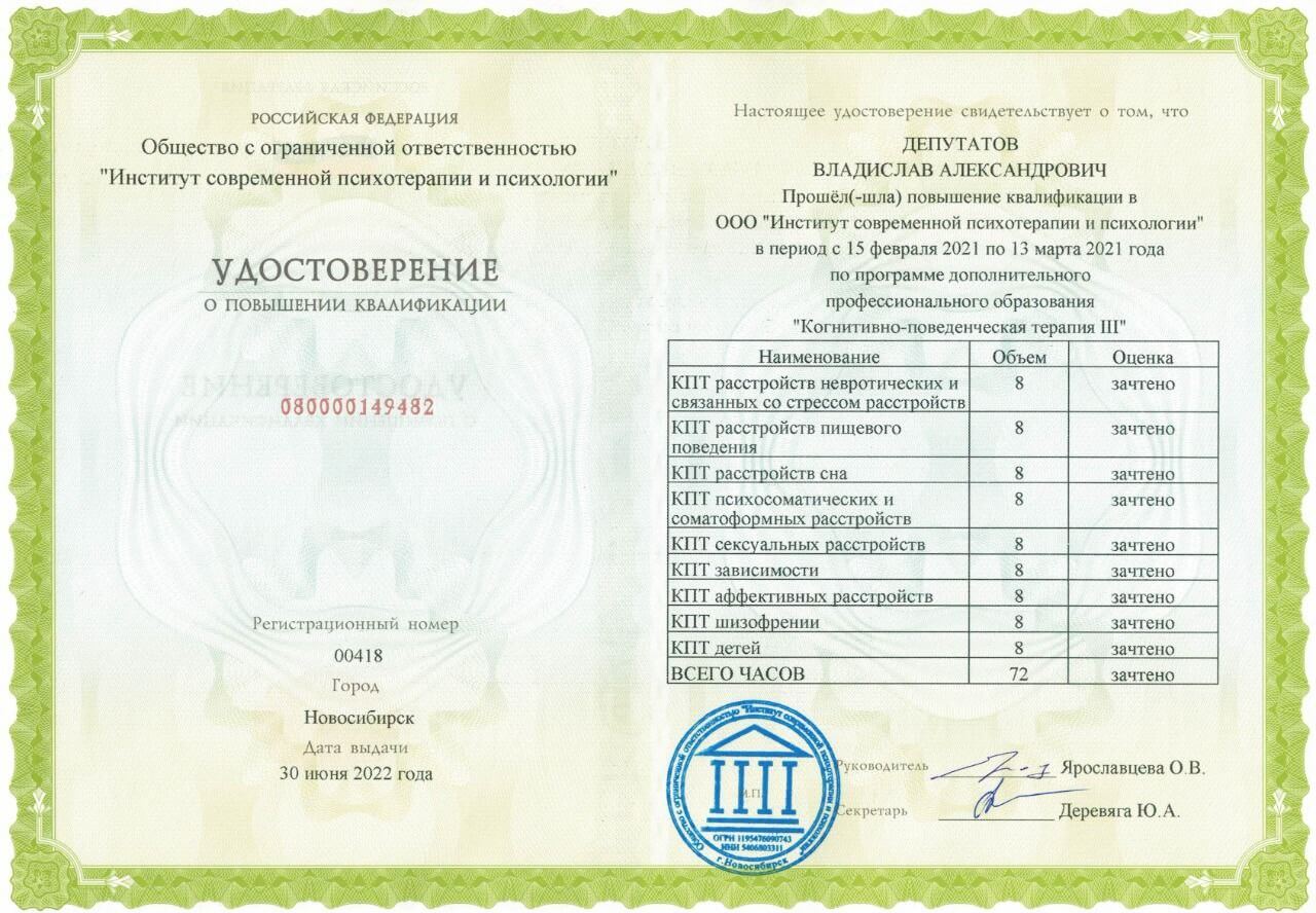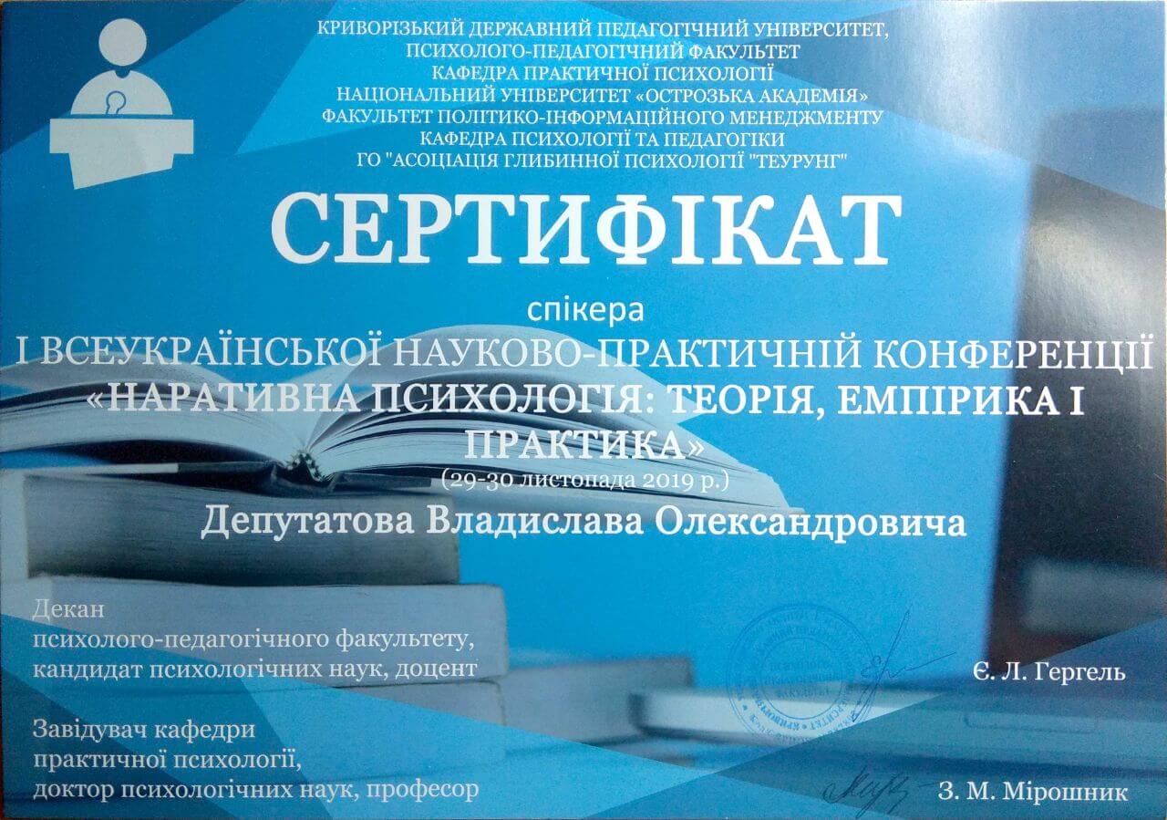 Сертифікати про проходження додаткового навчання можете побачити у цьому профілі. Основні: когнітивно-поведінкова терапія, психоаналітична терапія дітей та підлітків.