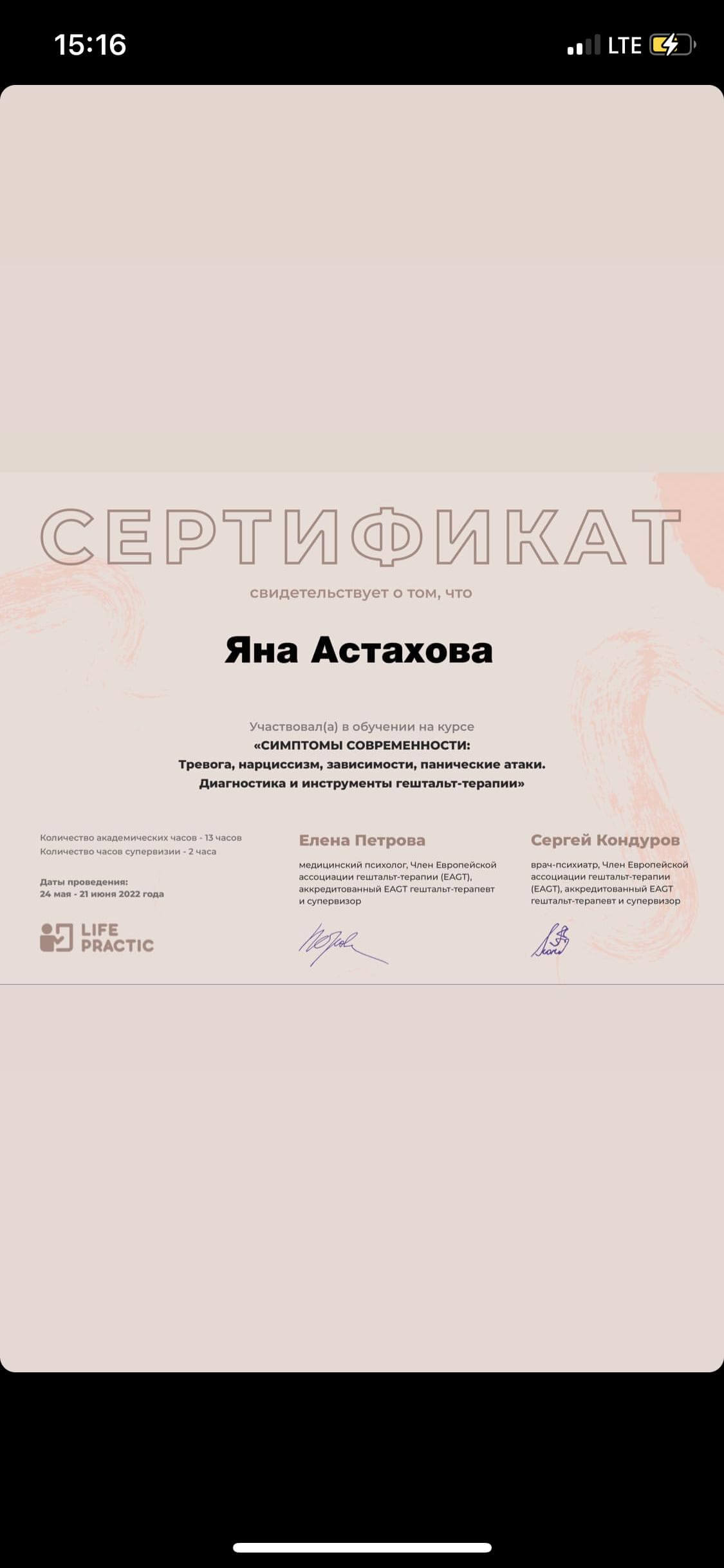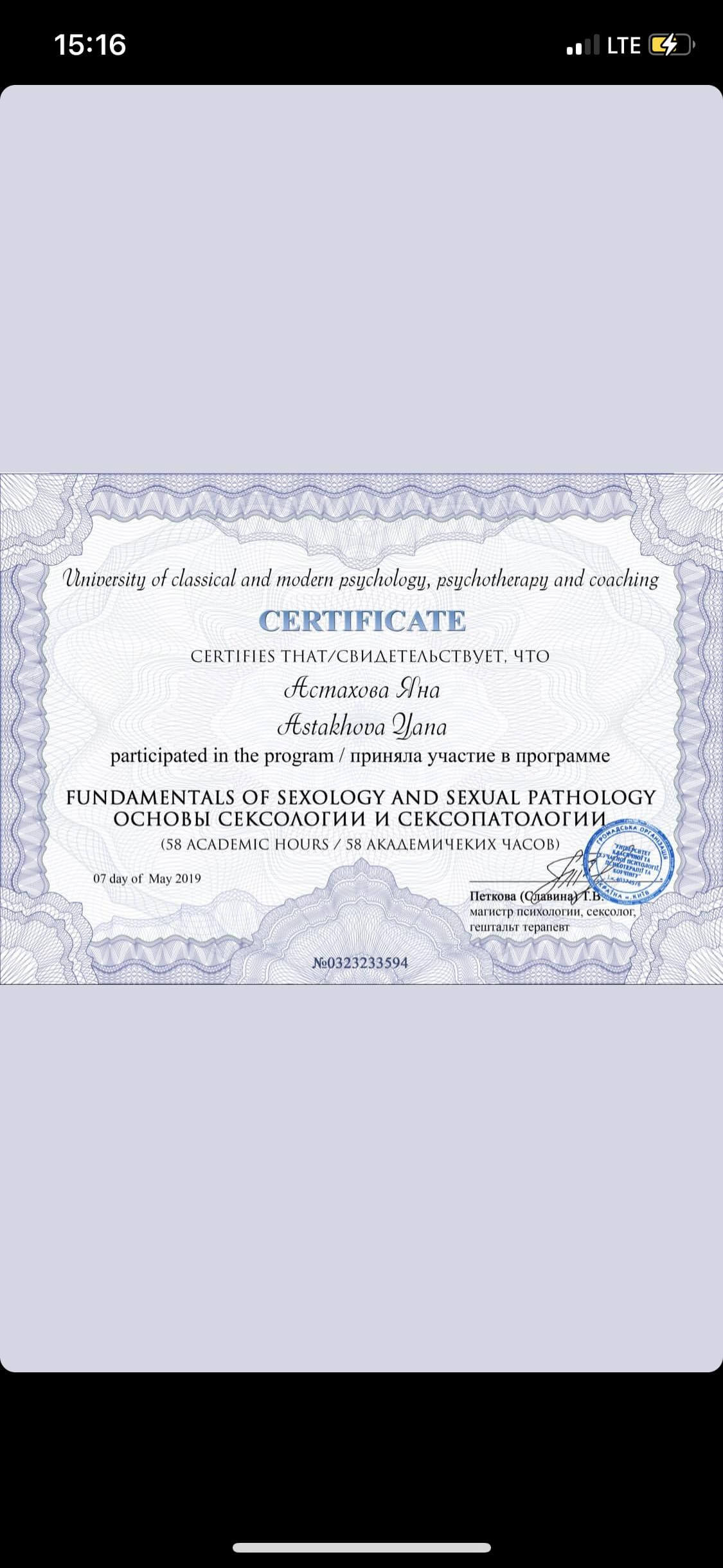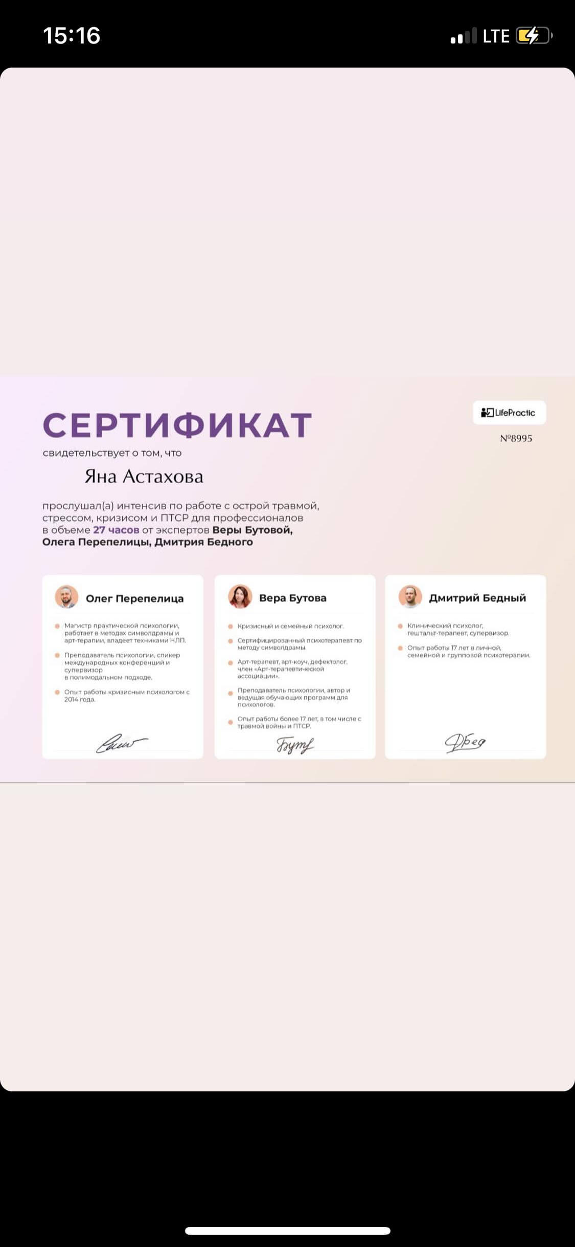Емпатійна, чесна, вмію визнавати помилки, стійка. Багато уваги приділяю тілесному процесу і спираюся на нейронауку в своїй роботі із клієнтами. Дуже уважна до деталей. Завжди намагаюся почути. Чутлива до кількості підримки, яку потрібно надати. Постійно удосконалююсь і пізнаю нове, щоб використовувати в роботі. В роботі з клієнтами одним з найважливіших інструментів вважаю етику та її виконання терапевтом.
