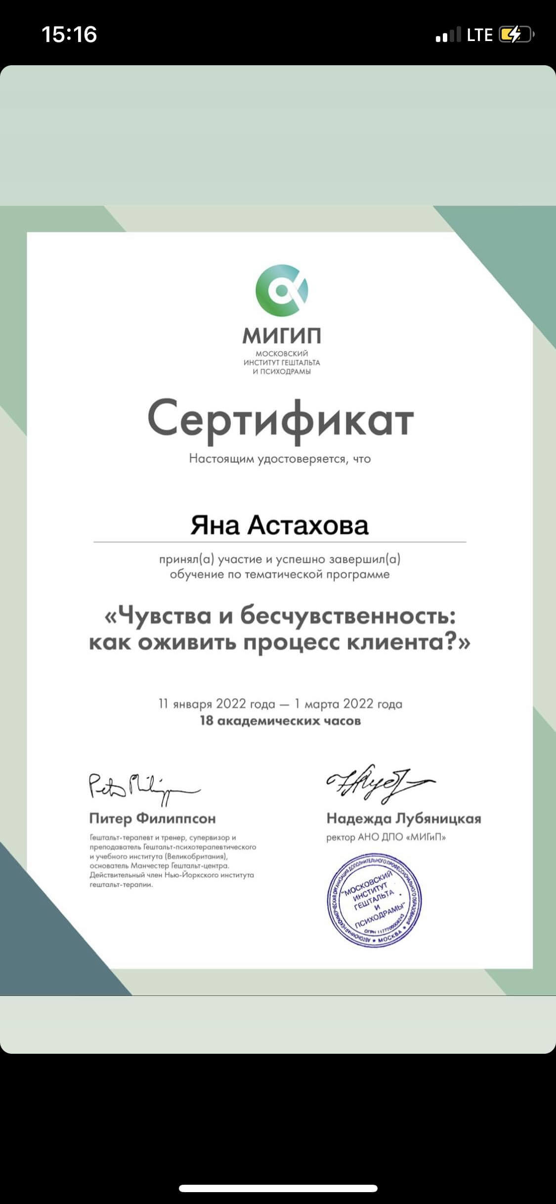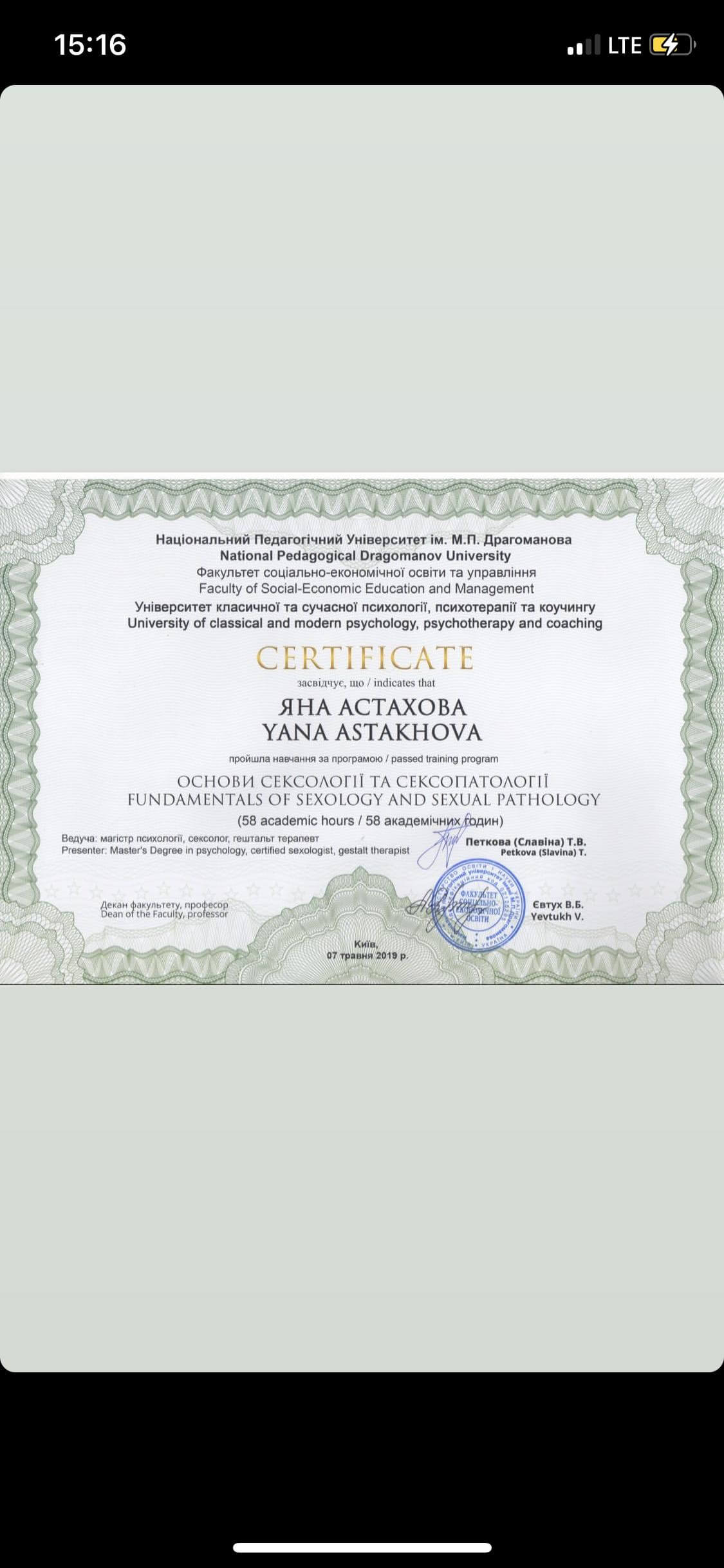 Університет імені Драгоманова, східно-європейська асоціація гіпнотерапевтів і клінічних психологів, університет глибинної і сучасної психології і психотерапії та коучингу, київськиї гештальт університет, всеукраїнська спілка психологів, практикуючих гештальт підхід «український гештальт інститут», МІГІП, life practice