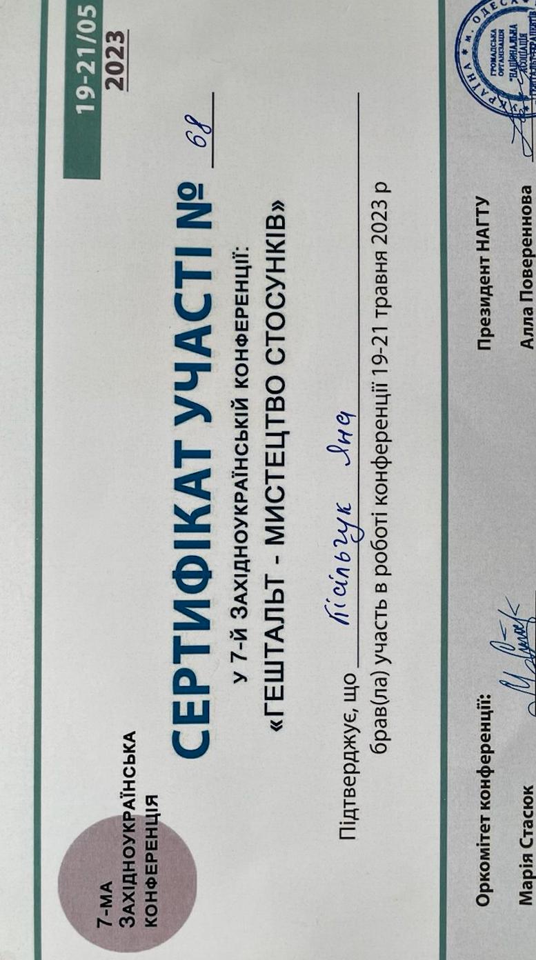 Я — дипломований психолог, гештальт-консультант і гештальт-терапевт в навчанні. Маю понад 200 годин особистої та 200+ годин групової терапії.