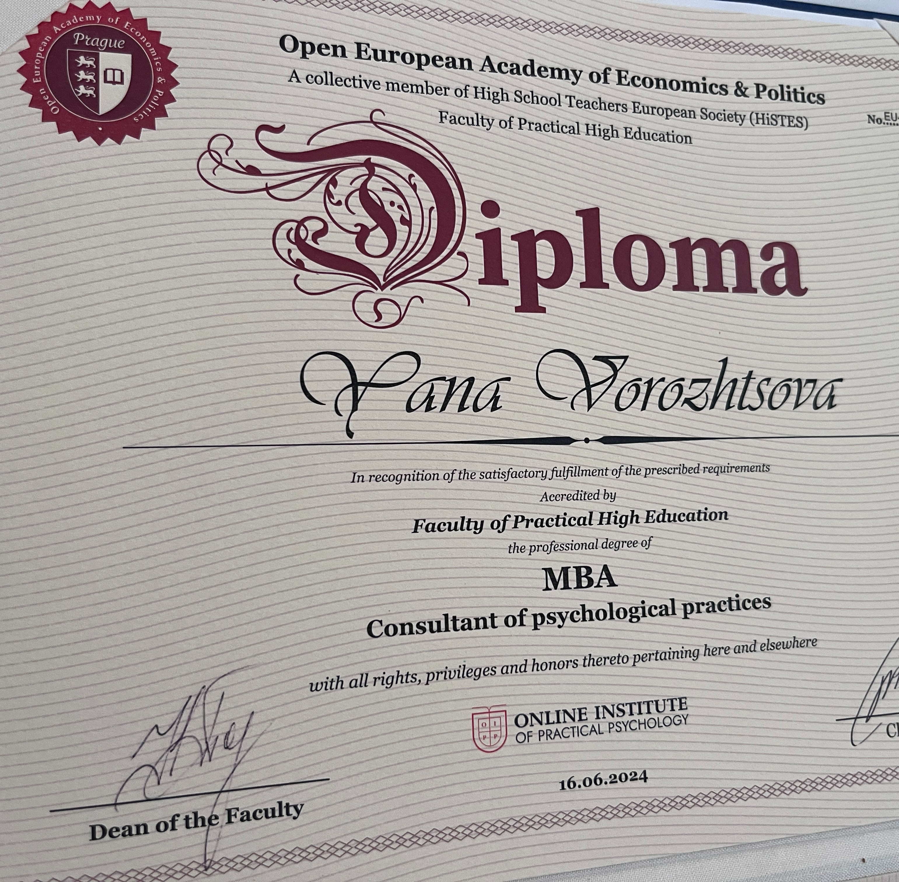 Червона таблетка школи методології мислення Курпатова, КУРС з когнітивно-поведінкової терапії та десятки очних тренінгів на цю тему. Практик енеаграми «Вектор зростання», коучинг Михайла Саїдова, MBA практичної психології та ін. Психотипи особистості