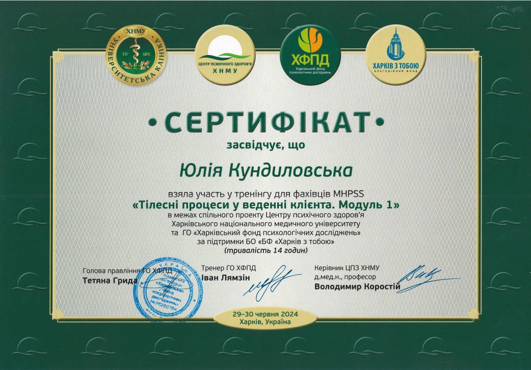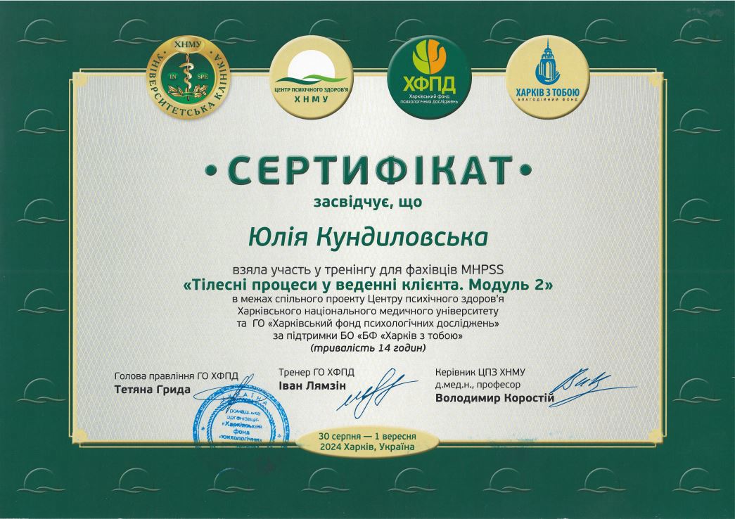 2018-2022 – Національна асоціація гештальт-терапевтів України (НАДТУ), «Теорія та практика гештальт-терапії» (І та ІІ ступені) (2384 години), сертифікована як гештальт-терапевт