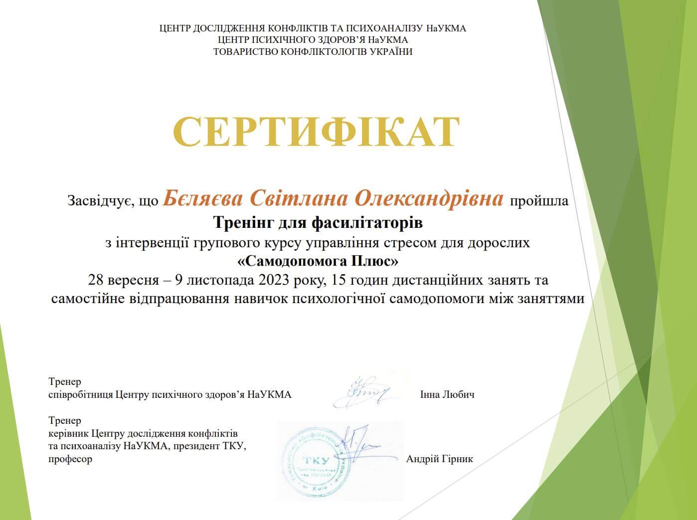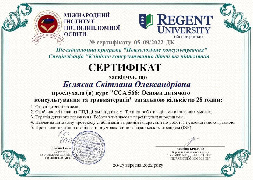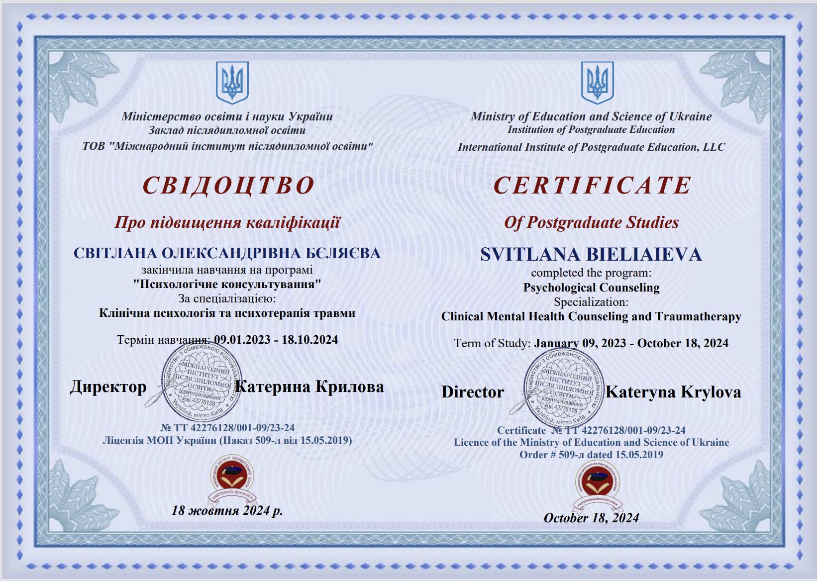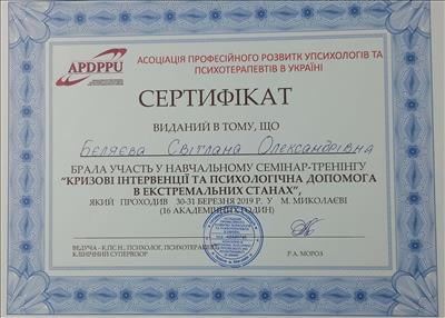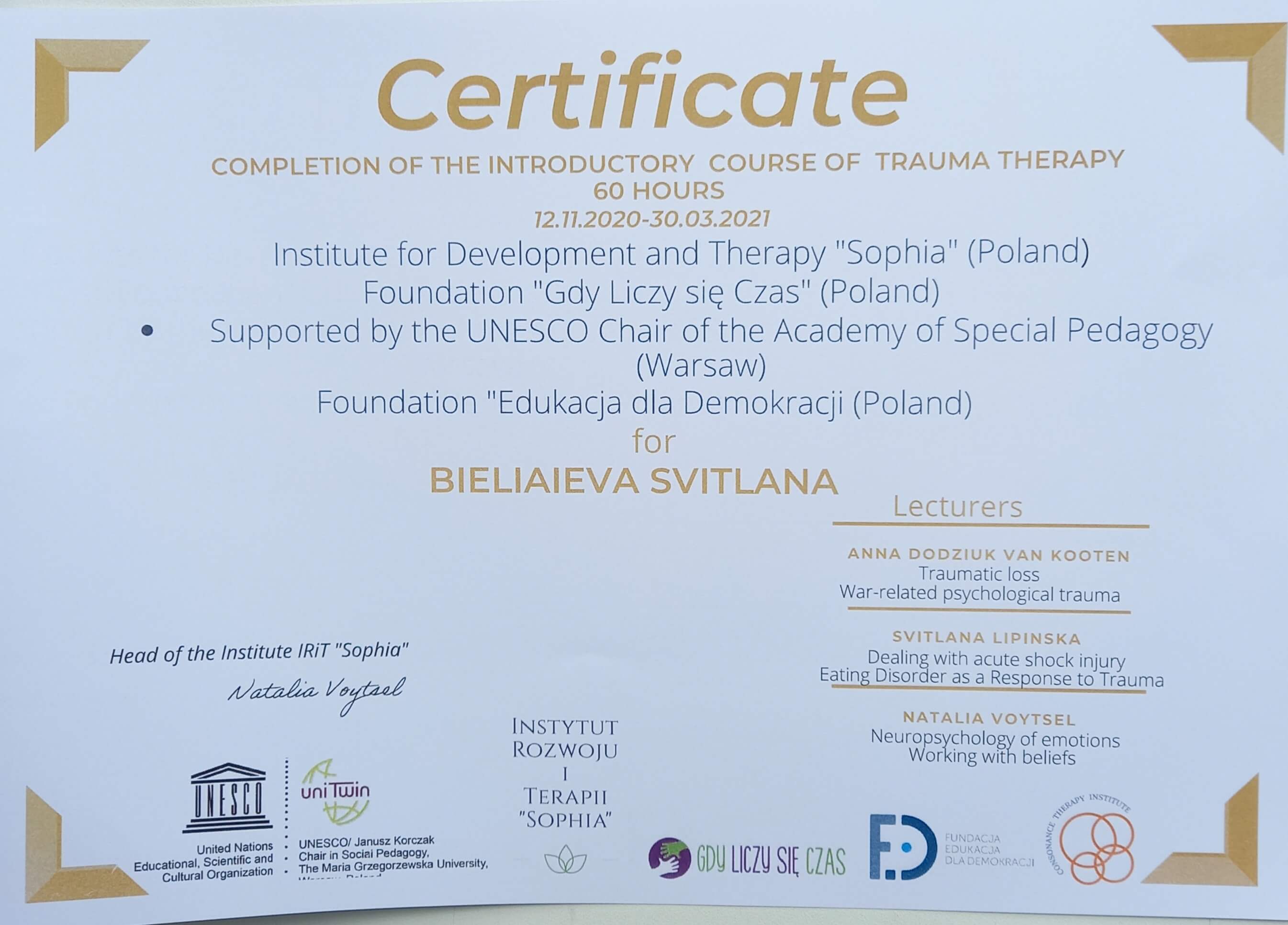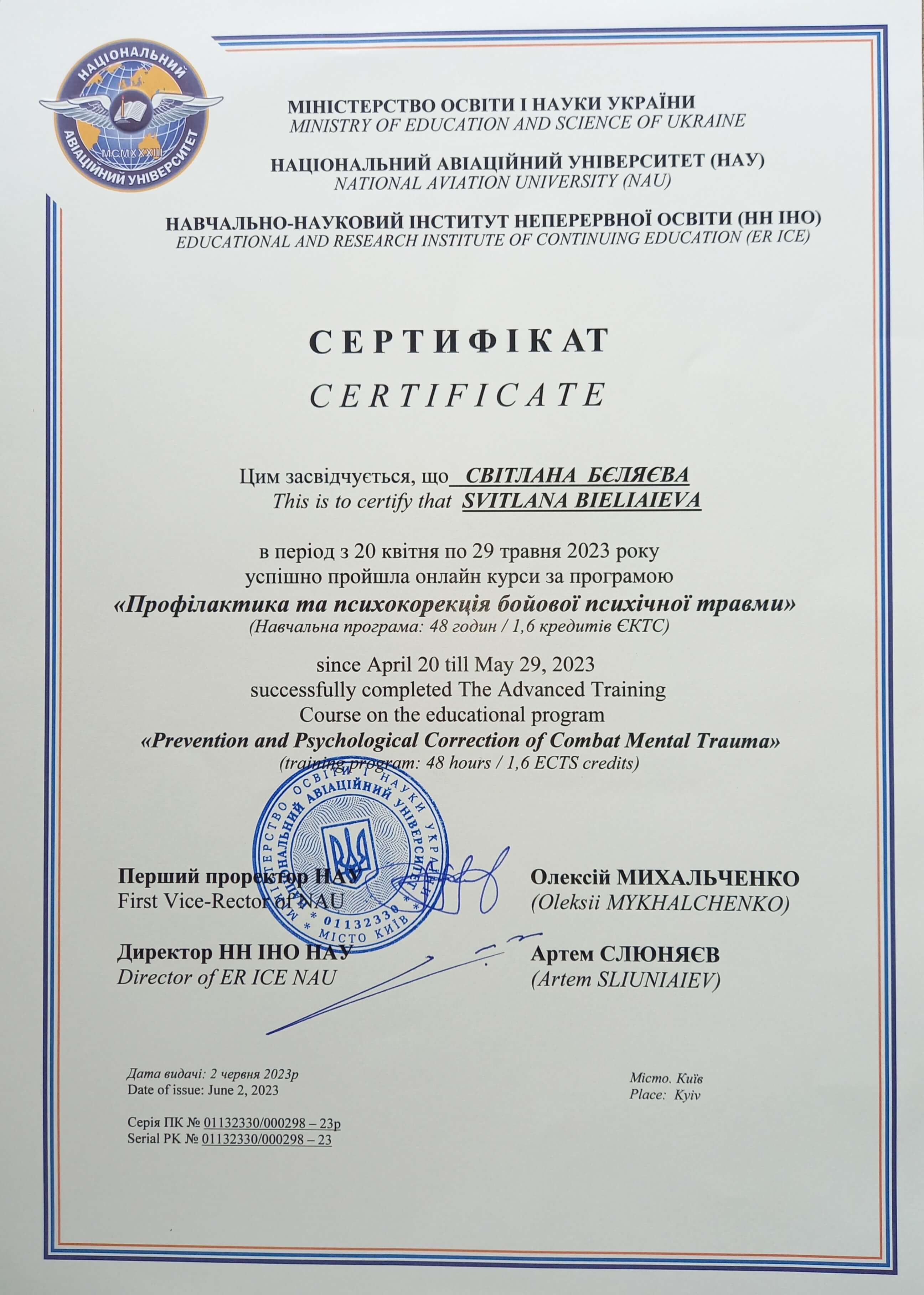 Николаевский государственный педагогический институт (психология, базовое образование); Ассоциация профессионального развития психологов и терапевтов в Украине (основы кризисного консультирования, основы нейропсихологии); ОО "Семейное пространство" (Теория и практика системной семейной психотерапии); Українська спілка психотерапевтів (Кататимно-имагинативная психотерапия. Основная ступень); Институт психологии и здоровья (8 шаговая программа по работе с утратой); Израль. Травмацентр (Телесно ориентированная терапия); Киевский институт рационально-интуитивной терапии "Я" (Психотерапия травматического опыта и личностных расстройств)